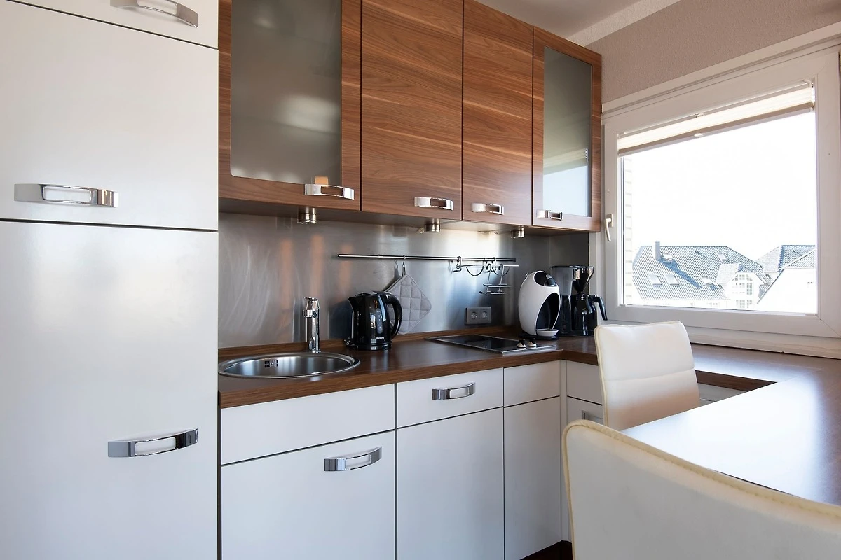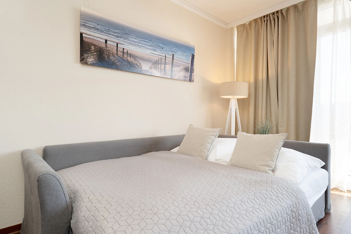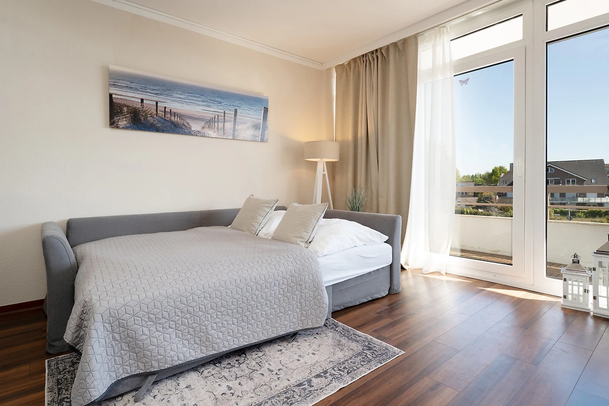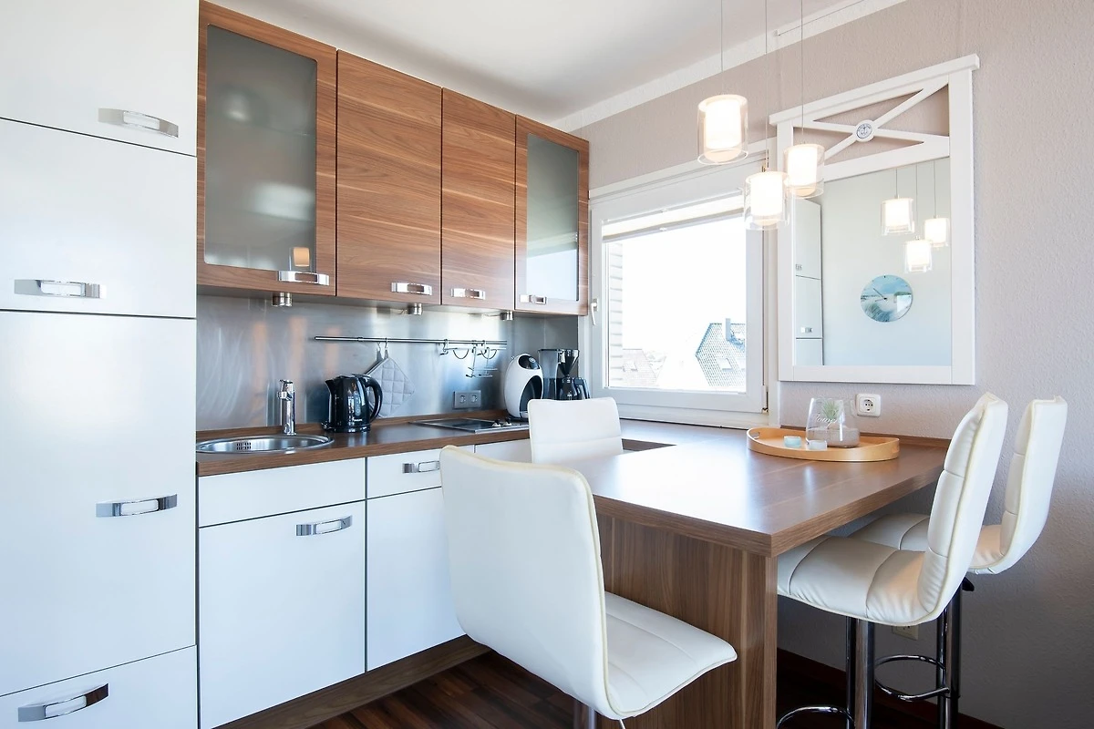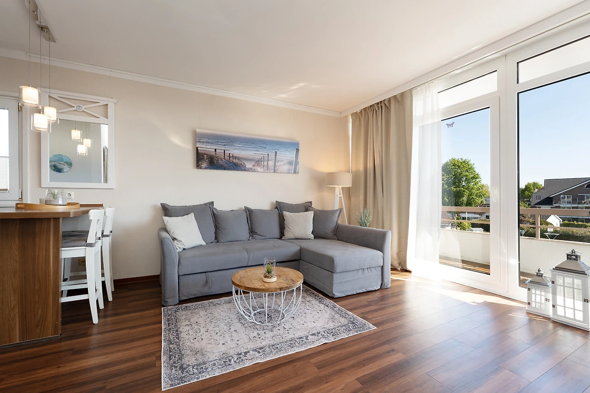 Im Wohnzimmer sind Schlafmöglichkeiten für max. 2 Erwachsene und 2 Kinder vorhanden: Auf einem hochwertigen Schrankbett (140x200 cm) und auf einer bequemen Schlafcouch (150x200 cm). Ein grosser Flachbild-TV, ein DVD-Player und ein Radio/CD-Player sorgen für Unterhaltung, auch an Regentagen. Ein Deckenventilator im Wohnzimmer sorgt auch an Sommertagen für gutes Raumklima. Vom Wohnbereich führt ein direkter Zugang auf den geschmackvoll möblierten Balkon, perfekt um abends lange Strandtage ausklingen zu lassen oder auch den ersten Kaffee am Morgen inklusive einer Prise frischer Ostseeluft zu geniessen! Eine offene, gut ausgestattete Einbauküche mit geselligem Küchentresen gehört ebenso zur hochwertigen Ausstattung wie auch eine Spülmaschine, ein Herd mit Ceranfeld und Abzugshaube, sowie eine Mikrowelle. Das geschmackvolle Duschbad ist in warmen Farben gestaltet und mit modernsten Annehmlichkeiten ausgestattet. Der WLAN-Anschluss ist inklusive.