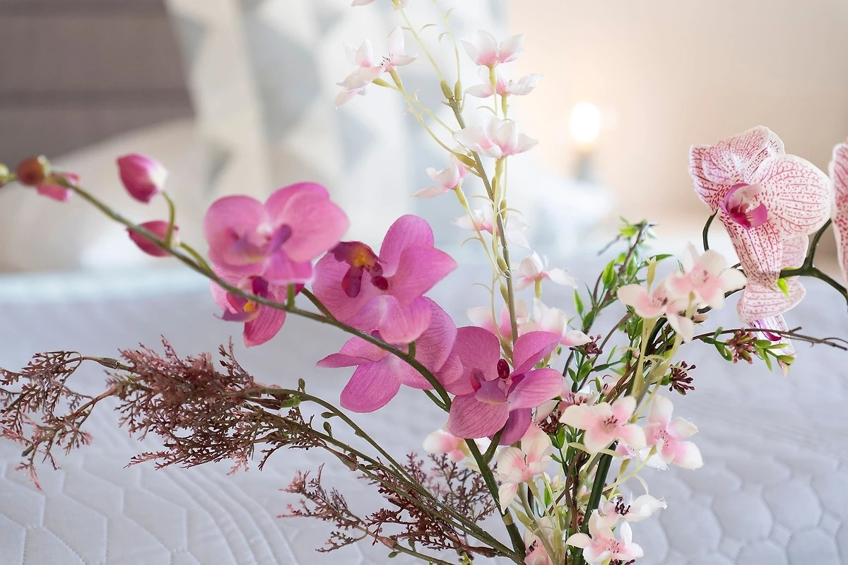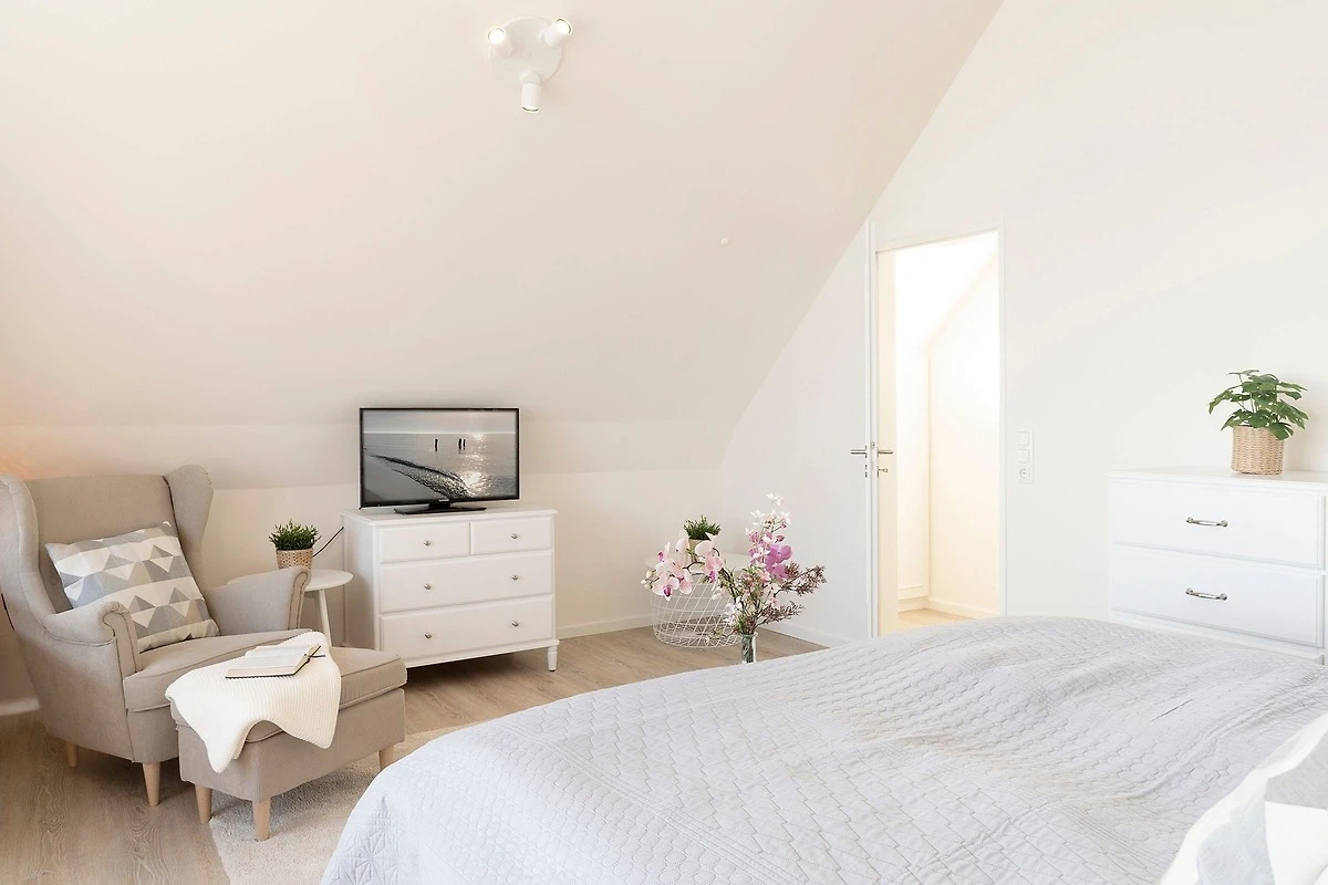 Im Obergeschoss Ihres Feriendomizils liegt ein weiteres Schlafzimmer, komfortabel ausgestattet mit bequemem Boxspring-Doppelbett (180x200 cm). Kleiderschrank und Kommode bieten reichlich Stauraum für Ihre Urlaubsgarderobe und ein 2. TV sorgt für Unterhaltung. Als absolutes Highlight verfügt dieses Schlafzimmer über einen direkten Zugang zu einem weiteren Balkon inklusive Meerblick. Das grosszügige Wohlfühlbad erwartet Sie mit einer Badewanne mit Duschfunktion.