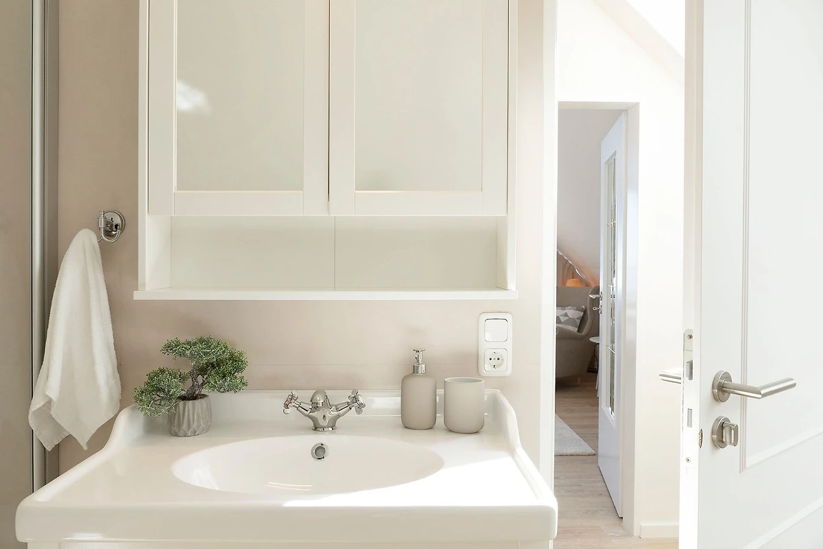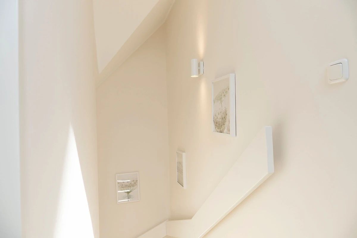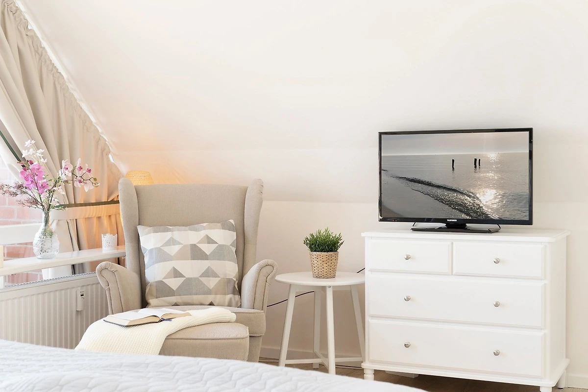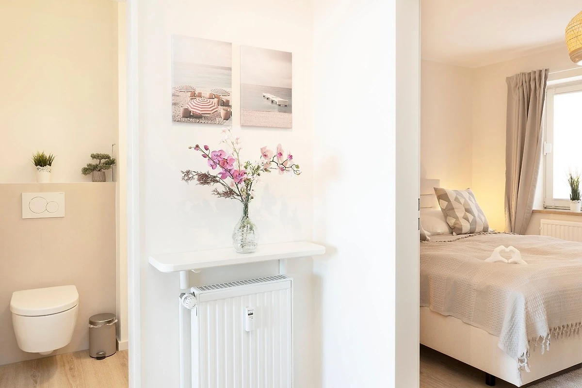 Auf der unteren Wohnebene im 3. Obergeschoss begrüsst Sie ein grosszügiger Eingangsflur mit Garderobe. Von hier aus geht es zu den weiteren Räumen, auch ein Gäste-WC ist vorhanden. Das Herzstück der Wohnung ist der lichtdurchflutete Wohnraum mit einem hochwertigem Ecksofa inkl. Schlaffunktion (für 1 Person), TV, sowie integrierter Essecke und moderner Hochglanz-Küchenzeile, die mit Annehmlichkeiten wie einem 4-Platten-Cerankochfeld, Backofen, Gefrierschrank und Spülmaschine begeistert. Vom Wohnzimmer aus gelangen Sie zudem direkt auf einen überdachten und möblierten Balkon, geschützt lässt es sich hier an lauen Sommerabenden wunderbar verweilen. Das separate Schlafzimmer im unteren Wohnbereich ist mit einem bequemem Boxspring-Doppelbett (180x200 cm) sowie einem grosszügigem Kleiderschrank ausgestattet und liegt angenehm ruhig zum hinteren Bereich des Hauses. Vom Flur aus führt eine Treppe hoch in die obere Ebene.