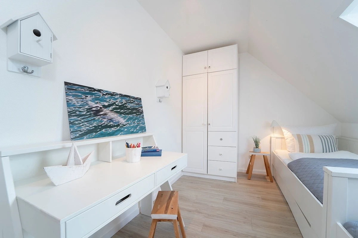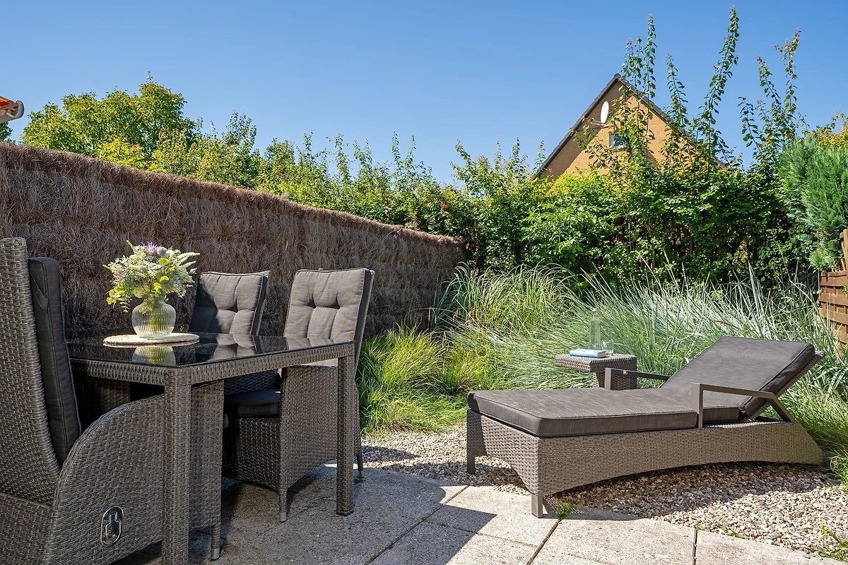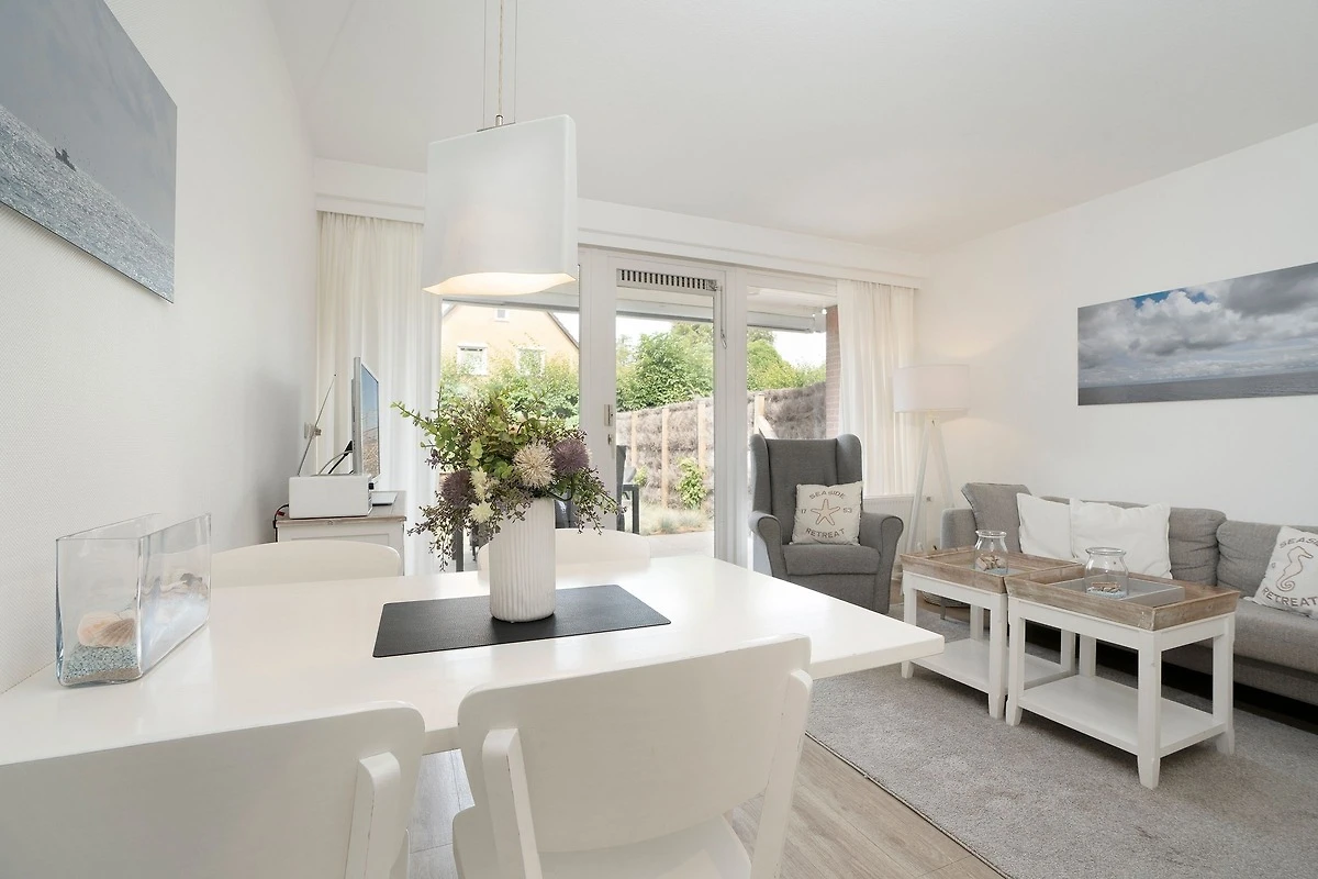 Hell und lichtdurchflutet empfängt Sie der mit viel Liebe zum Detail eingerichtete Wohnbereich. Hier sorgen ein bequemes Sofa und ein Sessel für Komfort und laden zu gemütlichen Fernseh-Abenden ein. Die moderne, voll ausgestattete Küche grenzt offen an den Wohnbereich und verfügt über alle notwendigen Küchenutensilien. Im Obergeschoss erwarten Sie ein Schlafzimmer mit Doppelbett (2x 90x200 cm) und ein Schlafzimmer mit zwei Einzelbetten (je 90x200 cm) und einem Fernseher. Das Duschbad mit Fenster befindet sich im Erdgeschoss und ist neben einem WC mit einer Dusche ausgestattet. Geniessen Sie Ihren Urlaub mit einem guten Buch auf der überdachten, möblierten Terrasse oder verbringen Sie erholsame Stunden am nur ca. 400 m entfernten Strand.