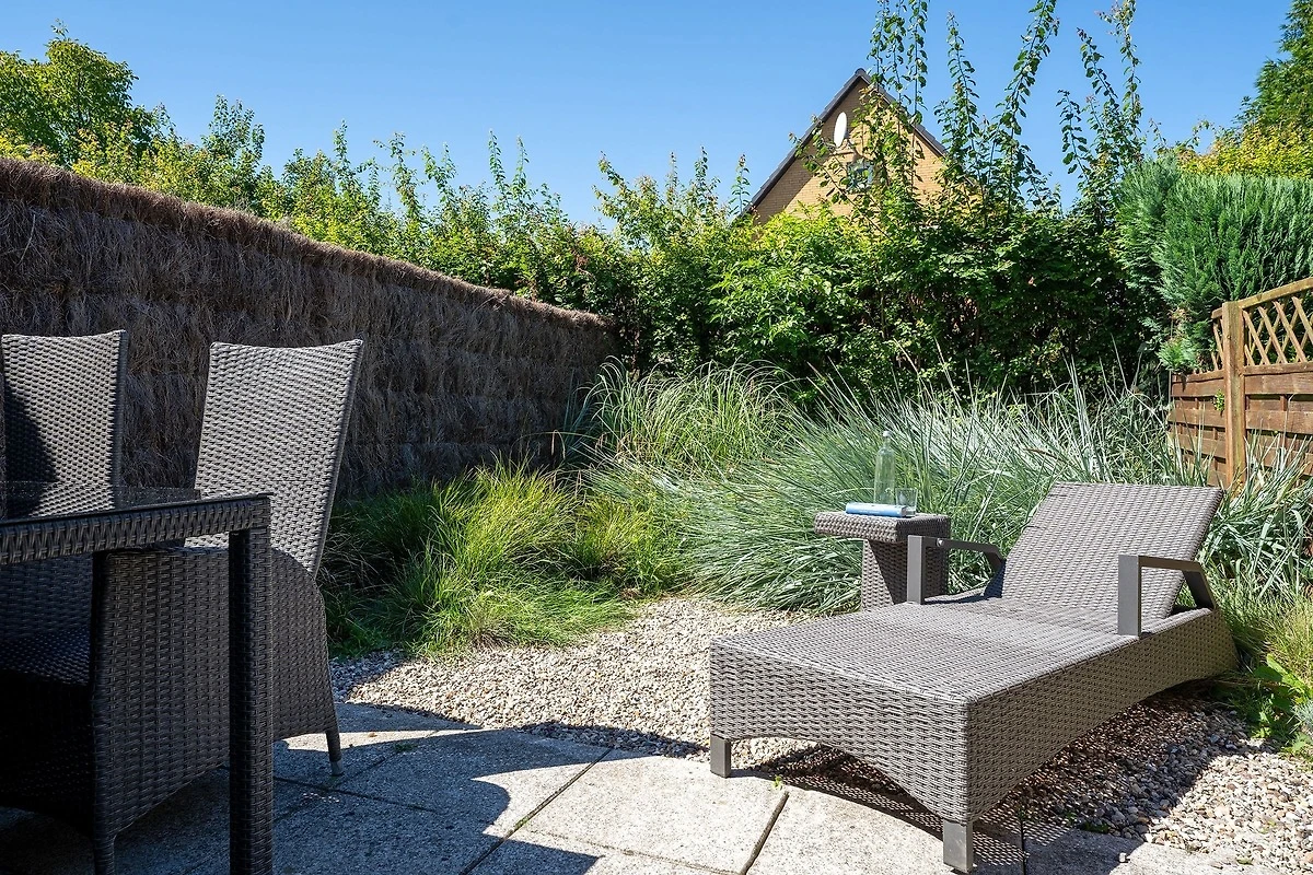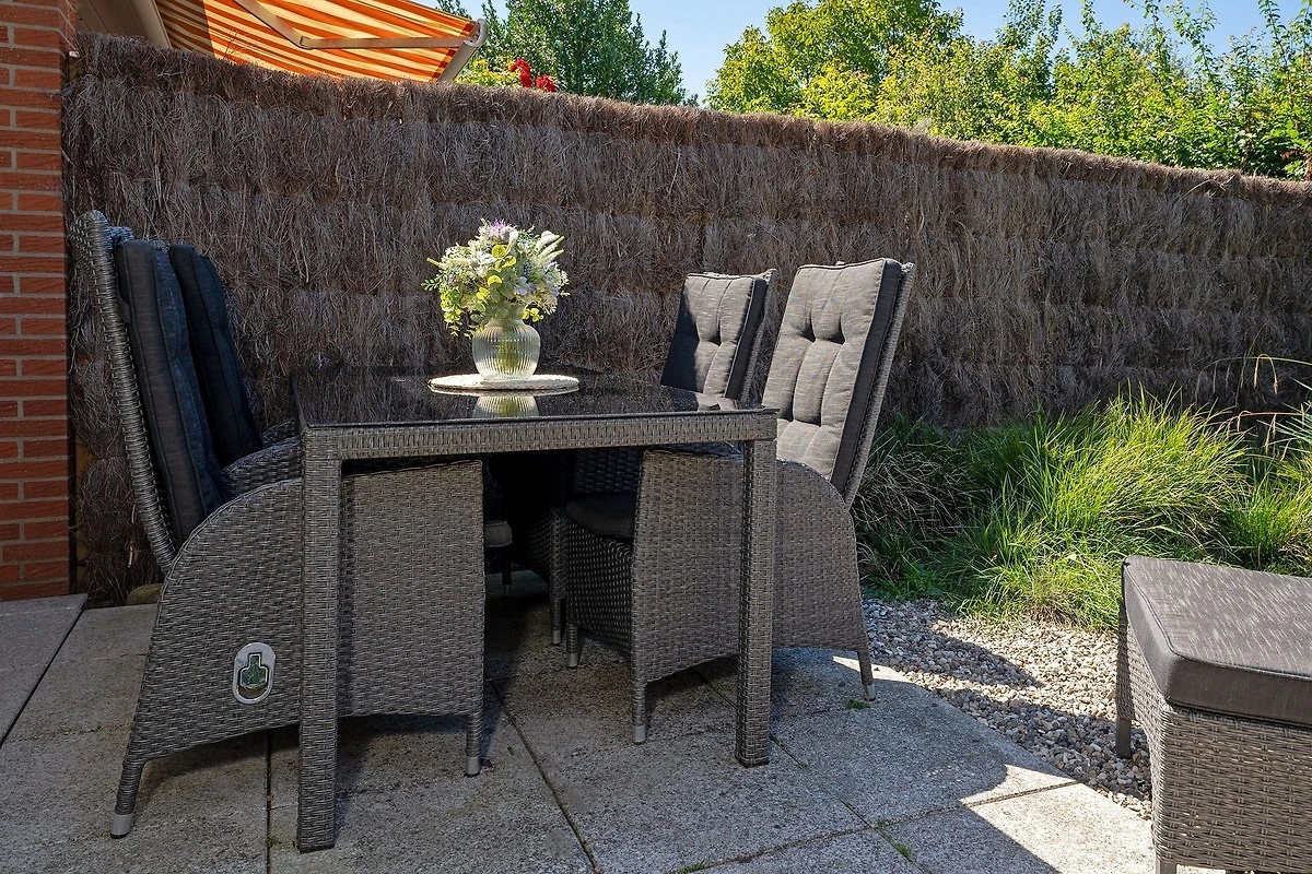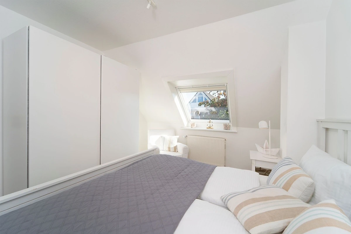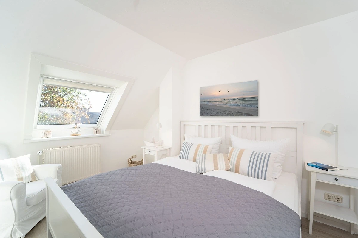 Hell und lichtdurchflutet empfängt Sie der mit viel Liebe zum Detail eingerichtete Wohnbereich. Hier sorgen ein bequemes Sofa und ein Sessel für Komfort und laden zu gemütlichen Fernseh-Abenden ein. Die moderne, voll ausgestattete Küche grenzt offen an den Wohnbereich und verfügt über alle notwendigen Küchenutensilien. Im Obergeschoss erwarten Sie ein Schlafzimmer mit Doppelbett (2x 90x200 cm) und ein Schlafzimmer mit zwei Einzelbetten (je 90x200 cm) und einem Fernseher. Das Duschbad mit Fenster befindet sich im Erdgeschoss und ist neben einem WC mit einer Dusche ausgestattet. Geniessen Sie Ihren Urlaub mit einem guten Buch auf der überdachten, möblierten Terrasse oder verbringen Sie erholsame Stunden am nur ca. 400 m entfernten Strand.