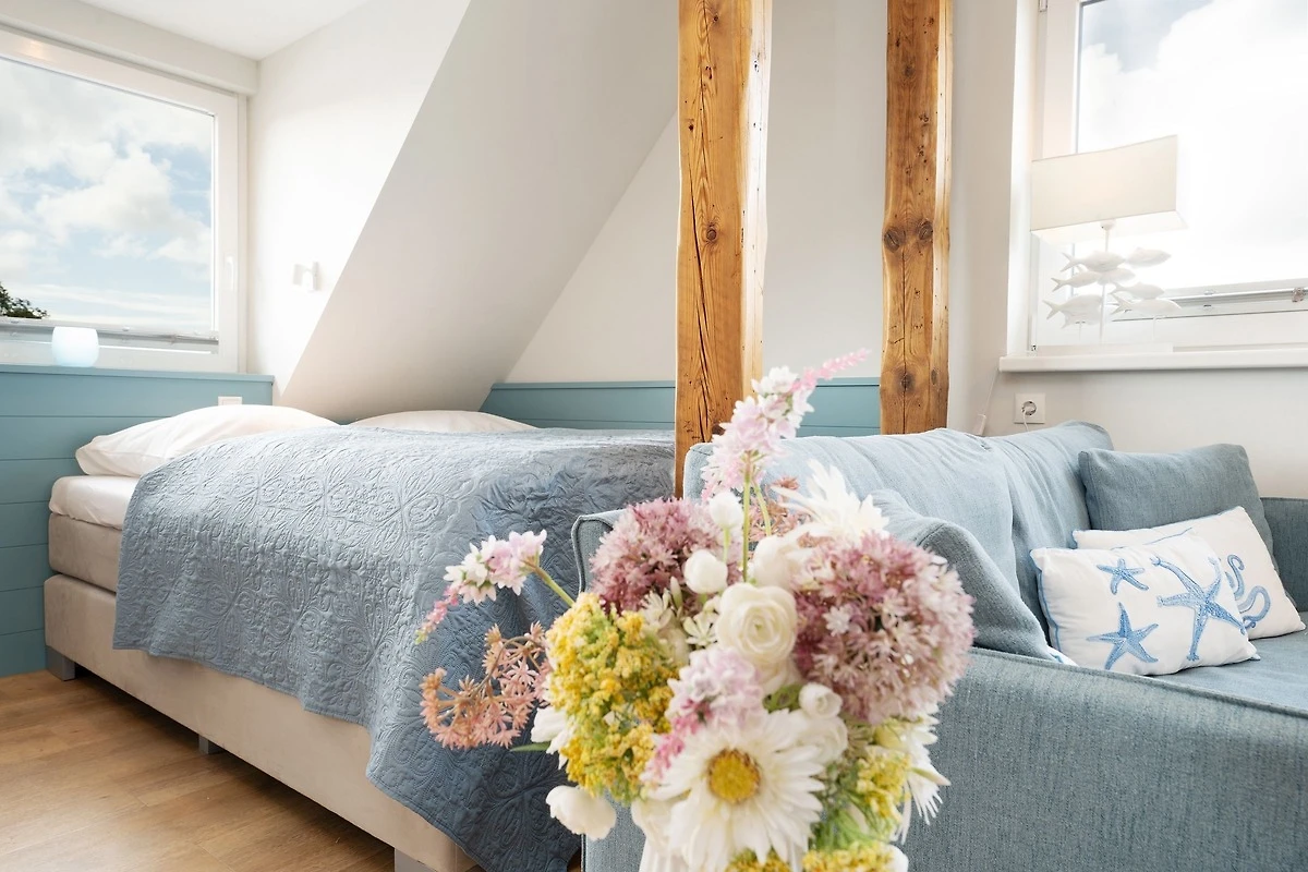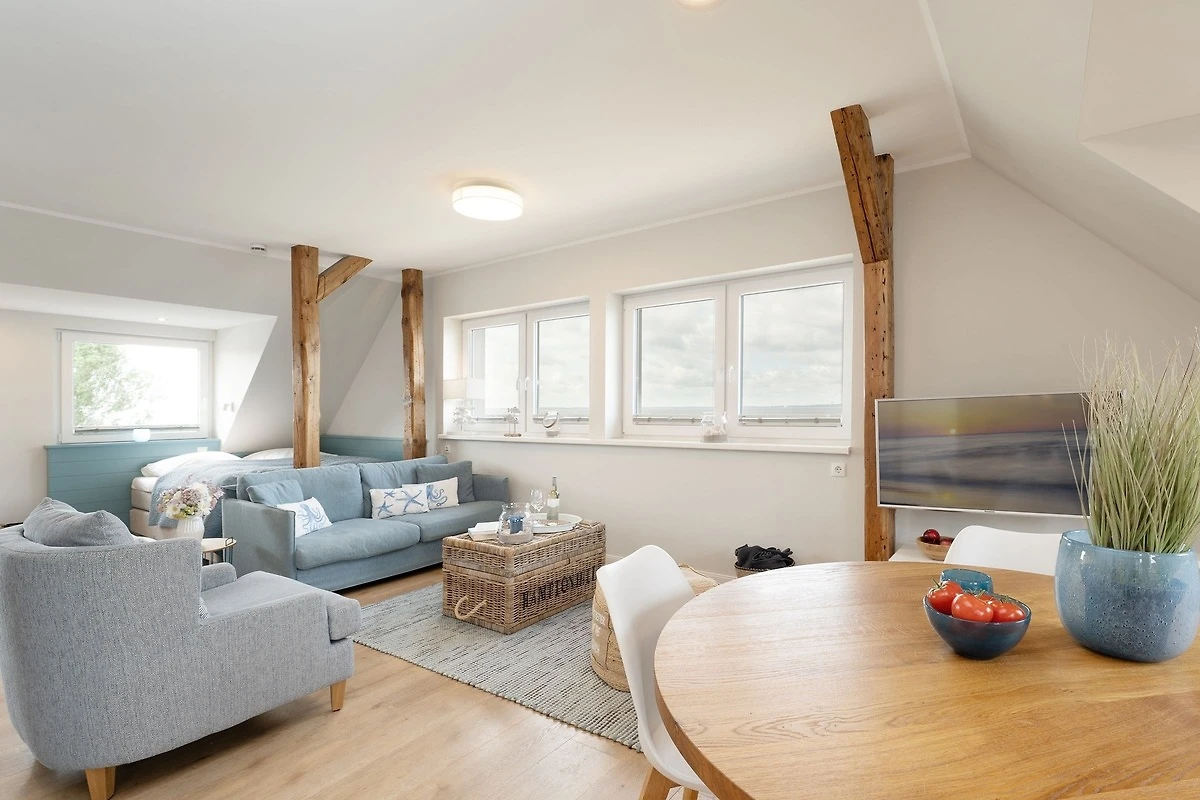 Modern und maritim eingerichtete 2-Zimmer-Ferienwohnung im 1. Stock mit einer Grösse von ca. 72 m² für bis zu 4 Personen in erster Reihe der Promenade.