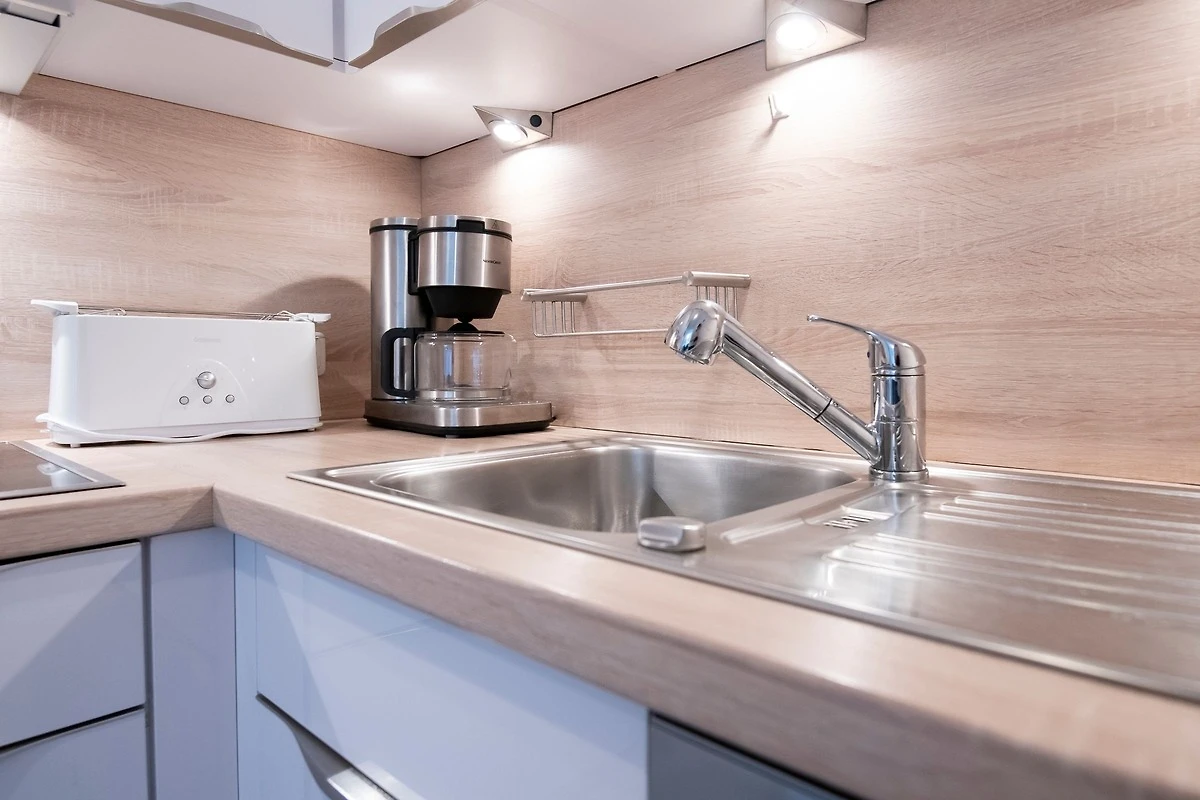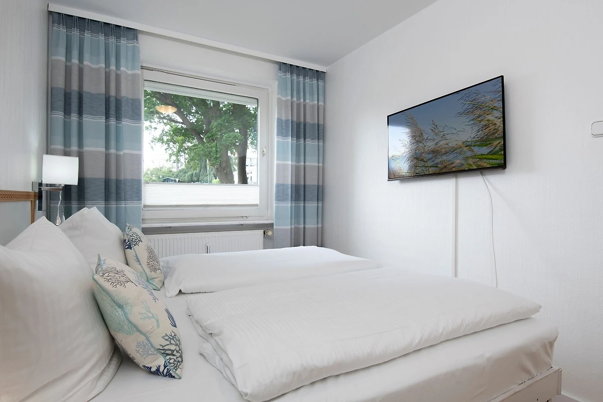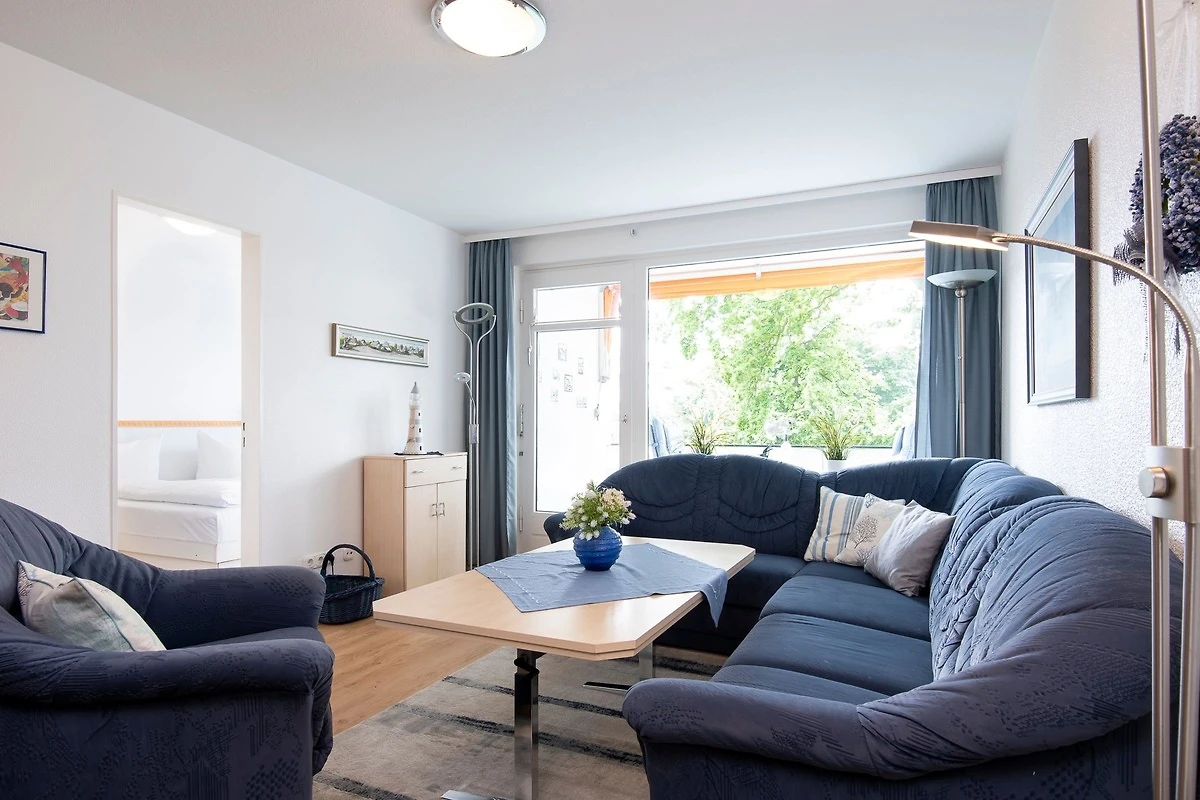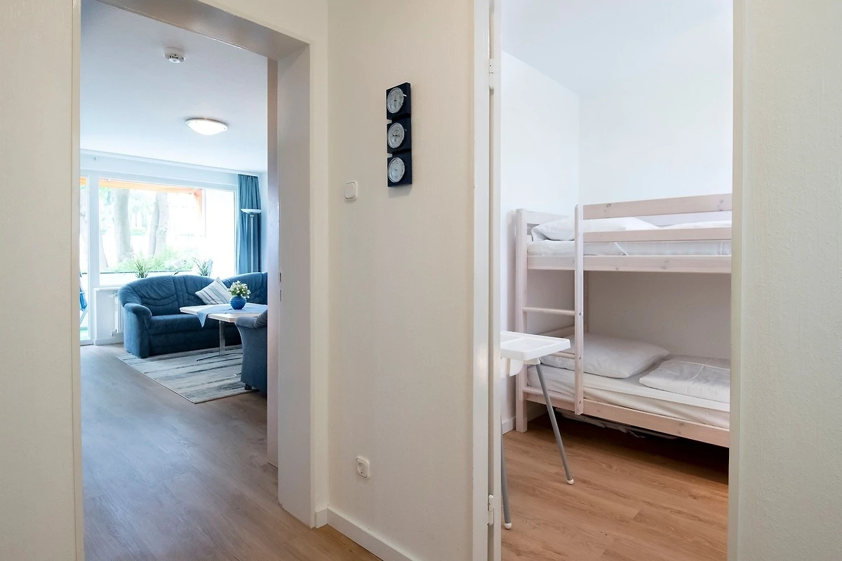 Lichtdurchflutet und hell begrüsst Sie der Wohnraum mit integriertem Essbereich. Eine komfortable Sofaecke und ein Flachbild-TV sorgen nach langen Strandspaziergängen für Entspannung. Über einen kostenlosen WLAN-Anschluss bleiben Sie auch im Urlaub für Ihre Lieben erreichbar. Vom Wohnzimmer führt ein direkter Zugang auf den möblierten Balkon mit seitlichem Blick Richtung Ostsee, eine Markise schützt hier an Sommertagen vor zu starker Sonne. In der kleinen separaten Küche (offene Tür) sind von der Mikrowelle, über den Backofen und den 4-Plattenceranherd diverse Alltagshelfer vorhanden und die Spülmaschine erledigt den Abwasch. Das grössere der beiden Schlafzimmer ist mit einem Doppelbett (2x90x190cm), das zweite Schlafzimmer ist mit einem Etagenbett (je 90x200cm) ausgestattet. In beiden Schlafräumen sorgen Aussenjalousien für angenehme Verdunklung und erholsamen Schlaf. Das geschmackvolle Designbad sorgt mit Wohlfühlausstattung wie Dusche, WC und Waschtisch mit Schminkspiegel gleich morgens für gute Laune.