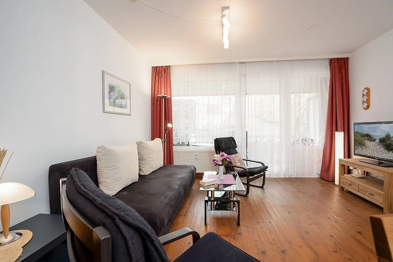 Machen Sie es sich in der komfortablen Nichtraucher-Wohnung in der 1. Etage des Strandhotels Kellenhusen gemütlich: Die bequeme Couch im hellen Wohnbereich kann bei Bedarf in eine weitere Schlafmöglichkeit (Liegefläche 150x200 cm) verwandelt werden. Von hier aus gelangen Sie auf den überdachten, möblierten Balkon mit seitlichem Meerblick. Nehmen Sie Platz und lassen Sie die Seele baumeln oder den Tag bei einem guten Glas Wein ausklingen.