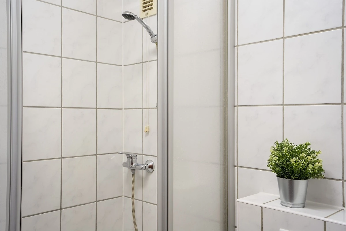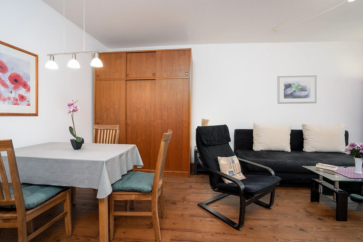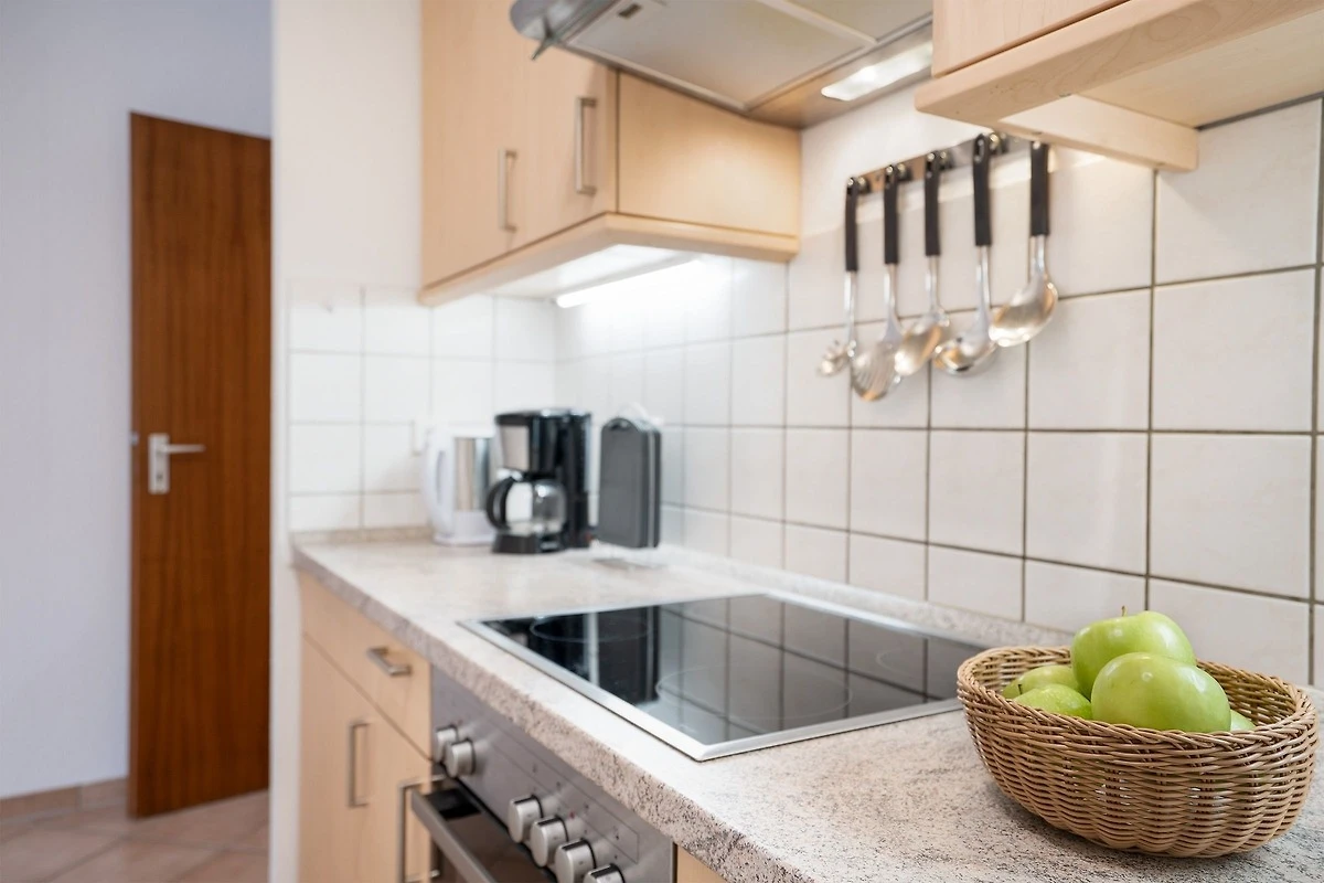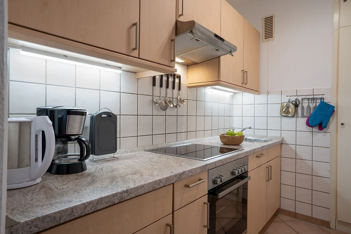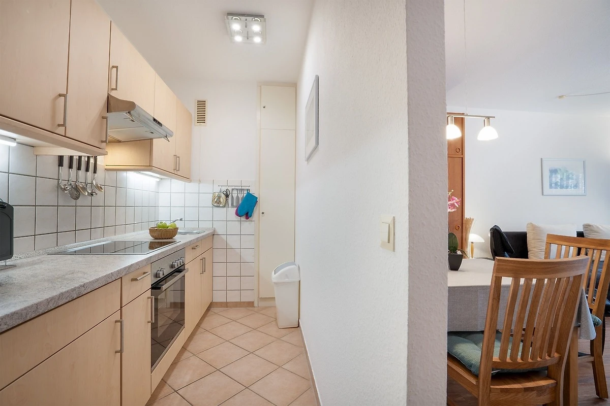 Die räumlich abgetrennte Küche ist mit nahezu allen Annehmlichkeiten ausgestattet. Der Backofen mit integrierter Mikrowelle ist sehr praktisch für das unkomplizierte Zubereiten von Mahlzeiten. Diese können am Esstisch im Wohnbereich gemeinsam eingenommen werden. Geruhsame Nächte verbringen Sie im separaten Schlafzimmer, das mit einem Doppelbett (2x 90x200 cm) ausgestattet ist. Das helle Duschbad rundet das Angebot dieser Ferienwohnung ab. Der WLAN-Anschluss ist inklusive.