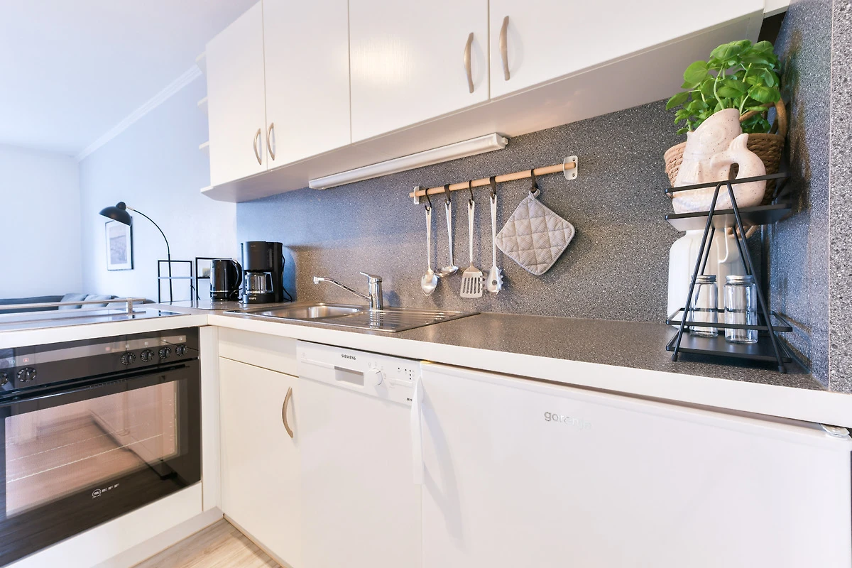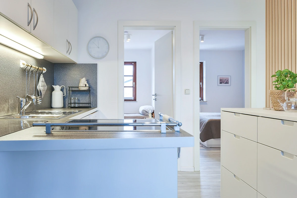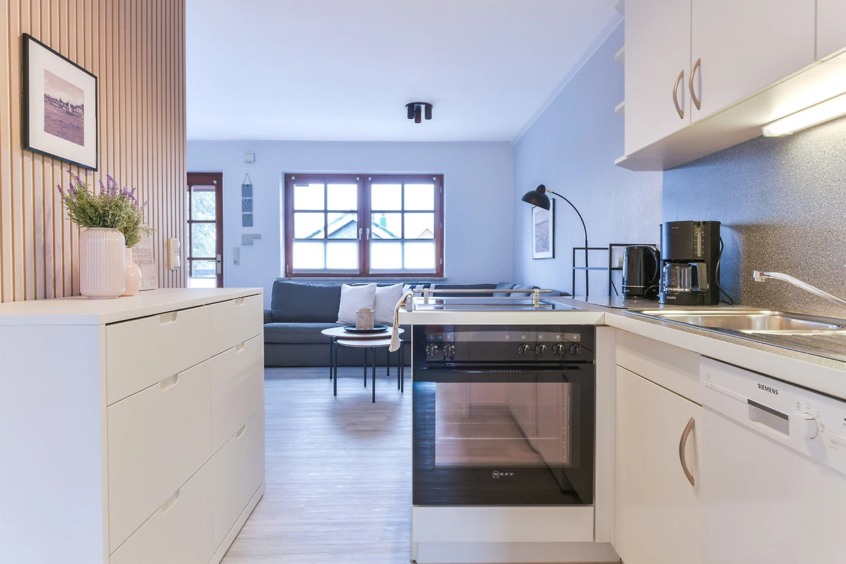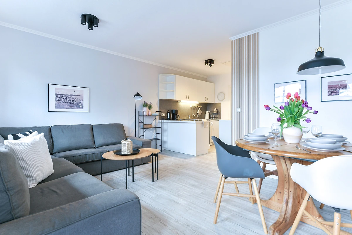 Geniessen Sie die schönsten Tage des Jahres in dieser strandnahen und trotzdem ruhig gelegenen Ferienwohnung. Im gemütlichen Wohnzimmer mit bequemer Sofalandschaft und Essecke werden Sie sich sofort wohl fühlen. Ein TV-Gerät sorgt für Unterhaltung. Bei schönem Wetter lockt sicher der möblierte Südbalkon, von dem Sie einen schönen Blick ins Grüne haben. Geniessen Sie hier die Sonnenstunden oder planen Sie Ihre Ausflüge entlang der Ostseeküste. Die zum Wohnbereich hin offene, gut ausgestattete Küche verfügt über eine Spülmaschine. Zaubern Sie hier in Ruhe Ihre Lieblingsspeisen. Angenehme Nachtruhe finden Sie in den beiden Schlafräumen: Ein Zimmer ist mit einem Doppelbett (180x200 cm) ausgestattet, in dem anderen Zimmer stehen 2 Einzelbetten (90x200 cm und 90x170 cm). Beide Räume verfügen über einen Kleiderschrank und können mit Rollos verdunkelt werden. Das helle Duschbad verspricht einen guten Start in den Tag.