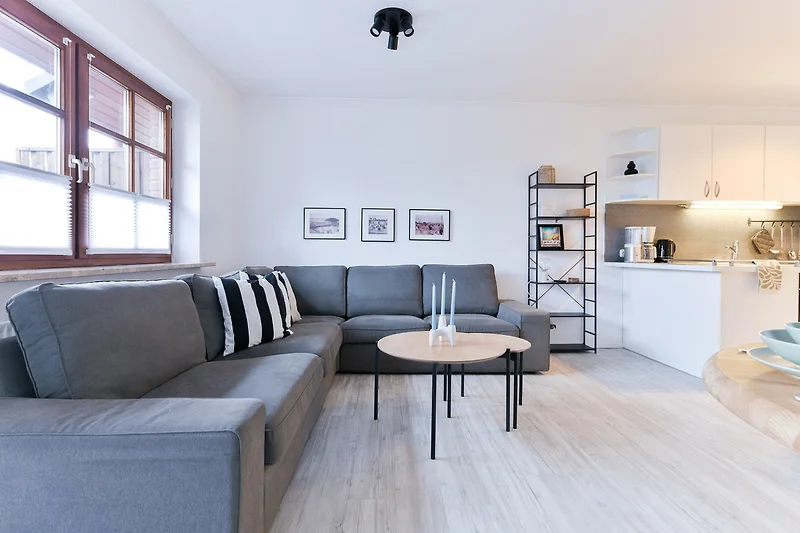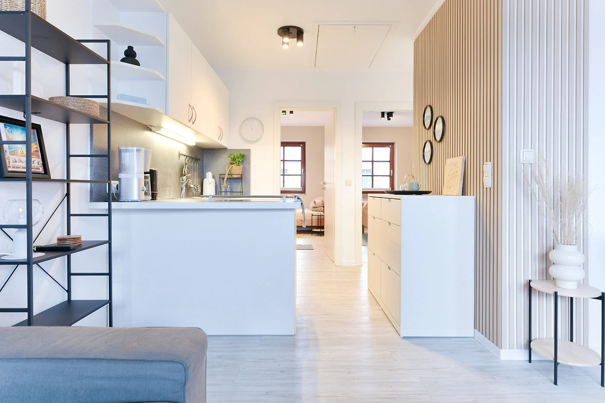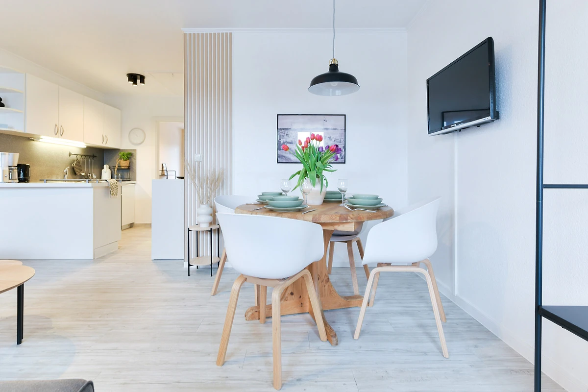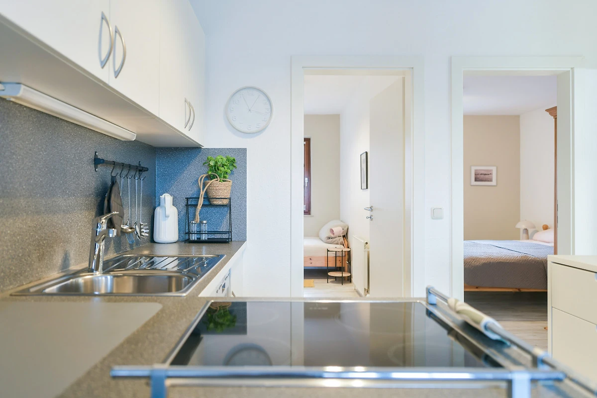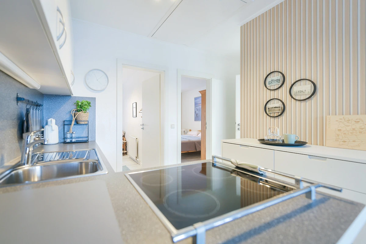Kommen Sie rein – Sie werden sich sofort wohl fühlen. Das helle Wohnzimmer punktet mit seiner grossen, gemütlichen Sofalandschaft mit TV-Gerät sowie einer bequemen Essecke. Zum Verweilen lädt natürlich auch der grosszügige möblierte Süd-Balkon ein. Hier können Sie herrlich die Sonnenstunden geniessen – wie wäre es abends dazu mit einem Glas Wein? Die moderne Küche mit Geschirrspüler ist in den Wohnbereich integriert. Ihre gute Ausstattung zaubert sicher jedem Hobby-Koch ein zufriedenes Lächeln ins Gesicht. Angenehme Nachtruhe finden Sie in den beiden Schlafräumen: Ein Zimmer verfügt über ein Doppelbett (180x200 cm) und eins über zwei getrennt stehende Betten (90x200 cm und 170x200 cm). In beiden befindet sich jeweils ein Kleiderschrank für Ihre Urlaubsgarderobe. Das hell geflieste Duschbad lässt Sie gut in den neuen Urlaubstag starten.
