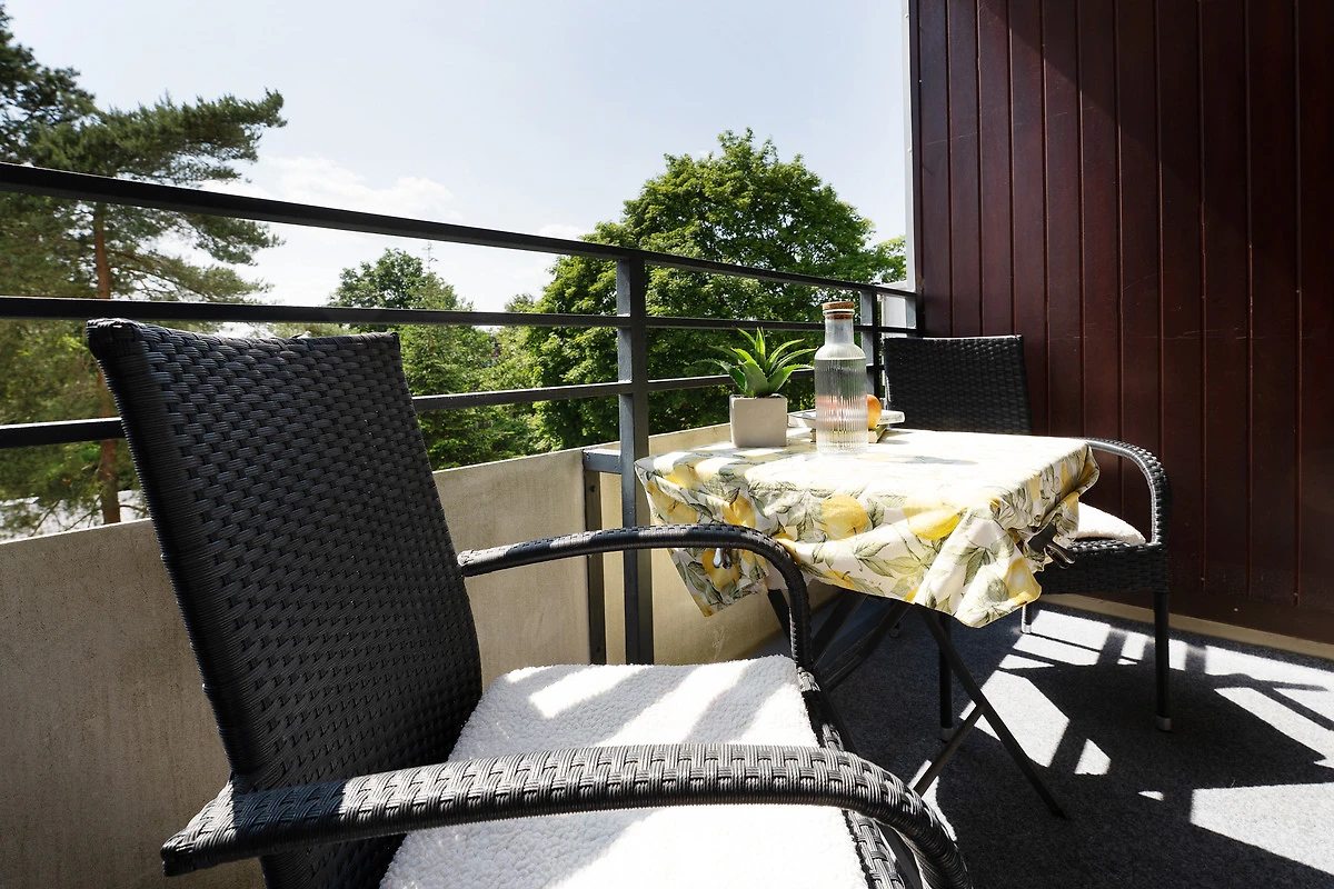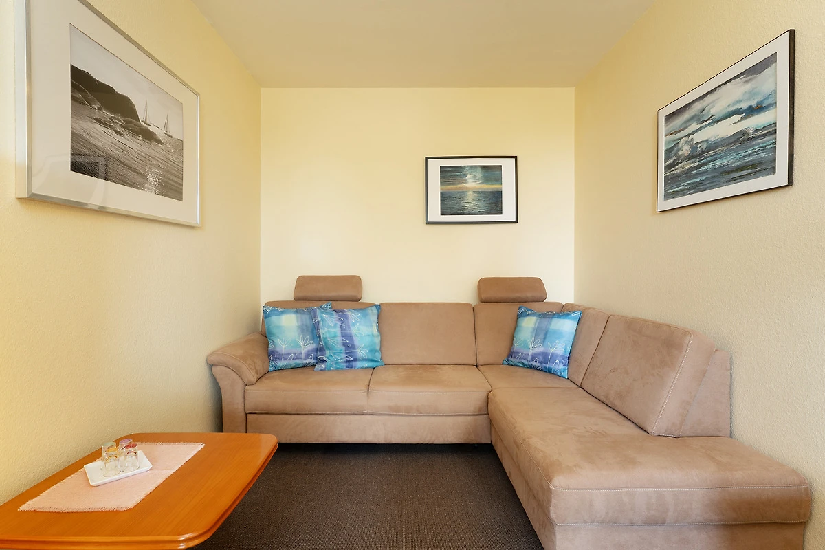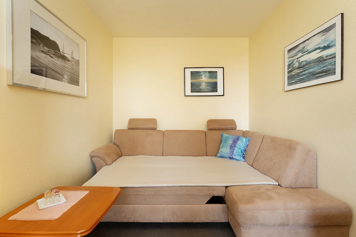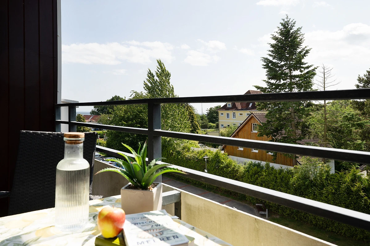 Diese gemütliche Ferienunterkunft befindet sich im Haus Meeresblick im Leuchtturmweg 3 – und ist nur rund 100 Meter vom Ostseestrand entfernt. Der Wohn-/Schlafbereich empfängt Sie mit einer Essecke am Fenster, hier haben Sie auch Zutritt auf den möblierten Balkon mit südlicher Lage. Im hinteren Bereich steht eine grosse Couch, die sich bei Bedarf in ein Doppelbett (2x 80x200 cm) verwandeln lässt sowie ein TV-Gerät. Die kleine, offene Küche ist funktional ausgestattet. Und im separaten Schlafzimmer befinden sich ein Doppelbett (2x 90x200 cm) sowie ein grosser Kleiderschrank. Das gepflegte Duschbad ist hell gefliest.