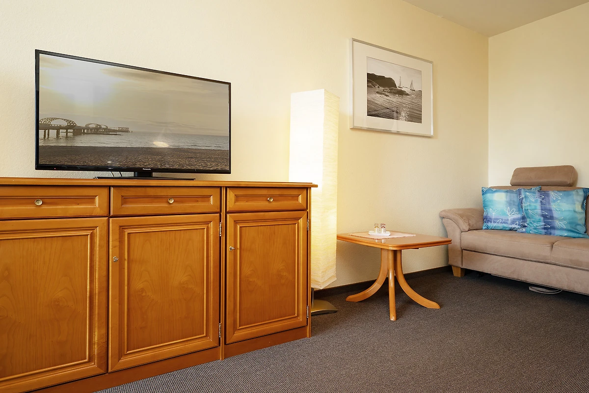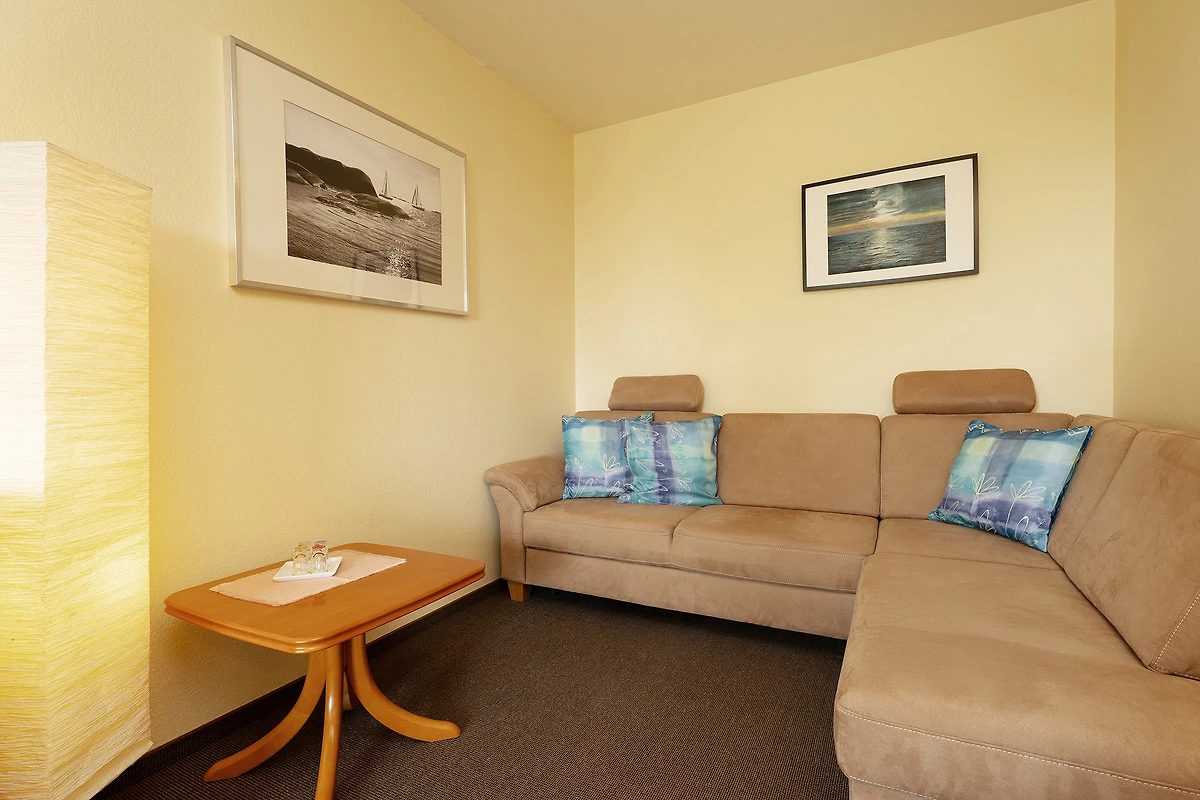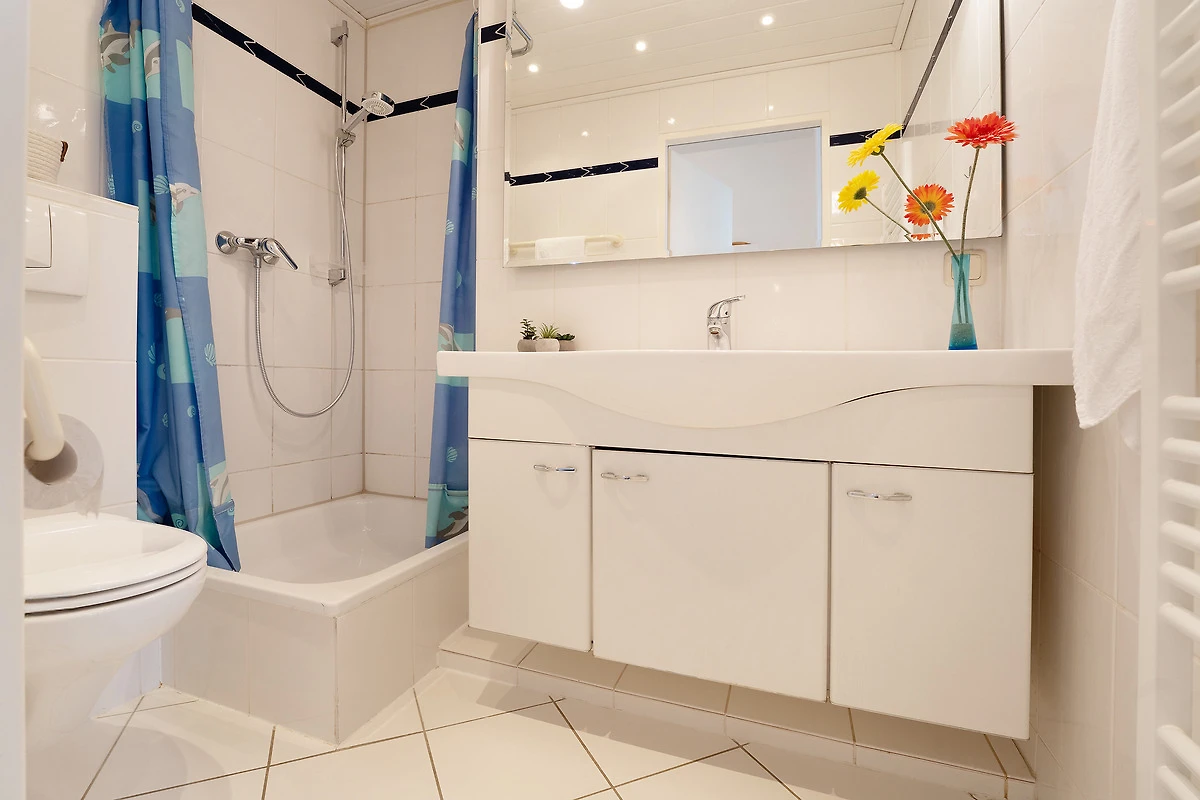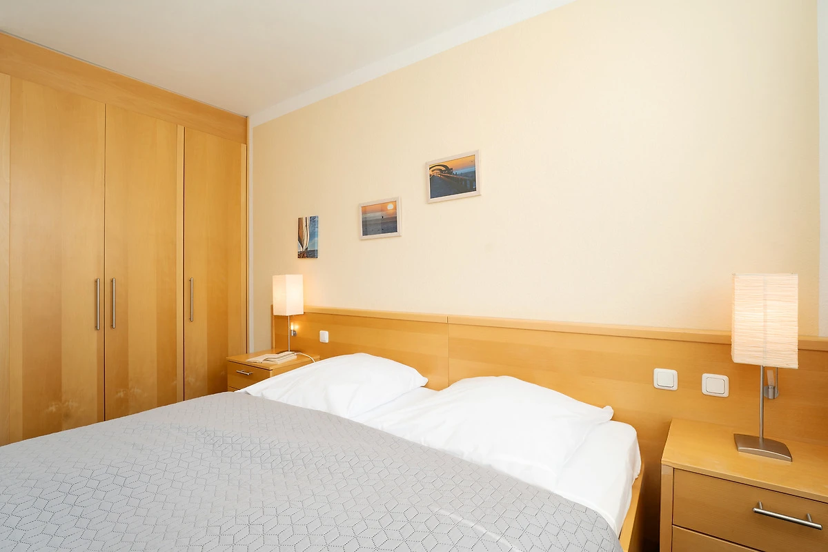 Diese gemütliche Ferienunterkunft befindet sich im Haus Meeresblick im Leuchtturmweg 3 – und ist nur rund 100 Meter vom Ostseestrand entfernt. Der Wohn-/Schlafbereich empfängt Sie mit einer Essecke am Fenster, hier haben Sie auch Zutritt auf den möblierten Balkon mit südlicher Lage. Im hinteren Bereich steht eine grosse Couch, die sich bei Bedarf in ein Doppelbett (2x 80x200 cm) verwandeln lässt sowie ein TV-Gerät. Die kleine, offene Küche ist funktional ausgestattet. Und im separaten Schlafzimmer befinden sich ein Doppelbett (2x 90x200 cm) sowie ein grosser Kleiderschrank. Das gepflegte Duschbad ist hell gefliest.
