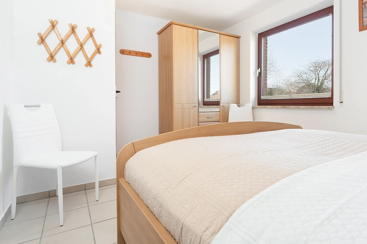 Schlafzimmer: 1 Doppelbett (2x 90x200 cm), Kleiderschrank, Verdunklung durch Plissees und Aussenrollos.