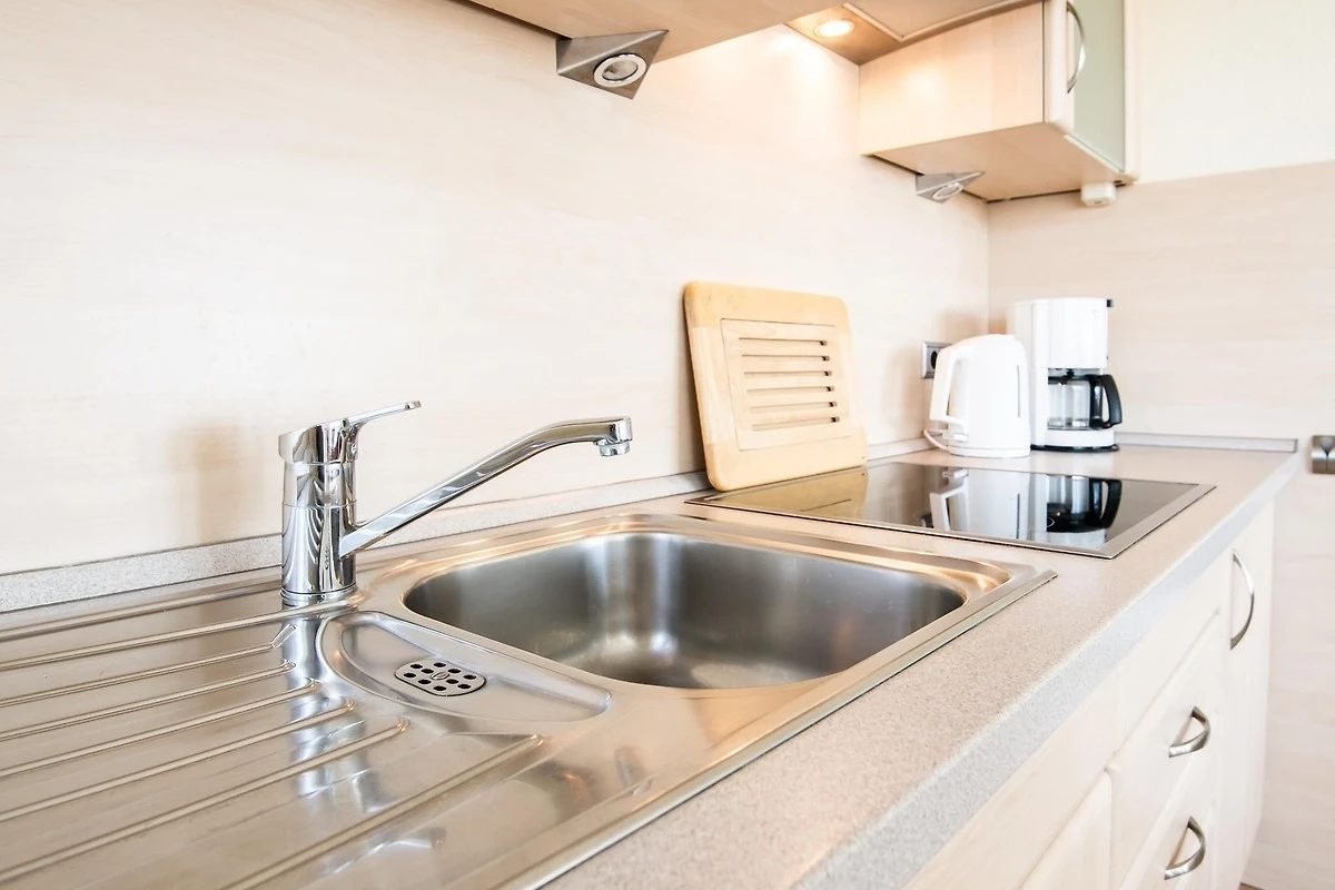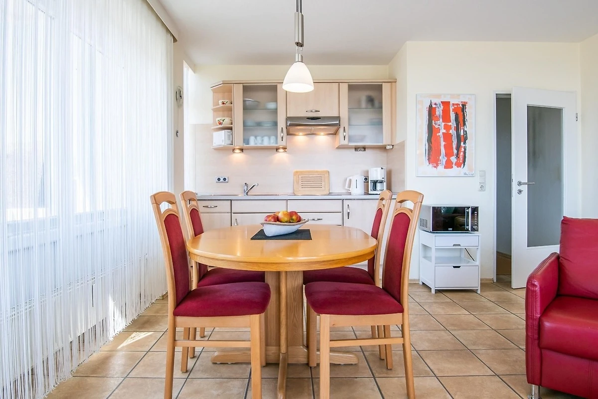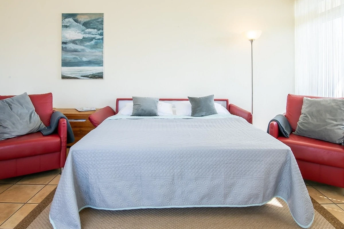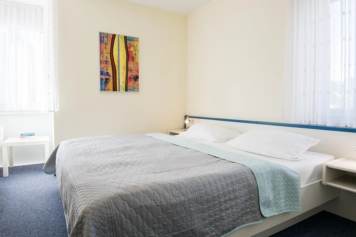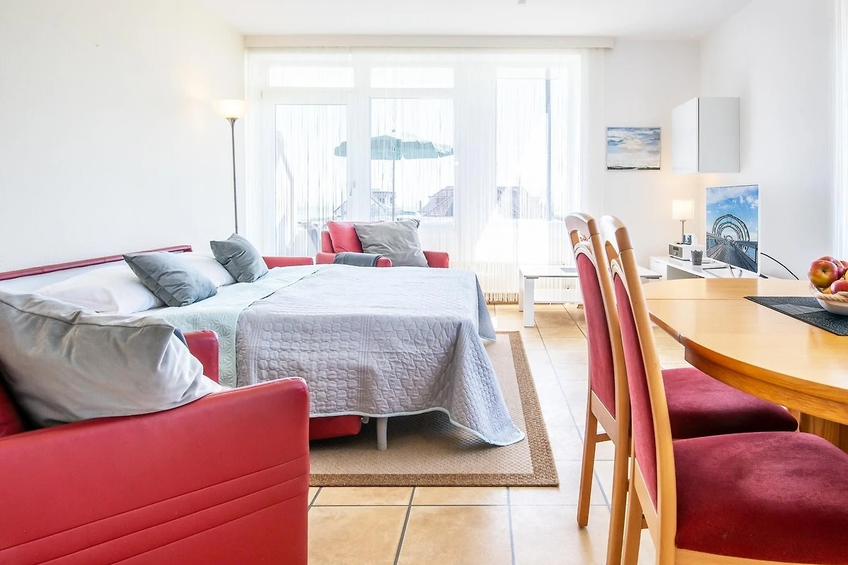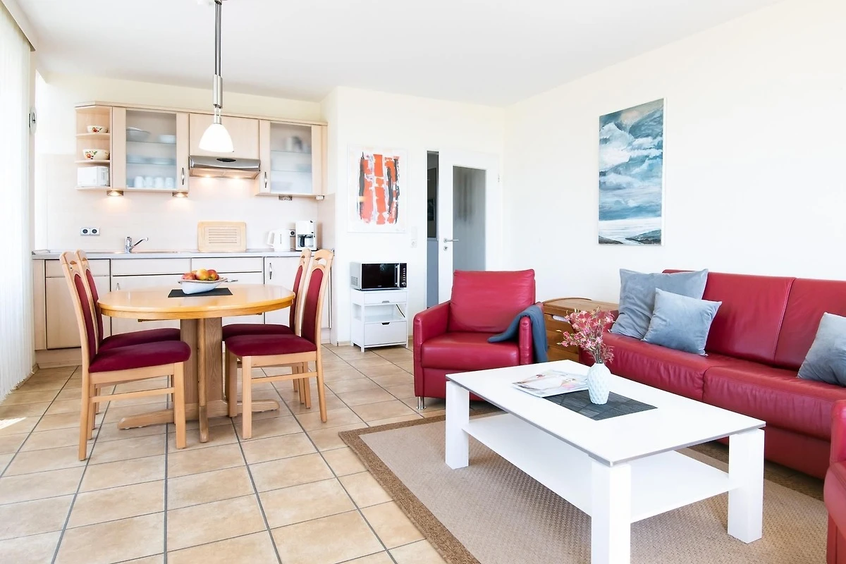 Treten Sie ein in das offen gestaltete Wohn-/Schlafzimmer mit hochwertiger Doppelbettcouch (ca. 180x200 cm), Kabel-TV, CD-Radio und lassen Sie den Alltag hinter sich. Hier finden Sie auch den direktem Zugang auf den sonnenverwöhnten Balkon, auf dem Sie Ihre Urlaubstage mit einem köstlichen Frühstück beginnen können. Die Küche ist mit angrenzender Essecke in den Wohnbereich integriert und bietet Annehmlichkeiten wie 4-Platten-Ceranfeld, Mikrowelle, Geschirrspüler, sowie Kühlschrank mit Gefrierfach. Das Schlafzimmer garantiert mit bequemem Doppelbett (ca. 180x200 cm) maximale Erholung nach ereignisreichen Urlaubstagen. Das tageslichthelle Badezimmer sorgt mit praktischen Alltagshelfern wie beleuchtetem Spiegelschrank, geräumiger Dusche und Handtuchheizung für gute Laune am Morgen.