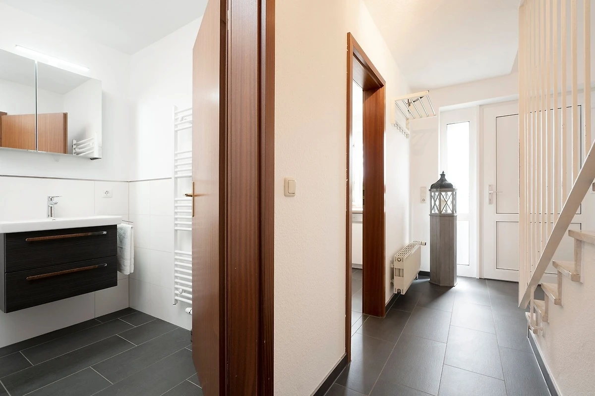 Das Besondere für die ganze Familie. Auf 2 Etagen bietet Ihnen dieses Reihenendhaus im Ferien-Wohnpark Amselweg viel Platz und Komfort. Im Erdgeschoss erwartet Sie ein geräumiger Wohn- und Essbereich mit einem bequemen Ecksofa, einem Sessel und einem grossen Flachbildfernseher. Von hier aus gelangen Sie auch raus auf die möblierte Terrasse und haben Zugang zum Garten. Der Esstisch lädt zu gemeinsamen Mahlzeiten mit der Familie ein. Die moderne, geschlossene Küche überzeugt durch helle Fronten und eine gute Ausstattung. Sämtliche Annehmlichkeiten zum ausgiebigen Kochen sind vorhanden, im Anschluss erledigt der Geschirrspüler den Abwasch. Im hell gefliesten, innenliegenden Gäste-WC steht Ihnen ein Waschtrockner zur Verfügung. Beide Schlafzimmer sowie das moderne Duschbad befinden sich in der 1. Etage. Ein Schlafzimmer verfügt über ein komfortables Doppelbett (2x 90x200 cm), einen Kleiderschrank sowie über einen Fernseher. Im zweiten Schlafzimmer befinden sich 2 Einzelbetten (je 90x200 cm) und ein weiterer Kleiderschrank.