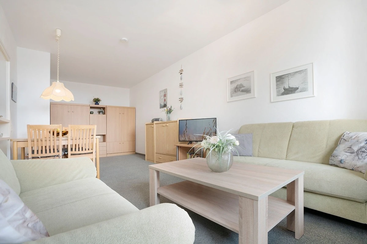 Ihr Urlaub kann beginnen - diese gemütliche Ferienwohnung erwartet Sie im Haus Meeresblick mit einer geschmackvollen Einrichtung. Entspannen Sie im Wohnbereich vor dem TV-Gerät oder geniessen Sie die gute Ostseeluft auf dem möblierten Balkon. Wie wäre es sonst mit einem Spaziergang am Meer? Der Ostseestrand ist nur rund 100 Meter entfernt. Ihre Speisen können Sie prima in der separaten, gut ausgestatteten Küche zubereiten. Und angenehme Nachtruhe finden Sie im bequemen Doppelbett (2x 90x200 cm) im Schlafzimmer sowie in zwei Einzelbetten (Schrankbett) im Wohnzimmer (2x 90x200 cm). Das innenliegende Duschbad ist hell gefliest.