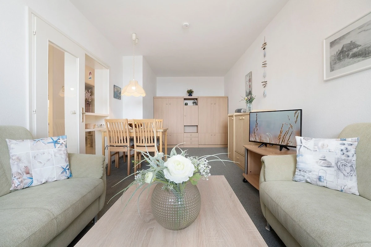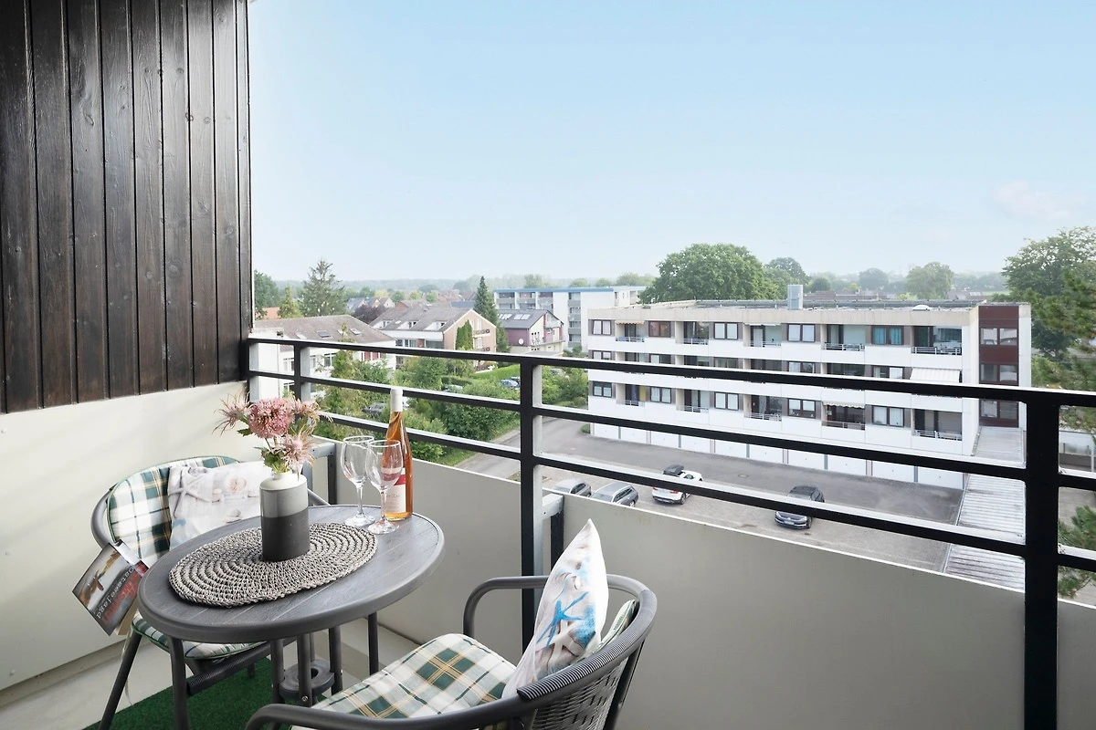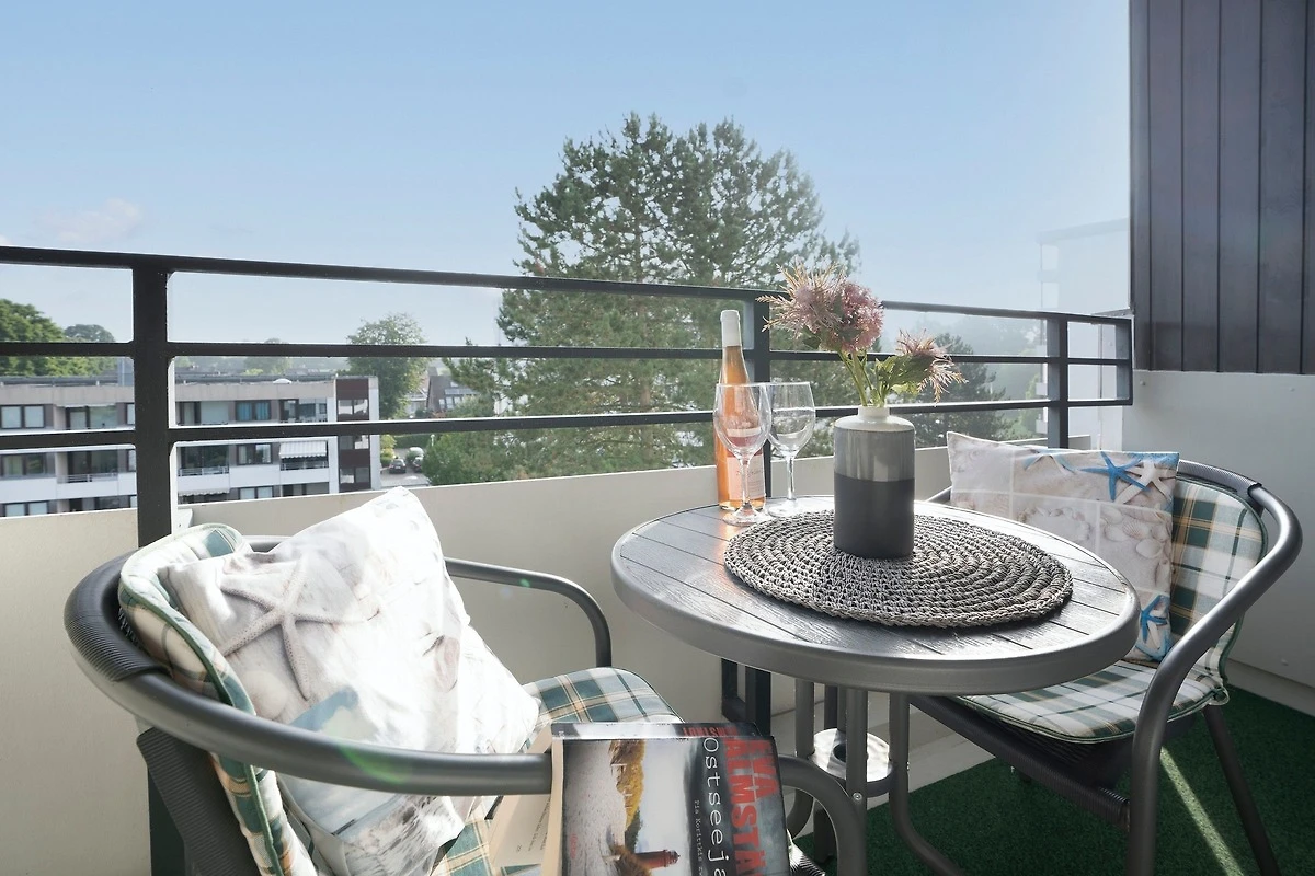 In bester Lage von Kellenhusen: strandnahe 2-Zimmer-Ferienwohnung im 5. Stock mit Balkon, Fahrstuhl und einer Wohnfläche von ca. 42 m² für bis zu 4 Personen.