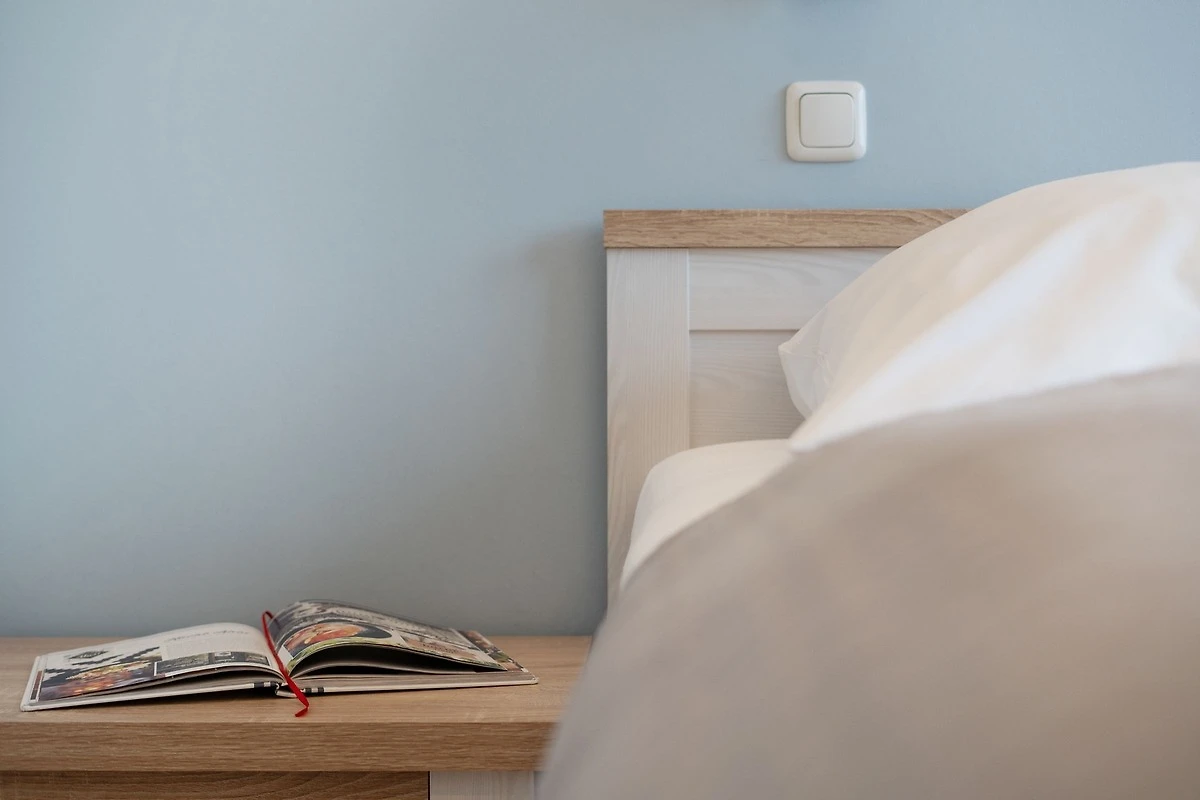 Schlafzimmer 1: 1 Doppelbett (2x 90x200 cm), TV, Verdunkelung (Rollos)