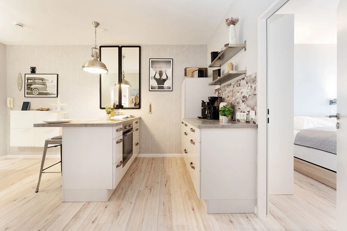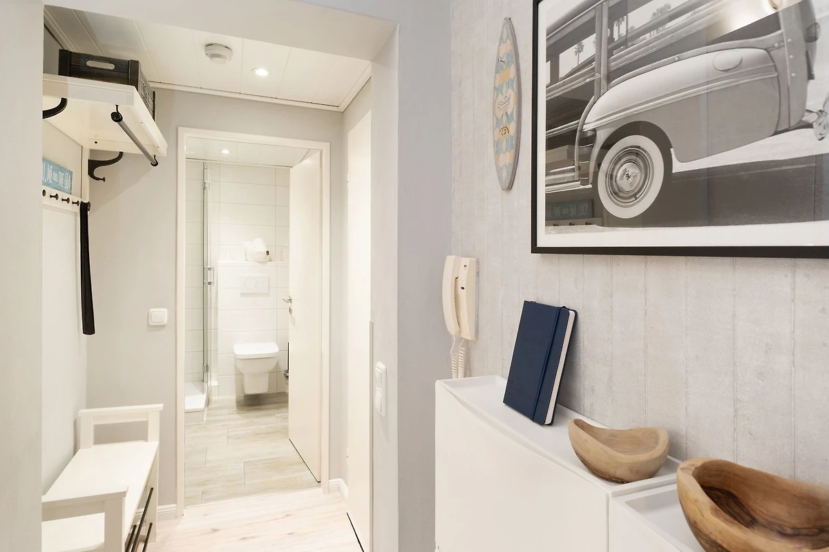 Ein traumhaft schönes und strandnahes Urlaubsdomizil erwartet Sie im Haus Meeresblick. Die Wohnung verfügt über eine pfiffig aufgeteilte EBK mit Backofen, Geschirrspüler, Kühlschrank mit separtem Gefrierschrank (2 Schubladen), Kaffeemaschine, Toaster etc. Vom offen gestalteten Wohnbereich mit Sofalandschaft und grossem Essbereich gelangen Sie zum sonnigen Eckbalkon. Ein Schlafzimmer ist mit einem Doppelbett (je ca 90x200 cm) und zusätzlichem TV-Gerät, ein weiteres Schlafzimmer mit Etagenbett (je ca 90x190 cm) ausgestattet - hier kann auch bequem ein Kinderbettchen aufgestellt werden. Das moderne Duschbad mit WC komplettiert das Angebot. Ein WLAN-gratis-Angebot ist eine weitere Annehmlichkeit.