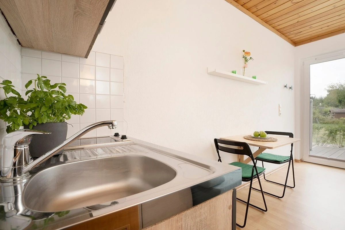 Das 1-Zimmer Apartment im Erdgeschoss verfügt über eine kleine Pantryküche, die ausgestattet ist mit einem Herd, Kühlschrank mit Gefrierfach, Wasserkocher, Toaster und Kaffeemaschine, ein Badezimmer mit Dusche, ein Wohnschlafzimmer mit Schlafsofa (140x190 cm), TV und direkten Zugang zur Süd-Terrasse. Als Highlight verfügt dieses Haus über einen grossen Gemeinschaftsgarten.