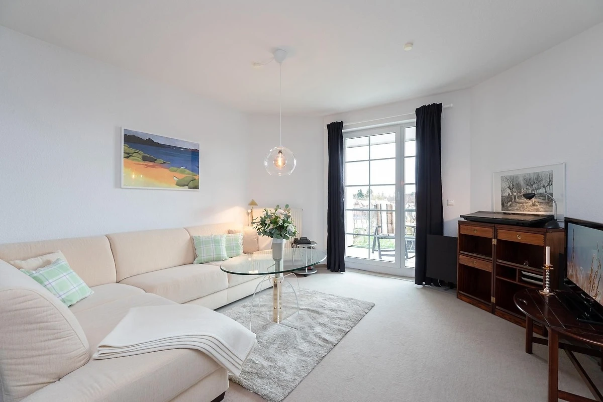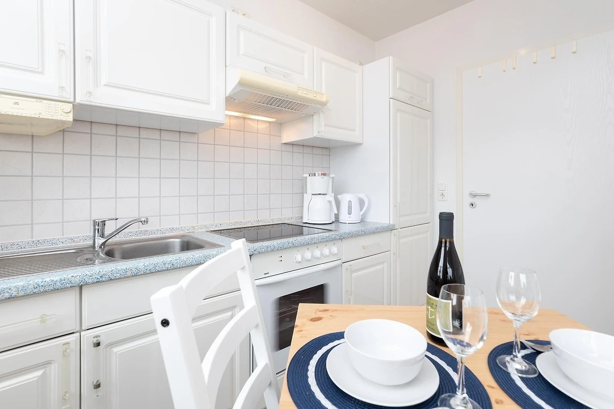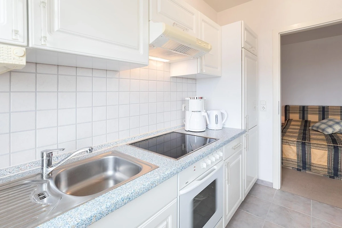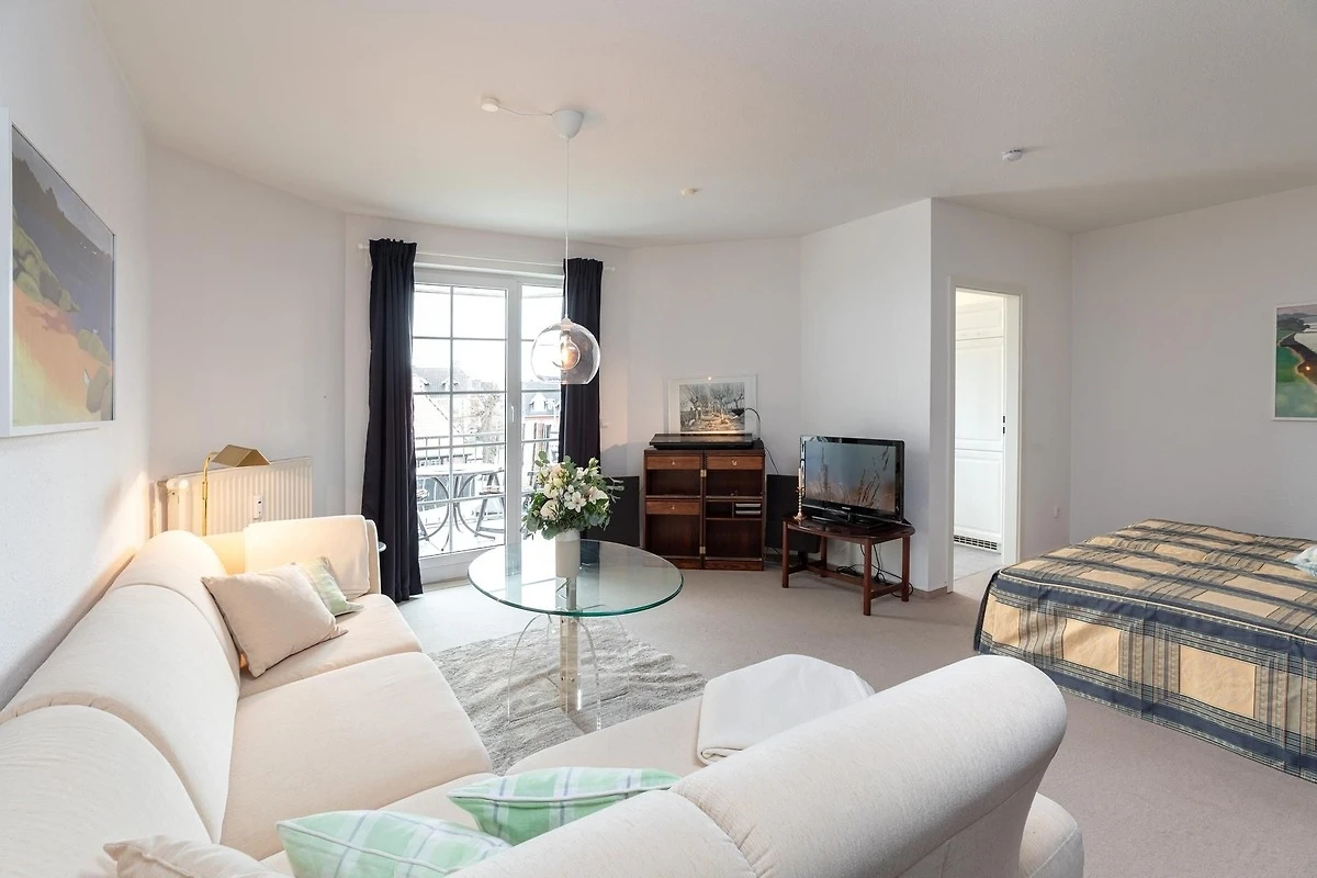 Machen Sie es sich im gemütlichen Wohn-/Schlafraum auf Sofa und Sesseln bequem, für elektronische Unterhaltung sorgen TV, Radio und ein kostenfreier WLAN-Zugang. Nach einem ausgiebigen Strandtag finden Sie Ruhe und Entspannung in dem komfortablen Doppelbett (2x90x200cm), Vorhänge sorgen für angenehme Verdunklung. Mit Alltagshelfern wie 4-Platten-Ceranherd, Backofen und Kühlschrank mit Gefrierfach bietet die separate Küche perfekte Voraussetzungen für entspanntes Kochen im Urlaub. Das Badezimmer ist mit Dusche (Einstiegshöhe ca. 26 cm) und WC klassisch ausgestattet. Auf Ihrem grosszügigen Balkon geniessen Sie die herrliche Ostseeluft, ein Sonnenschirm schützt an Sommertagen vor zu starker Sonnenstrahlung.