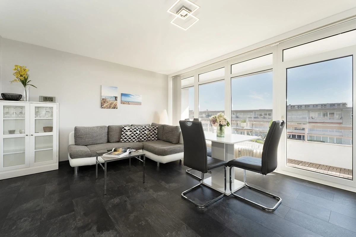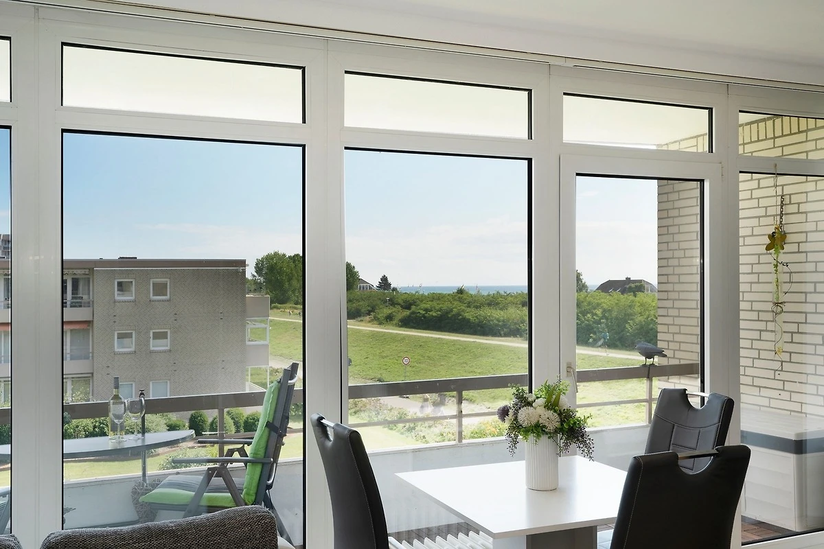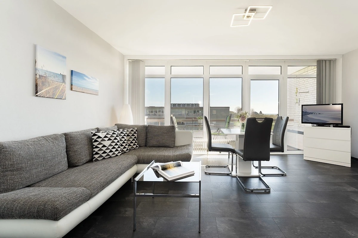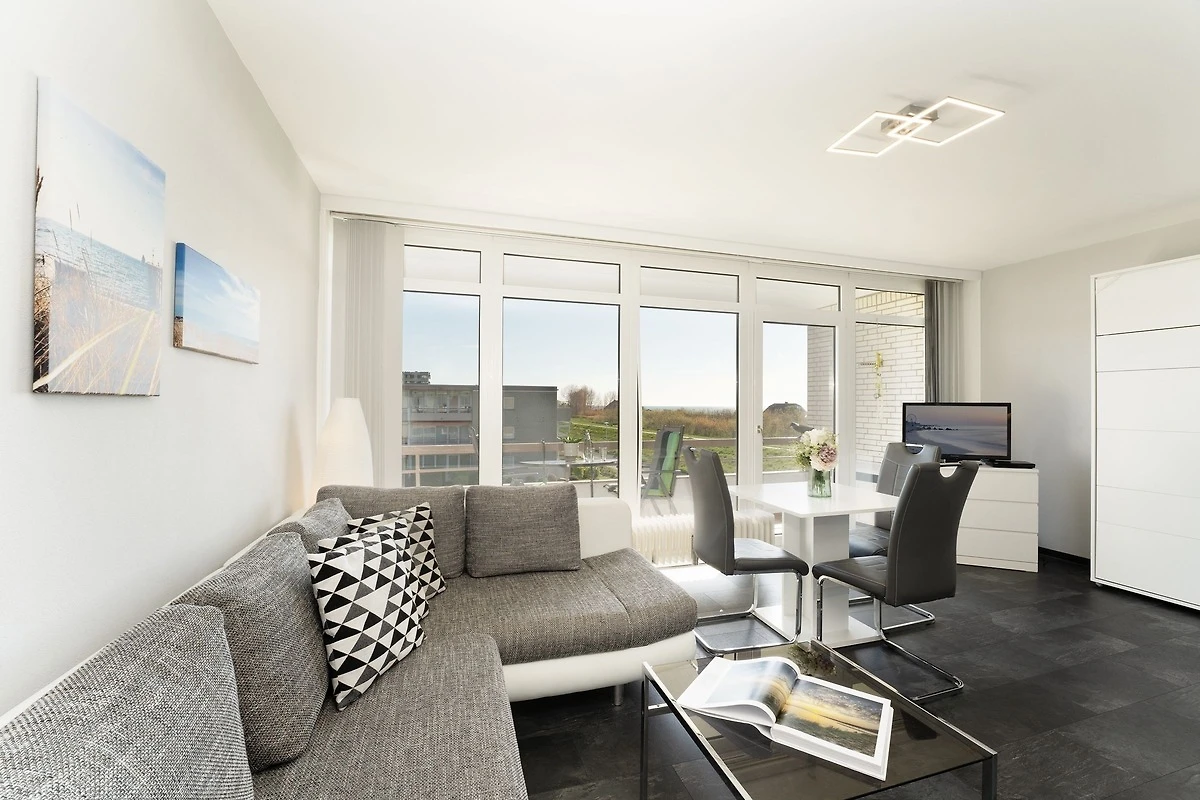 Sehr schöne Lage direkt am Deich mit seitlichem Blick auf das Meer. Die Wohnung ist sehr modern eingerichtet, da wurde das Beste aus wenig Platz gemacht.