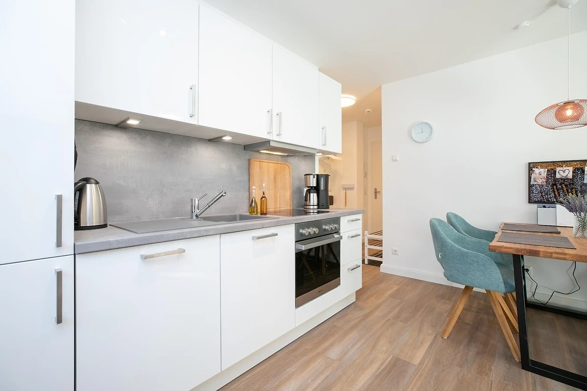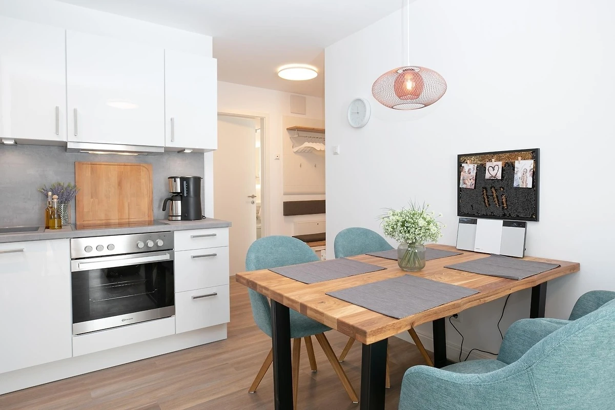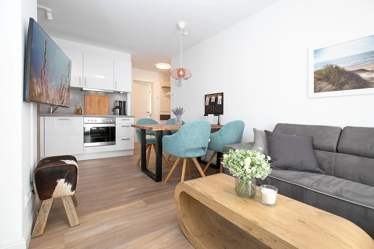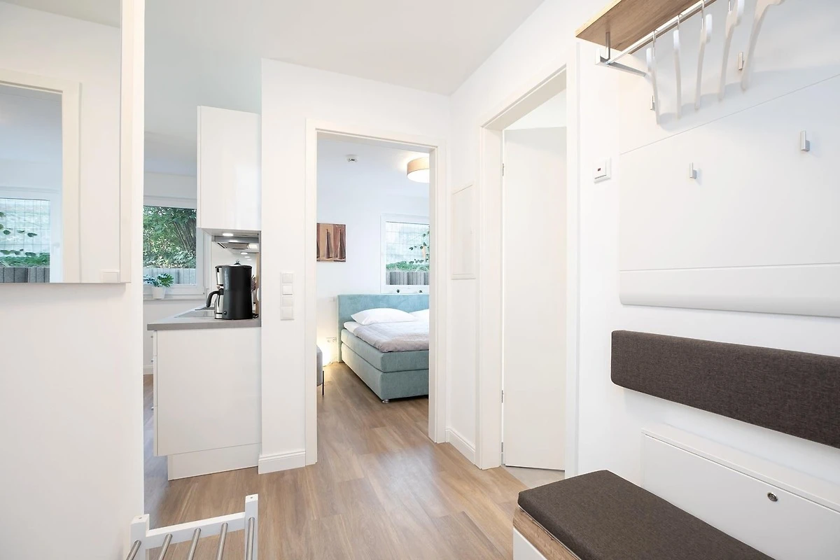 Durch einen kleinen, hellen Flur gelangen Sie in den Wohnbereich mit integrierter Küche. Die geschmackvolle und hochwertige Ausstattung wird Sie überzeugen. Kommen Sie erstmal an und geniessen Sie nach der Anreise einen Begrüssungsdrink auf dem gemütlichen Sofa. Lassen Sie Ihren Blick schweifen und planen Sie das Menü für den Abend, dass Sie ohne Mühe in der voll ausgestatteten Küche zaubern können. Am Esstisch können Sie dann bei einem guten Essen den Urlaub einläuten. Ein Flat-TV und ein kostenloser WLAN-Anschluss sorgen an Regentagen für Unterhaltung. Bei Sonnenschein empfehlen wir ein Frühstück auf Ihrer grosszügigen, möblierten Terrasse. Auf 15 m² können Sie die Seele baumeln lassen und den Alltag vergessen. Unsere gute Ostseeluft macht müde - lassen Sie sich in die Kissen des komfortablen Boxspringbettes (2x 90x200 cm) fallen und verbringen Sie traumhafte Nächte im abgedunkelten separaten Schlafzimmer. Ein Kleiderschrank bietet viel Platz für Ihre Habseligkeiten. Ein TV Gerät sorgt bei Bedarf für Unterhaltung.