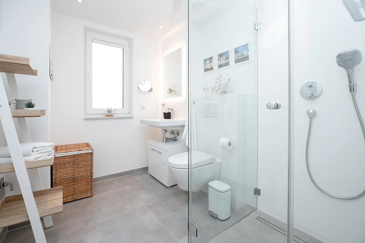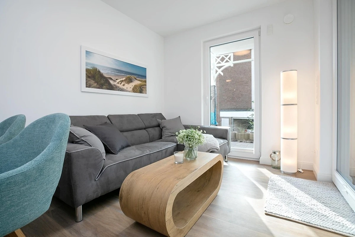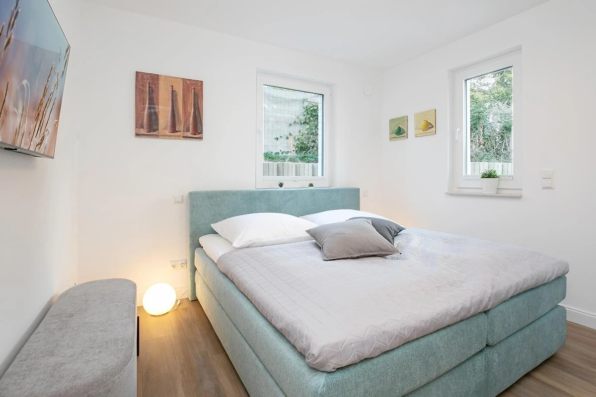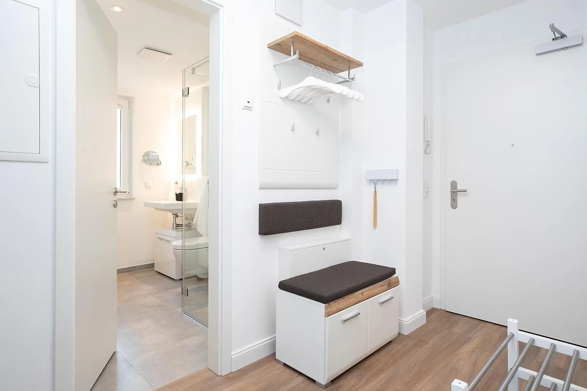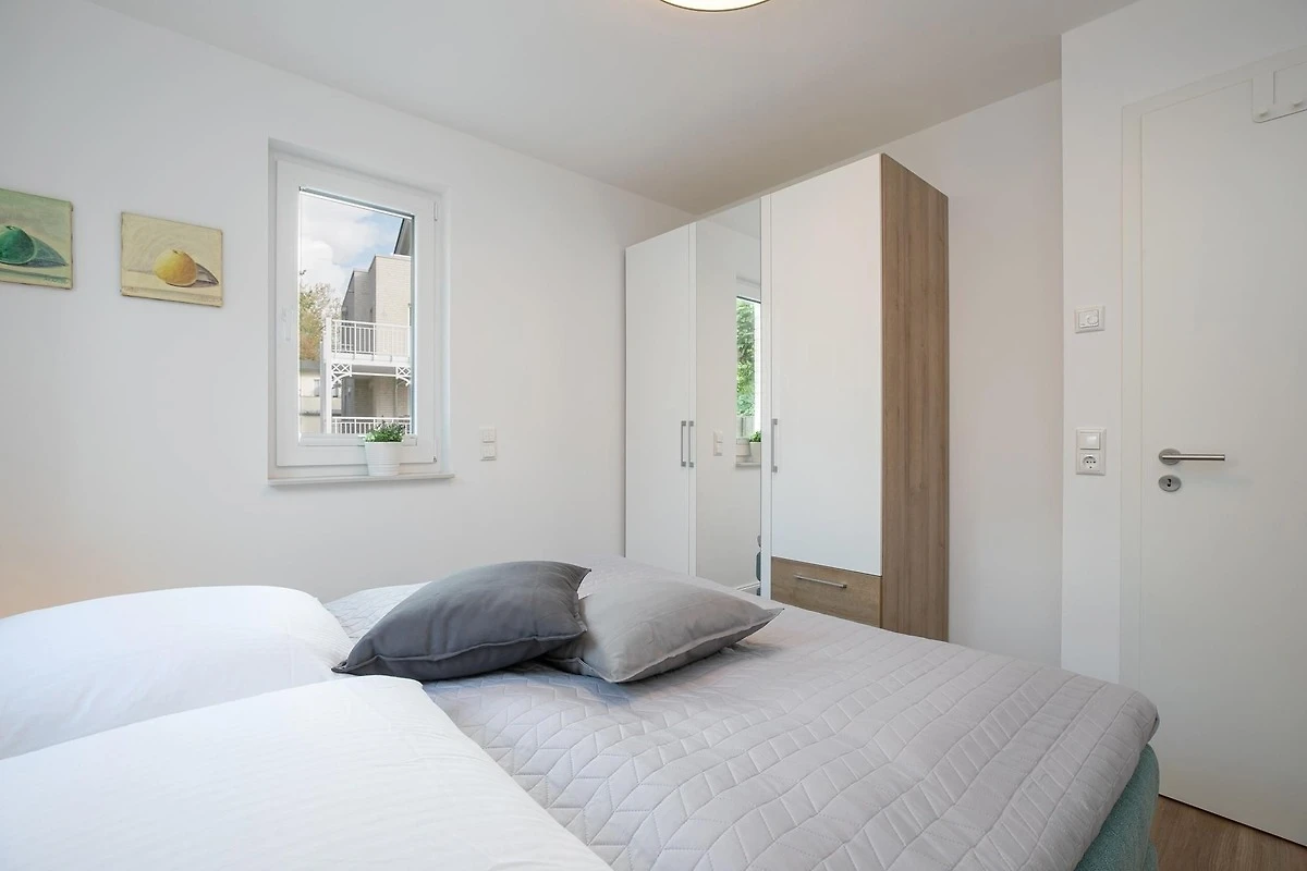 Durch einen kleinen, hellen Flur gelangen Sie in den Wohnbereich mit integrierter Küche. Die geschmackvolle und hochwertige Ausstattung wird Sie überzeugen. Kommen Sie erstmal an und geniessen Sie nach der Anreise einen Begrüssungsdrink auf dem gemütlichen Sofa. Lassen Sie Ihren Blick schweifen und planen Sie das Menü für den Abend, dass Sie ohne Mühe in der voll ausgestatteten Küche zaubern können. Am Esstisch können Sie dann bei einem guten Essen den Urlaub einläuten. Ein Flat-TV und ein kostenloser WLAN-Anschluss sorgen an Regentagen für Unterhaltung. Bei Sonnenschein empfehlen wir ein Frühstück auf Ihrer grosszügigen, möblierten Terrasse. Auf 15 m² können Sie die Seele baumeln lassen und den Alltag vergessen. Unsere gute Ostseeluft macht müde - lassen Sie sich in die Kissen des komfortablen Boxspringbettes (2x 90x200 cm) fallen und verbringen Sie traumhafte Nächte im abgedunkelten separaten Schlafzimmer. Ein Kleiderschrank bietet viel Platz für Ihre Habseligkeiten. Ein TV Gerät sorgt bei Bedarf für Unterhaltung.