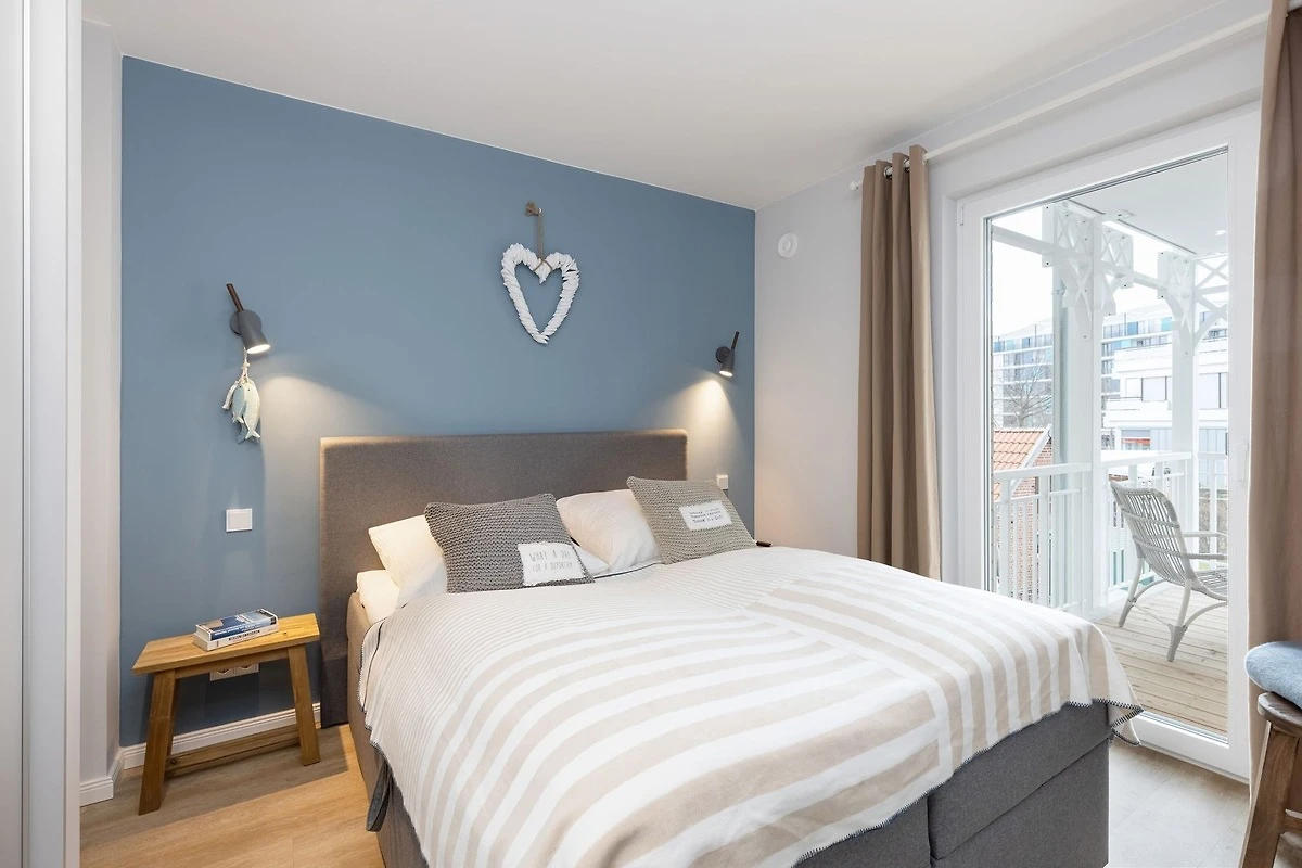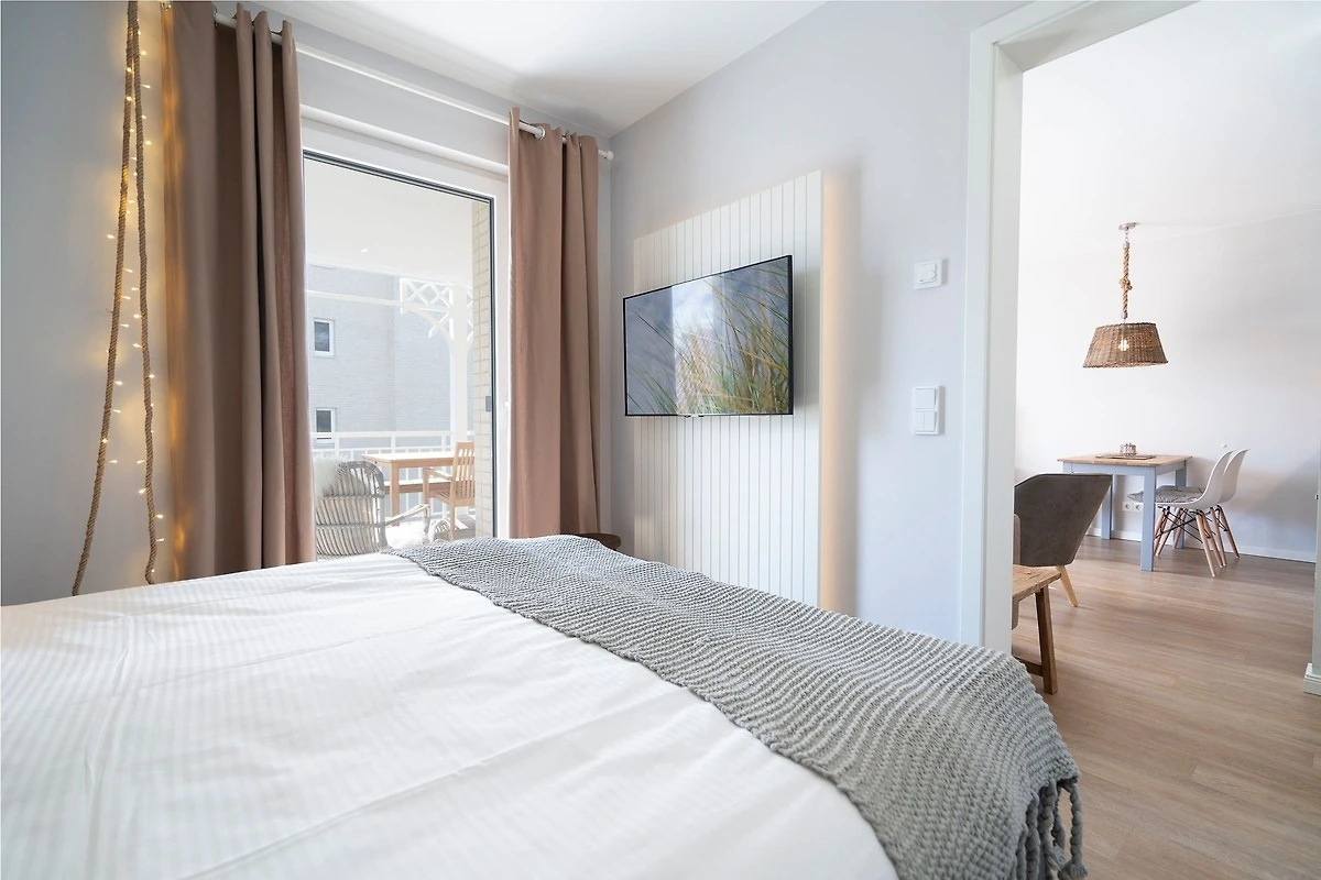 Hier eröffnet sich Ihnen Ihr Urlaubsparadies zu einem entschleunigten Ostseeurlaub. Der Wohnbereich mit Flachbild-TV ermöglicht kuschelige Abende auf dem Sofa, das sich dann zur Nacht in eine gemütliche Schlafstätte (160x200 cm) verwandeln lässt. Angrenzend finden Sie die offene, gut ausgestattete Küche, in der Sie sich mühelos selbst verpflegen können. Der möblierte grosszügige Balkon in Süd-West Richtung lädt Sie bei entsprechendem Wetter zum Verweilen ein. Geniessen Sie hier ein gutes Buch, oder Ihr Frühstück am Morgen bei guter Ostseeluft. In einem separaten Schlafzimmer mit Boxspringbett (2x 80x200 cm) und 2. TV können Sie sich von ereignisreichen Tagen am Strand erholen. Die Wohnung lässt sich komplett durch Aussenrollläden verdunkeln. Komplettiert wird diese tolle Wohnung von einem Duschbad mit bodentiefer Dusche. Die gesamte Wohnung ist mit Fussbodenheizung ausgestattet, WLAN ist hier selbstverständlich ebenfalls inklusive.