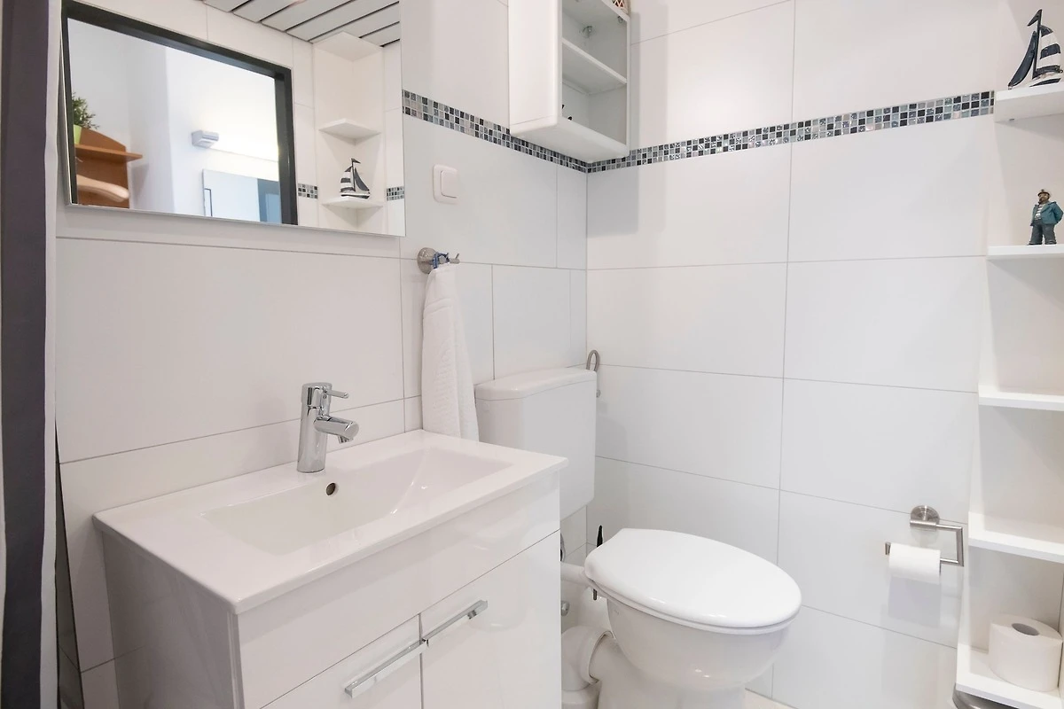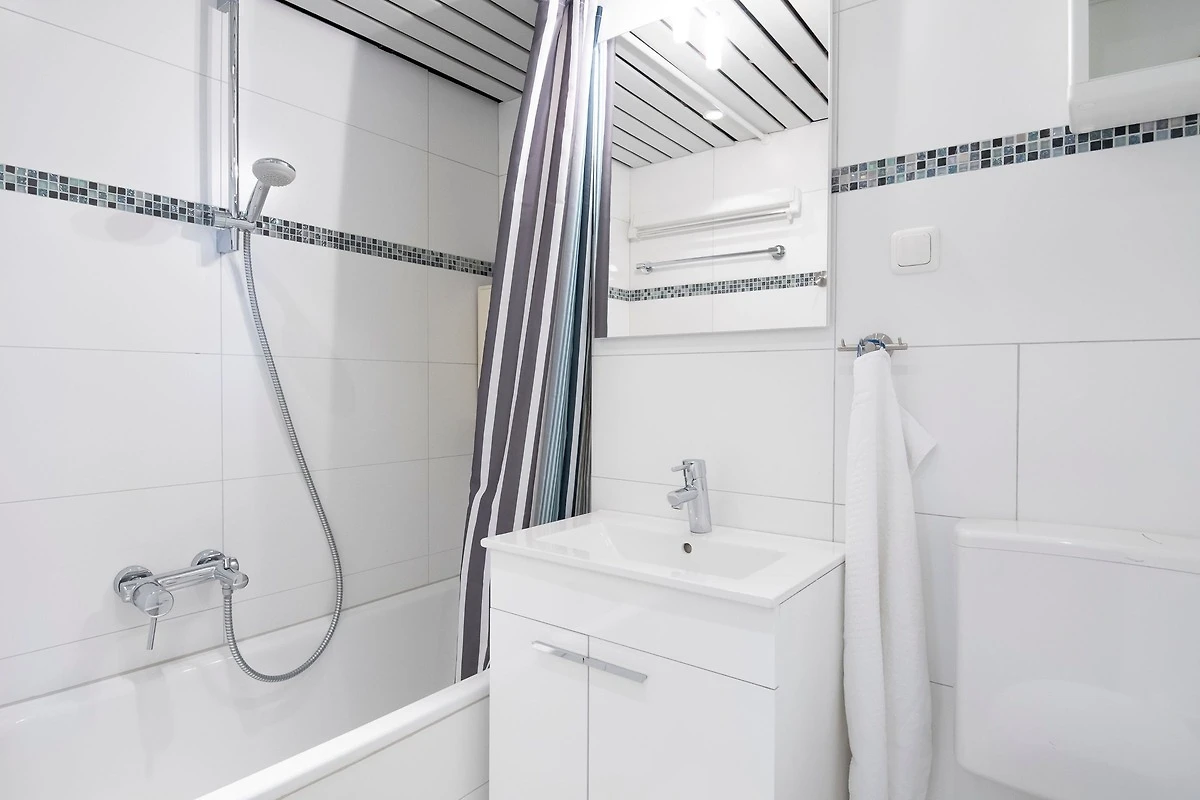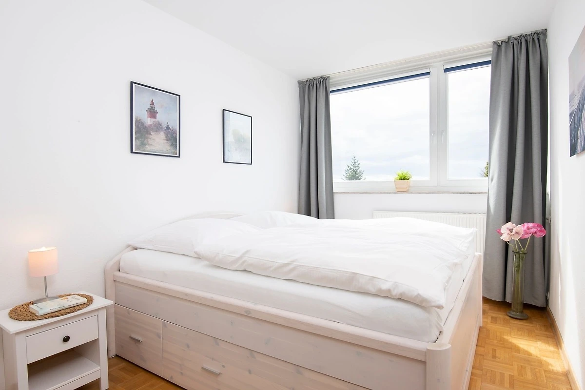 Treten Sie ein in den lichtdurchfluteten Wohn- und Essbereich. Hier sind ein Esstisch, ein Sofa, zwei Sessel sowie ein Fernseher vorhanden. Das Sofa lässt sich abends schnell und einfach ausziehen und dient somit als Schlafmöglichkeit (160x200 cm). Der Wohnbereich lässt sich mit Gardinen verdunkeln. Das separate Schlafzimmer mit Fenster, Kleiderschrank und komfortablen Doppelbett (2 x 90x200 cm) bietet weiterhin Platz für 2 Personen. Damit Sie Ihren wohlverdienten Schlaf erhalten wurden hier ebenfalls Verdunklungsgardinen und -rollos angebracht. In der kleinen, geschlossenen Küche ist alles vorhanden, was Sie zum Kochen benötigen. Die Mahlzeiten können Sie dann entspannt auf dem möblierten Balkon zu sich nehmen und dabei den seitlichen Blick auf die Ostsee geniessen ... Im Badezimmer mit WC befindet sich eine Badewanne mit Dusche, in der Sie sich von einem erlebnisreichen Urlaubstag erholen können.