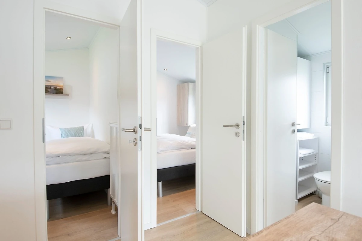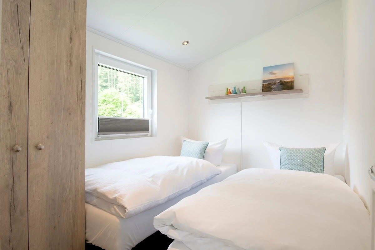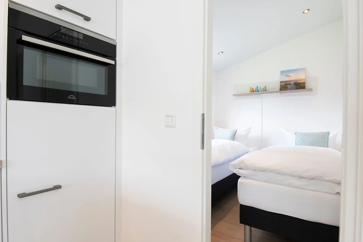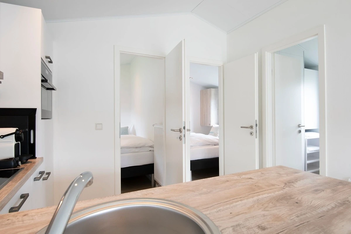 Die gesamte Raumaufteilung ist bis ins kleinste Detail durchdacht. Der kombinierte Wohn- und Essbereich verfügt über ein bequemes Sofa und über einen Esstisch, der ausreichend Platz für bis zu 4 Personen bietet. Die zum Wohnbereich offene Küche mit hellen Fronten lädt zu gemeinsamen Kochabenden mit der Familie oder Freunden ein. In der Küche sind alle Notwendigkeiten wie z. B. ein Kühlschrank, eine Mikrowelle (Kombigerät mit Backofenfunktion) und auch ein Geschirrspüler vorhanden. Eine Kaffee-Kapselmaschine (Nespresso) sorgt für den täglichen Kaffeegenuss morgens beim Frühstück oder nachmittags zum Kuchen. Ein Schlafzimmer empfängt Sie mit einem komfortablen Doppelbett (2x 80x200 cm), einem Kleiderschrank und einem Fernseher. Im anderen Schlafzimmer befinden sich zwei getrennt stehende Einzelbetten (je 80x200 cm) und ein Kleiderschrank. Die Fenster in beiden Schlafzimmern lassen sich mit Plissees angenehm verdunkeln. Im kleinen, hell gefliesten Badezimmer mit Fenster sind eine Dusche und Ablagemöglichkeiten für Ihre Badutensilien vorhanden. Ein beheizbarer Handtuchhalter sorgt für zusätzlichen Komfort. Ein Highlight dieser Ferienunterkunft ist die möblierte, überdachte Terrasse mit Grill, auf der Sie Ihren Urlaub in vollen Zügen geniessen können. Der WLAN-Anschluss ist für Sie selbstverständlich inklusive.
