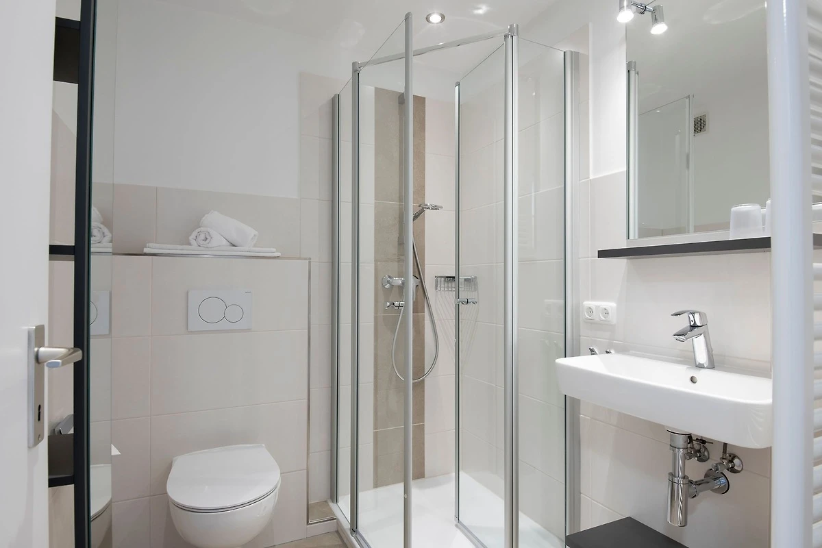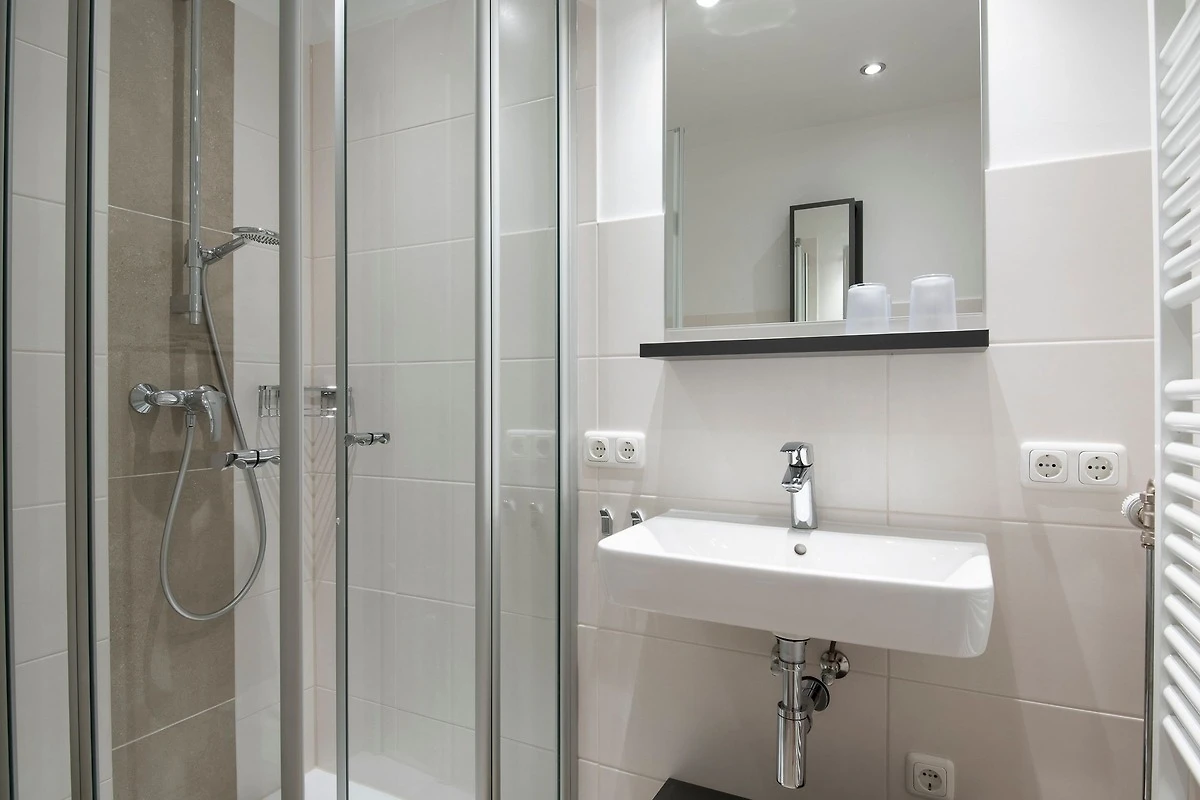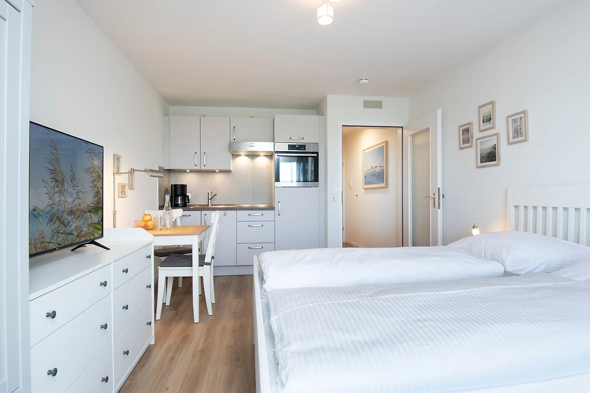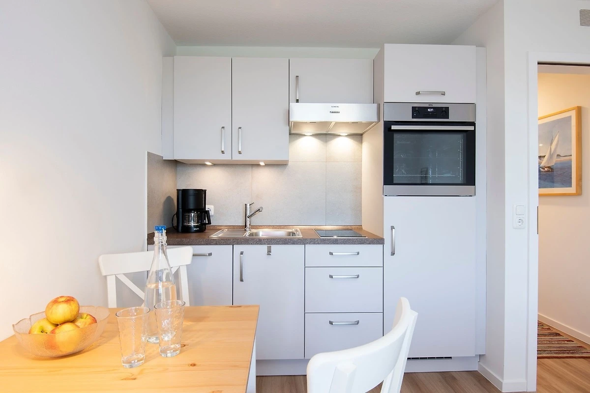 Diese Ferienwohnung ist mit einer Wohnfläche von ca. 26 m² ein wahres Raumwunder. Die gesamte Einrichtung ist bestens durchdacht und harmonisch aufeinander abgestimmt. Der kombinierte Wohn- und Schlafbereich verfügt über ein komfortables Doppelbett (2x 80x200 cm), einen Kleiderschrank und eine Garderobe für Ihre Kleidung sowie über einen grossen Flachbildfernseher. Ebenfalls vorhanden sind ein Esstisch mit 2 Stühlen und eine kleine Küchenzeile mit hellen Fronten. Die Küche ist mit allen Notwendigkeiten ausgestattet, die Sie im Urlaub benötigen. Hier finden Sie z. B. einen Induktionsherd mit 2 Kochfeldern, einen Backofen und einen Kühlschrank sowie einen Geschirrspüler vor. Das innenliegende, hell geflieste Badezimmer ist ebenfalls modern eingerichtet und erwartet Sie mit einer Dusche, einem WC und einem Waschbecken. Weiterhin sind ein schmales Regal für Ihre Badutensilien und ein beheizbarer Handtuchhalter vorhanden. Der WLAN-Anschluss ist selbstverständlich inklusive.