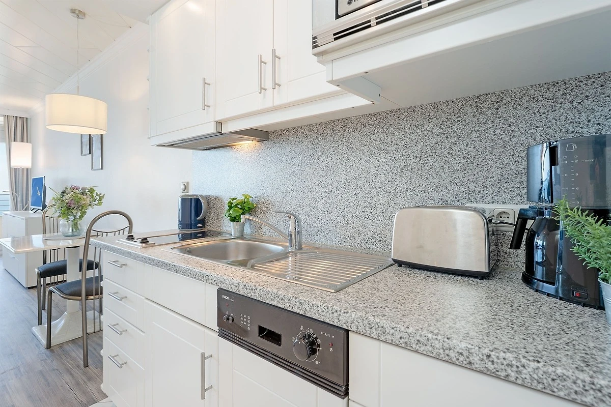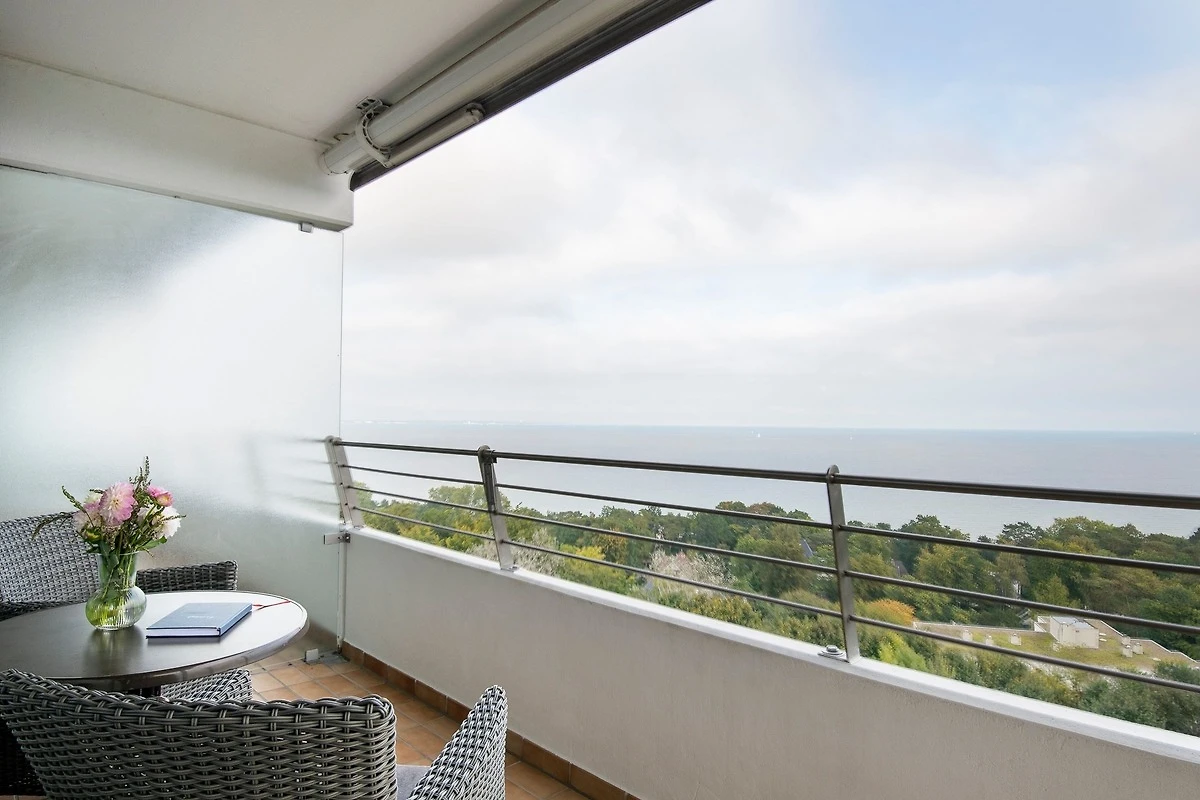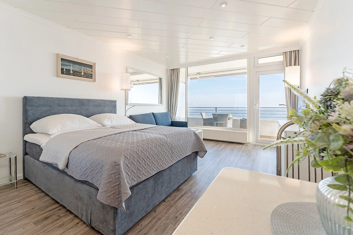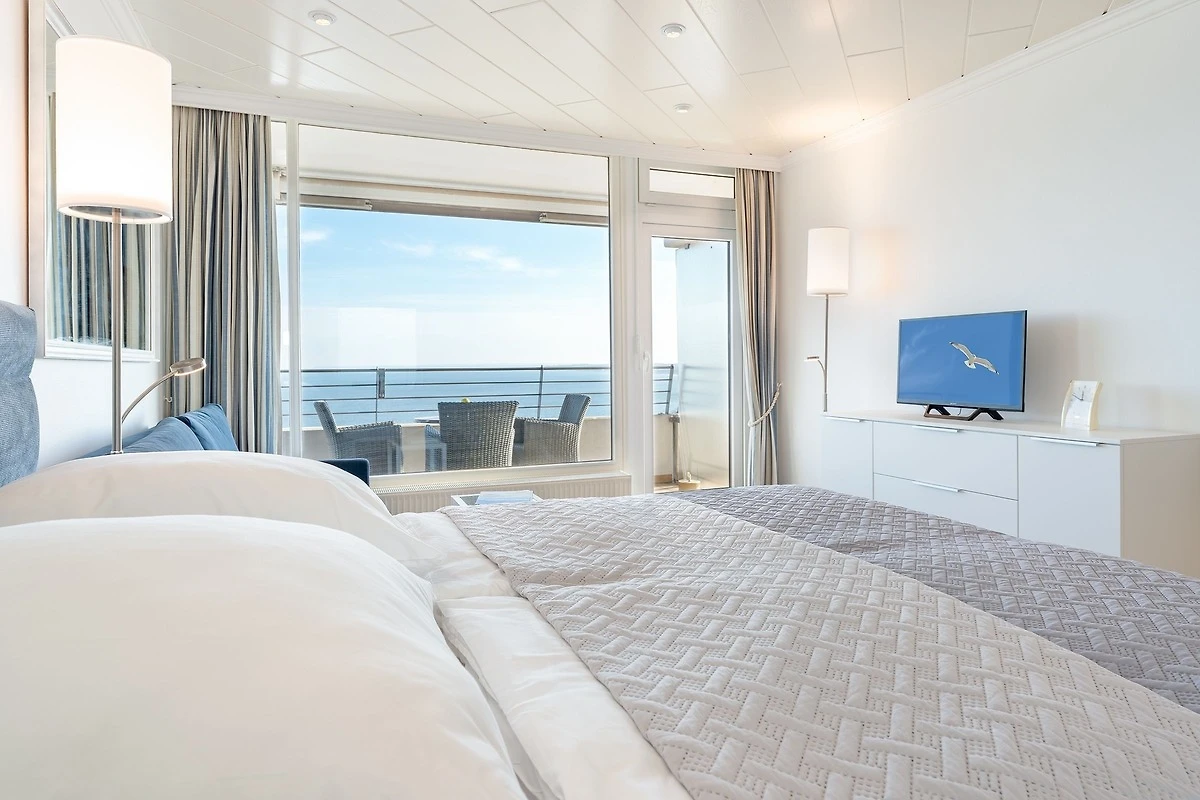 Geniessen Sie den traumhaften Blick über unsere wunderschöne Ostsee und stossen Sie auf dem möblierten Balkon mit einem guten Glas Wein auf Ihren wohlverdienten Urlaub an. Im Wohnbereich können Sie gemütliche Abende auf dem Sofa verbringen. Ein TV Gerät sorgt für spannende Unterhaltung. Sollten Sie sich einmal gegen einen Restaurantbesuch entscheiden, bietet die moderne helle Küche alles, um sich kleine Gerichte und Köstlichkeiten selbst zu zu bereiten. Zur Nacht finden Sie Ruhe und Erholung im komfortablen Boxspring-Doppelbett (2x 80x200 cm). Das innenliegende Badezimmer mit Wanne rundet die Ausstattung dieser Wohnung in einmaliger Lage ab.