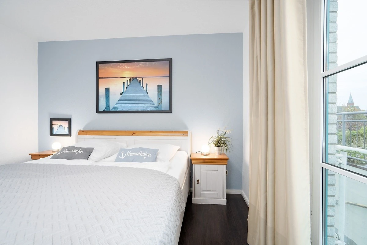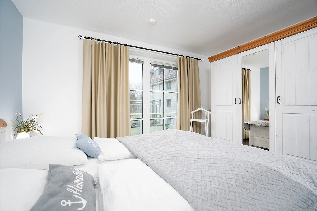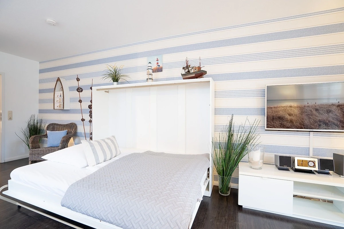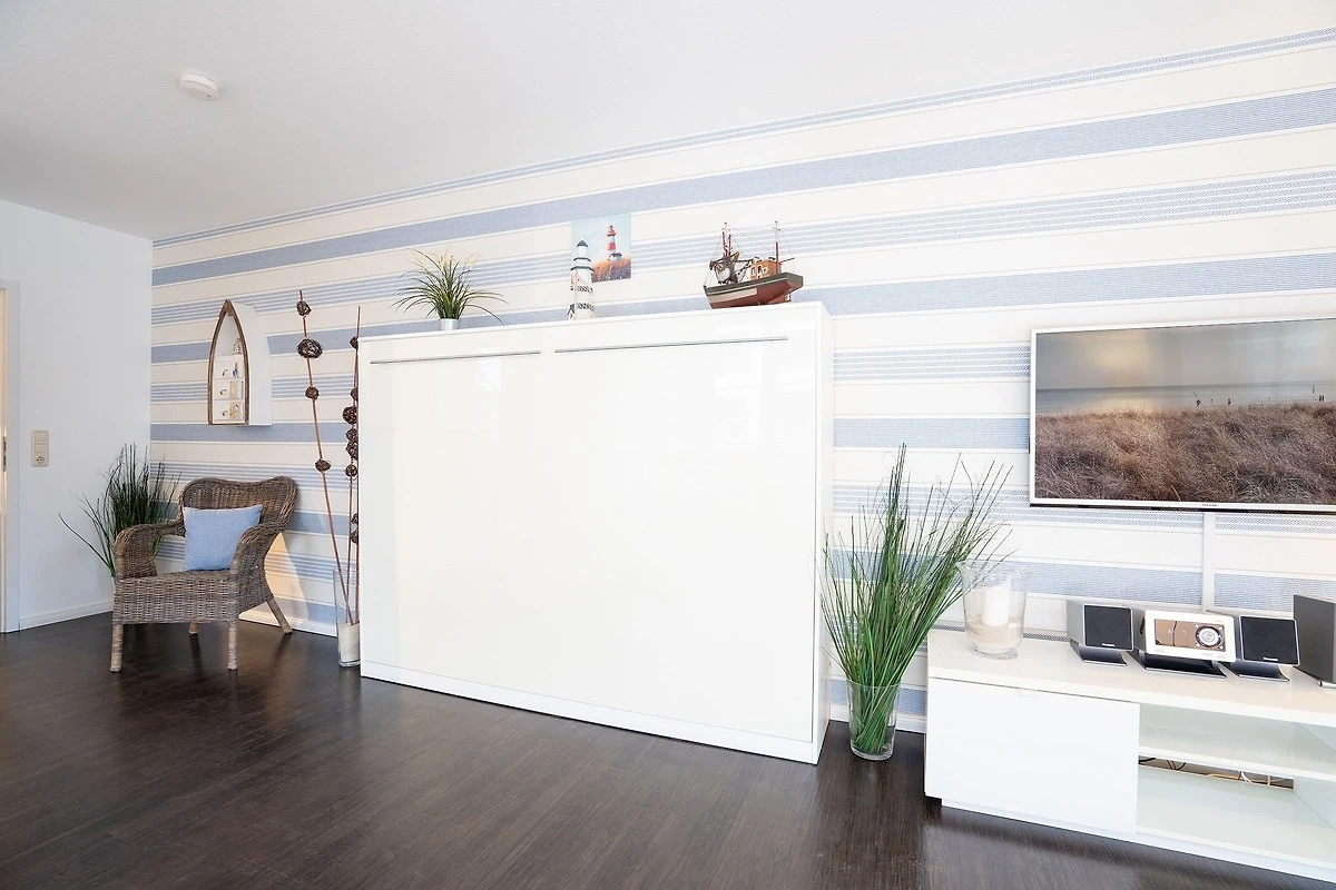 Der Wohnbereich ist modern und maritim eingerichtet und begrüsst Sie mit einem Sofa, einem Flachbildfernseher sowie Zugang zur überdachten, möblierten Terrasse. Als Schlafmöglichkeit für 2 Personen ist ein Schrankbett (140x200 cm) vorhanden. Die Küche grenzt offen an den Wohnbereich und ist voll ausgestattet - Annehmlichkeiten wie z. B. ein Herd, ein Backofen sowie ein Geschirrspüler stehen Ihnen zur Verfügung. Für den täglichen Kaffeegenuss sorgt eine Nespresso-Kapselmaschine. Im separaten Schlafzimmer erwartet Sie ein komfortables Doppelbett (2x 90x200 cm) und ein grosser Kleiderschrank für Ihre Urlaubsgarderobe. Das moderne Tageslichtbad bietet Ihnen neben einem WC auch eine bodengleiche Dusche und einen beheizbaren Handtuchhalter.