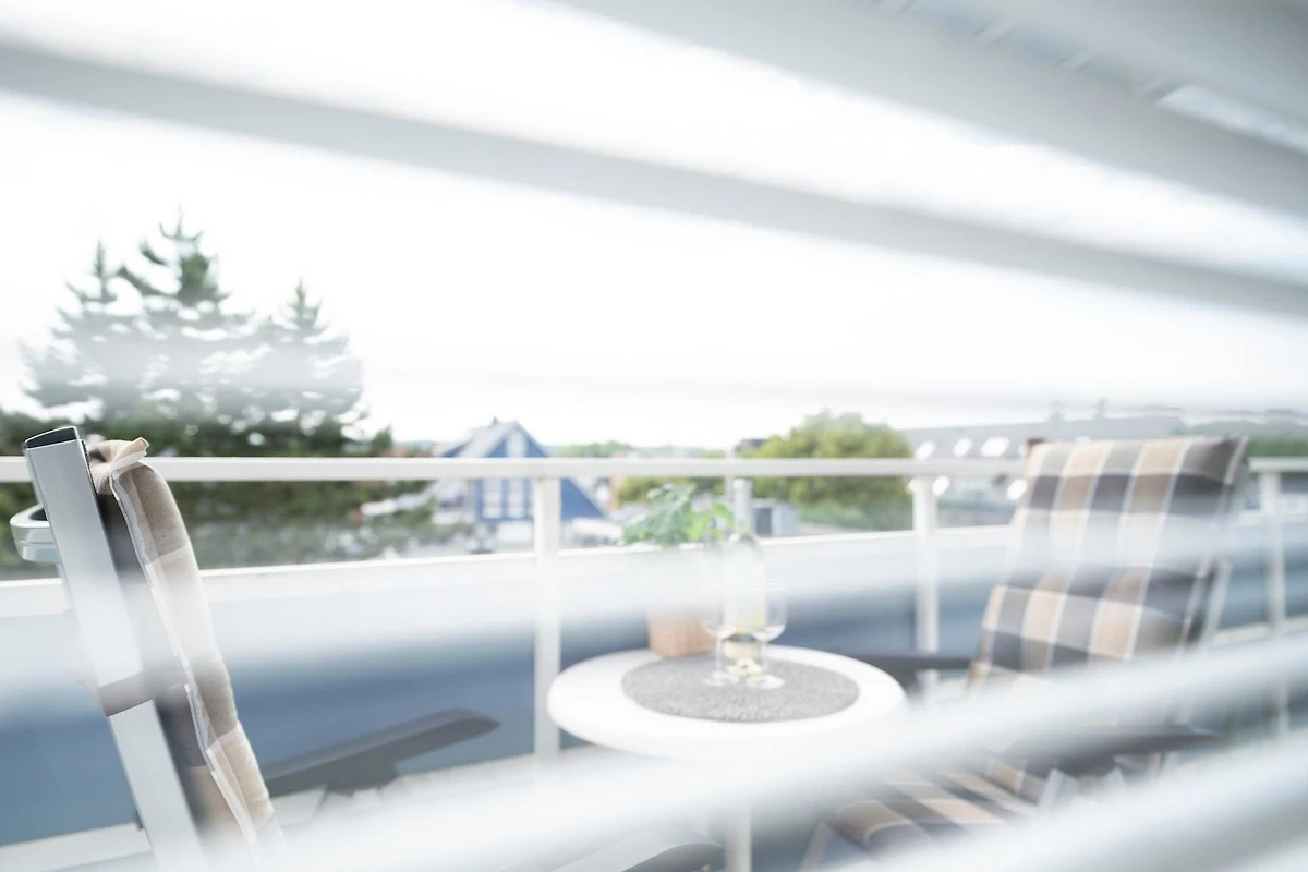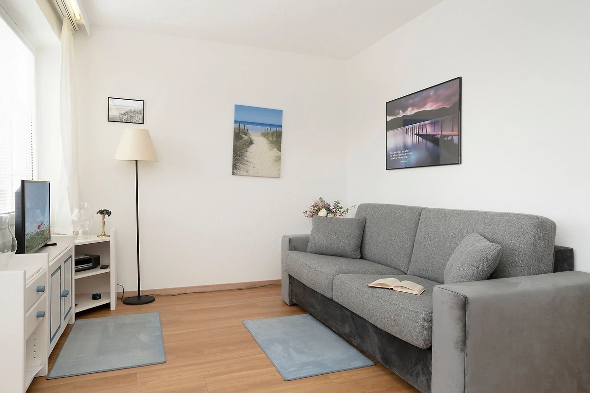 Der kombinierte Wohn-Schlafraum ist mit einem gemütlichen Schlafsofa (160x200 cm) sowie einem Flachbildfernseher ausgestattet und grenzt an den Essbereich mit ausreichend Platz für alle Gäste. Von hier aus gelangen Sie auf den möblierten Balkon mit Markise und tollem Panoramablick über die Dächer von Scharbeutz. Die offene Küche ist mit einem Herd, Kühlschrank mit Gefrierfach und einer Kaffeemaschine ausgestattet. Das hell geflieste Badezimmer mit Dusche und beheizbarem Handtuchhalter rundet den Komfort dieser Ferienwohnung ab.