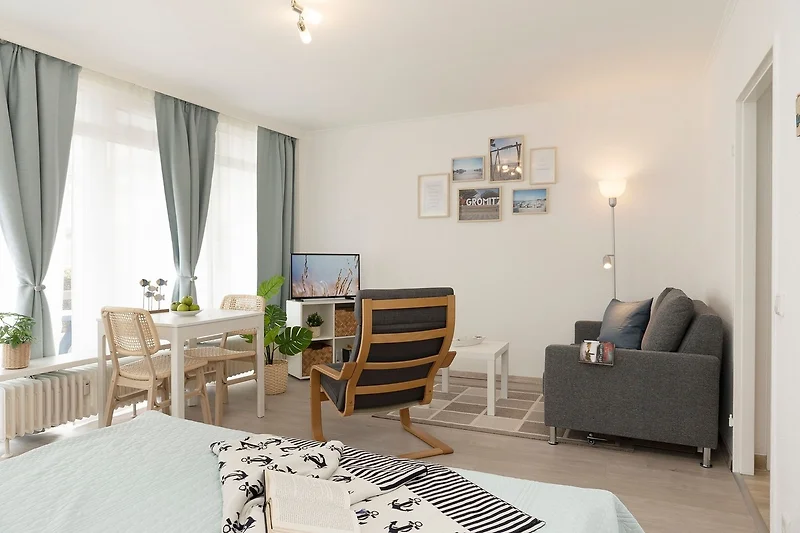 Es empfängt Sie ein schöner Wohn-/Schlafbereich mit Doppelbett (160x200 cm), Sessel, TV und gemütlicher Couch. Von hier aus gelangen Sie auf den überdachten, möblierten Balkon. In der voll ausgestatteten Küche können Sie leckere Gerichte zubereiten und gemeinsam am Esstisch im Wohnbereich einnehmen. Zur Nacht lässt sich das Zimmer durch Vorhänge angenehm abdunkeln. Das helle und moderne Duschbad sorgt für einen angenehmen Start in den Tag.