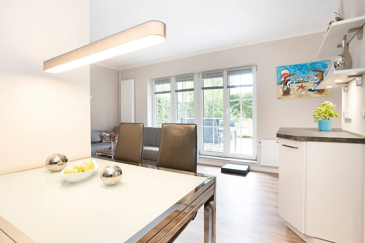 Im Wohnraum befinden sich eine hochwertige Couchgarnitur (Ottomane), welche zu einem Doppelbett (140x200 cm) ausgezogen werden kann. Ein DAB+-Internetradio mit Bluetooth, ein 55 Zoll Smart-TV und eine Spielesammlung lassen keine Langeweile aufkommen. Die moderne, sehr gut ausgestattete Einbauküche ist in den Wohnbereich integriert und mit den notwendigen Alltagshelfern und sogar einem Waffeleisen voll ausgestattet. Am Esstisch finden 4 Personen Platz. Im separaten Schlafzimmer sorgt ein Doppelbett (160x200 cm) für erholsame Nachtruhe. Ausserdem ist das Schlafzimmer zusätzlich mit einem TV ausgestattet. Das hell geflieste Badezimmer mit Dusche und Haartrockner rundet das Angebot dieser Ferienwohnung ab. Die nicht einsehbare, windgeschützte Terrasse mit Markise bietet eine schöne Süd-Ausrichtung und verfügt über Gartenmöbel (Gartentisch mit 4 Stühle, 2 Relax-Liegestühle und 2 Liegen) mit Polsterauflagen.