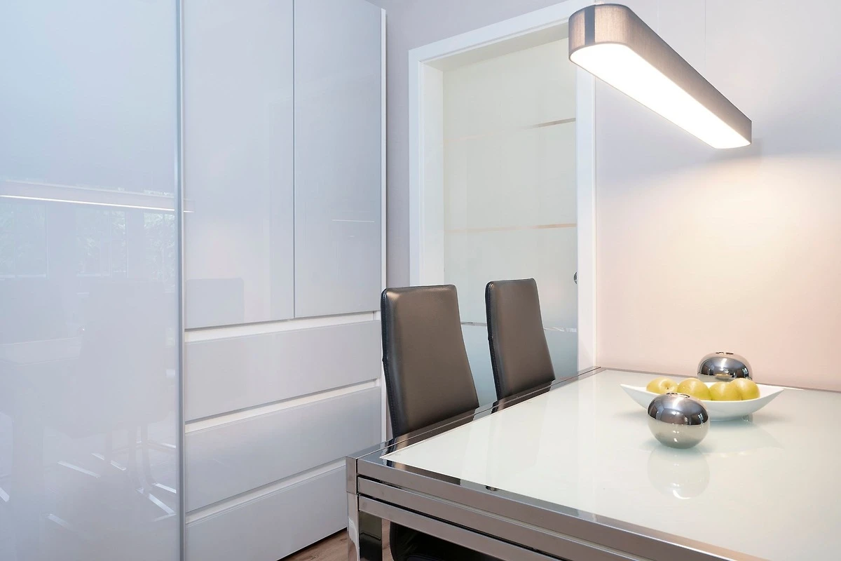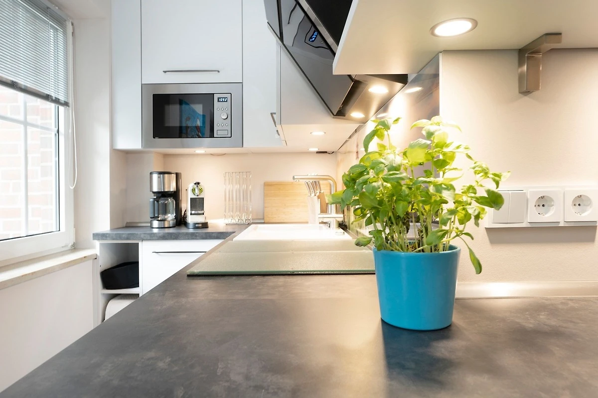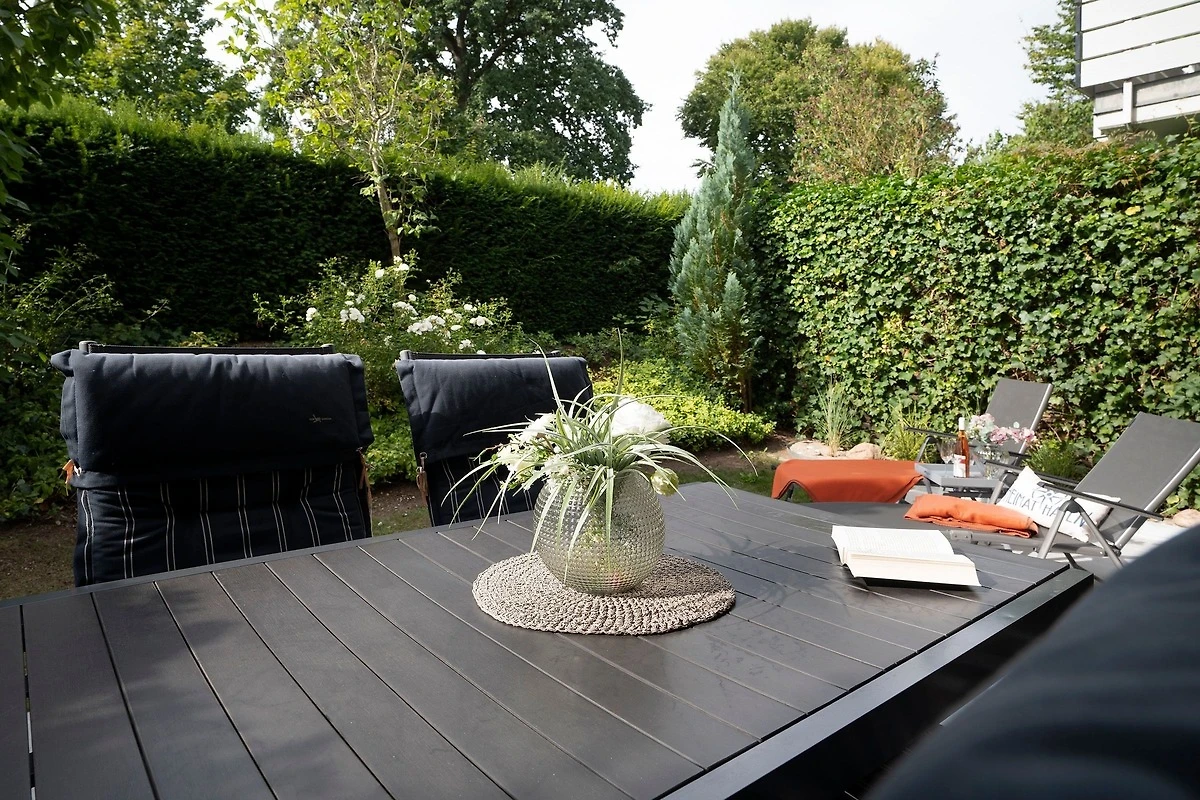 Modern und geschmackvoll eingerichtet. Einrichtung machte einen sehr gepflegten Eindruck. Hochwertige Küche, komplett ausgestattet, haben hier nichts vermisst. Technisch gute Ausstattung. Wertige Gartenmöbel. Wohnung wurde gut gereinigt angetroffen