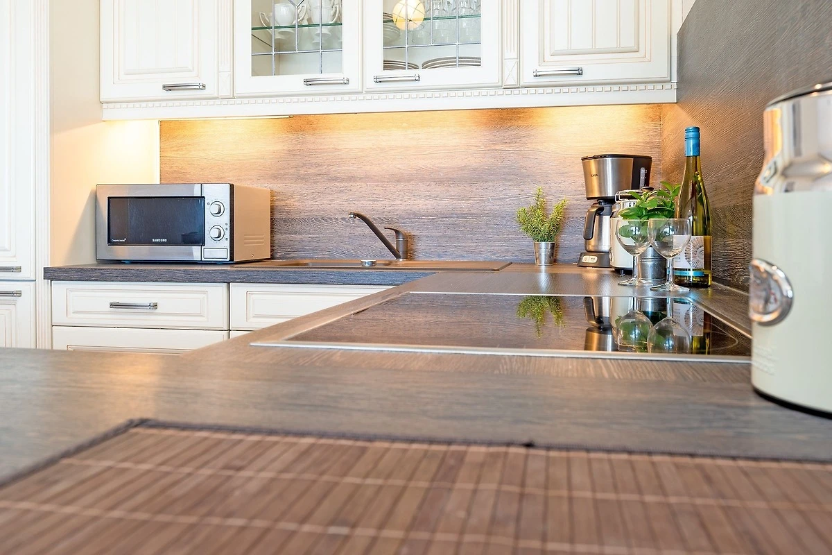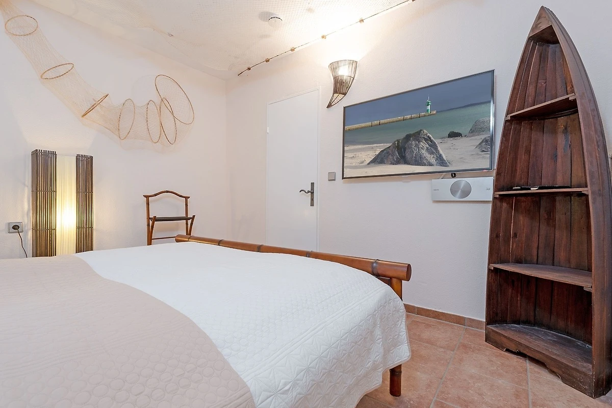 Diese zauberhafte Ferienwohnung heisst Meerblick Lounge – und macht ihrem Namen alle Ehre. Betreten Sie das lichtdurchflutete Wohnzimmer mit der grosser Fensterfront, nehmen Sie Platz auf der kuscheligen Sofa-Landschaft und lassen Sie sich von dem sagenhaften Meerblick verzaubern. Für Unterhaltung sorgt ein TV-Gerät – aber auf die Ostsee zu schauen, ist sicher schöner. Kommen Sie raus auf die davor liegende, geräumige Terrasse. Hier können Sie im Strandkorb Ihren ersten Morgenkaffe trinken und den Sonnenaufgang über dem Meer geniessen. Der Strand selbst ist auch nur rund 60 Meter entfernt. Ostsee pur. Die in den Wohnbereich integrierte Küche mit Spülmaschine bietet Ihnen alle Annehmlichkeiten, die Sie im Urlaub für die Zubereitung Ihrer Lieblingsmenüs brauchen. Raffiniert: Sie können komfortabel am Ess-Tresen sitzen, gleichzeitig sorgt der Tresen als Raumteiler für eine gemütliche Atmosphäre. Nach einem erlebnisreichen Tag an der Küste finden Sie angenehme Nachtruhe zum einen im Wohnzimmer: Das Sofa lässt sich in ein Doppelbett (ca. 140x200 cm) verwandeln. Zum anderen steht Ihnen im innenliegenden Schlafzimmer ein Doppelbett (2x 90x200 cm) sowie ein weiteres TV-Gerät zur Verfügung. In beiden Räumen lässt sich ein Babybett aufstellen. Das innenliegende Bad verfügt über eine ebenerdige Dusche. Ein Kleiderschrank im Flur bietet ausreichend Platz zum Verstauen der Urlaubsgarderobe.