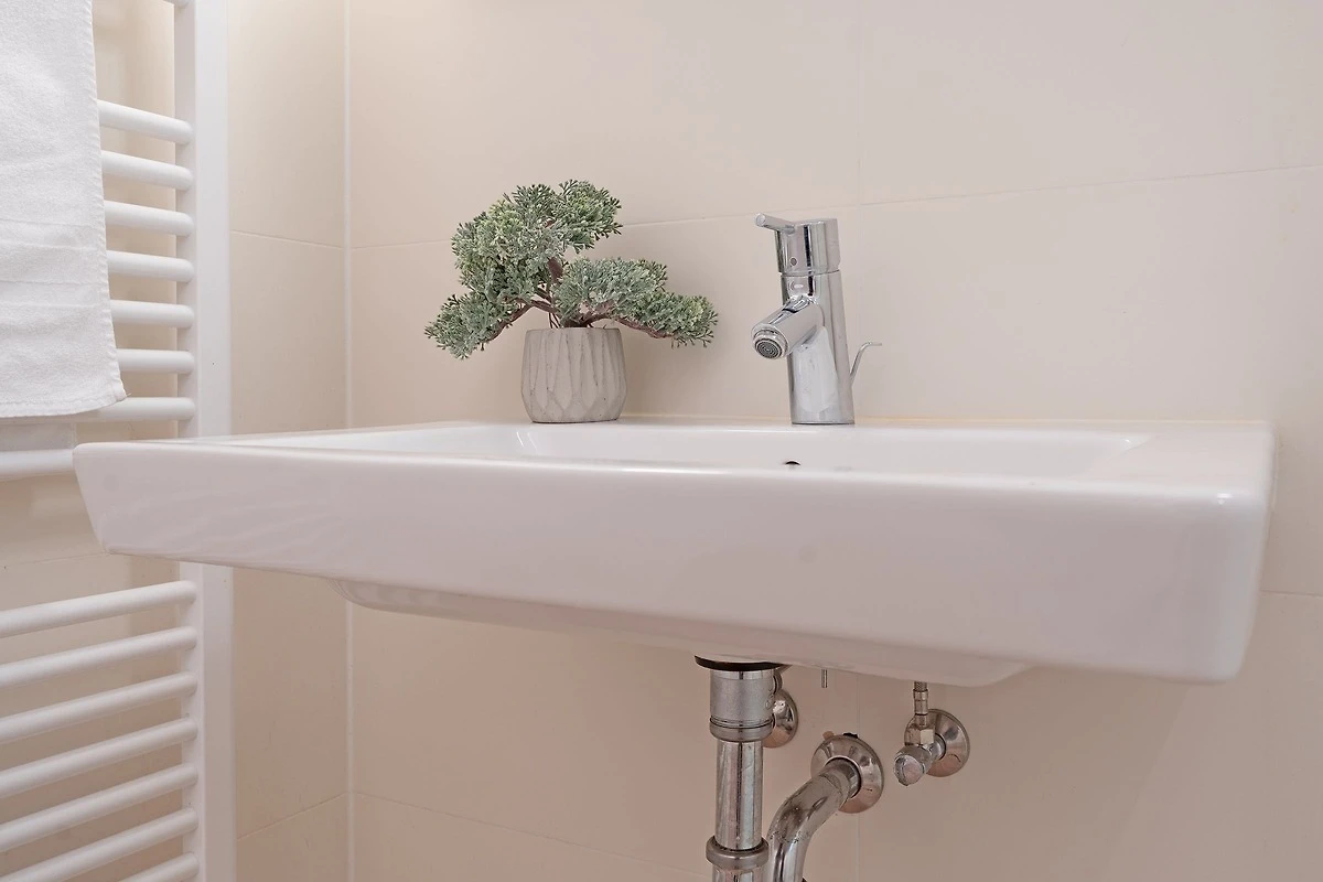 Das gepflegte Duschbad punktet mit einem Handtuchwärmer.