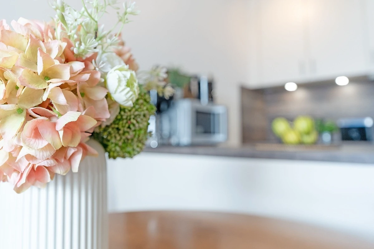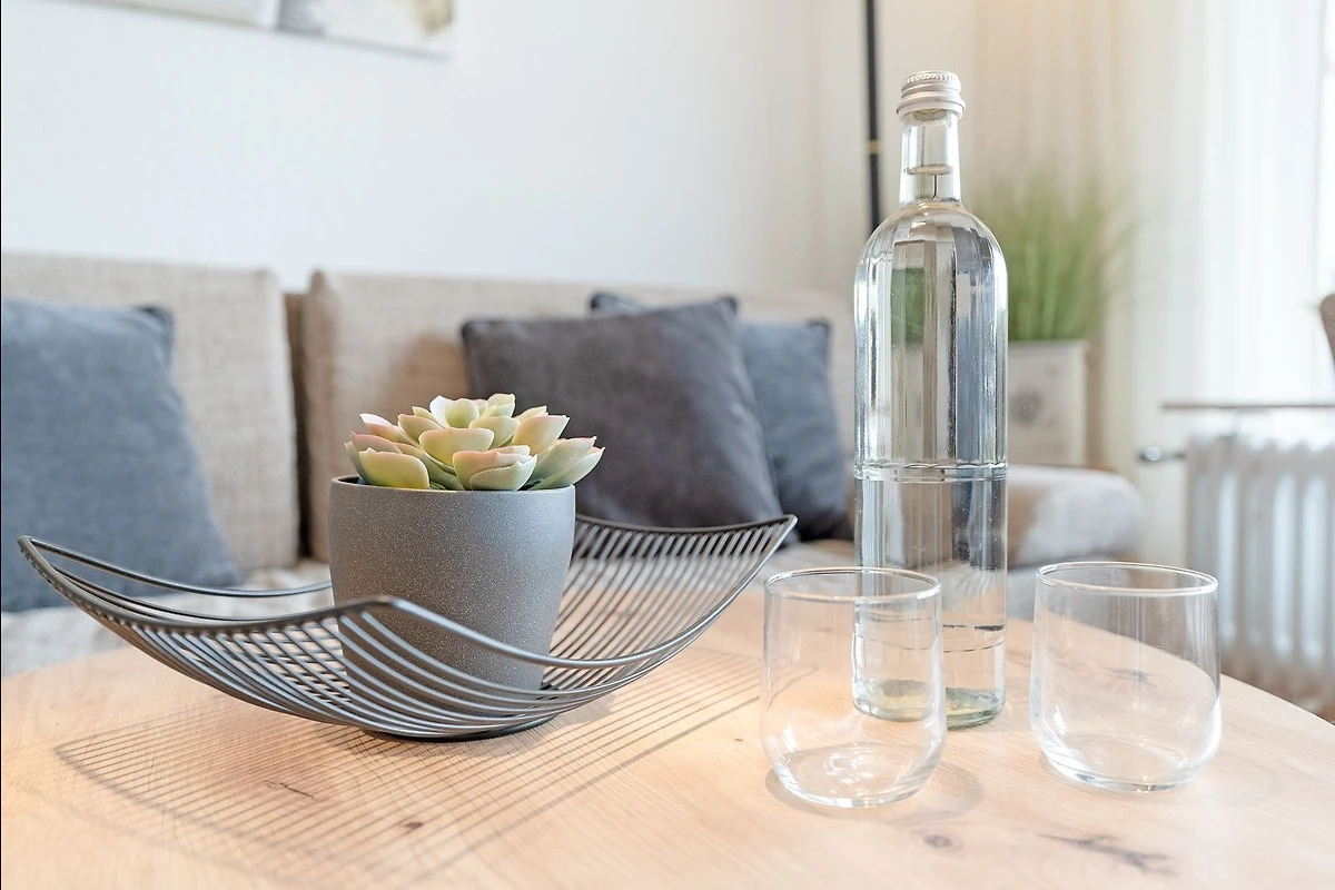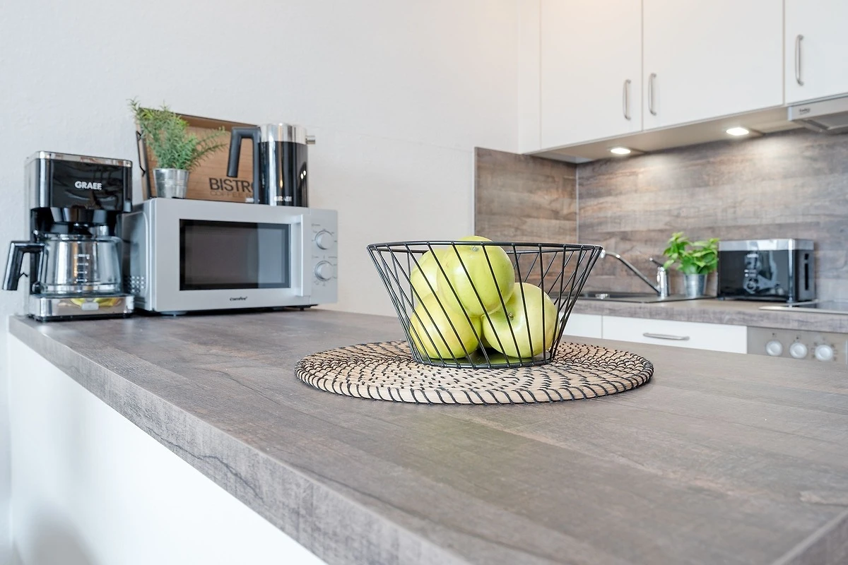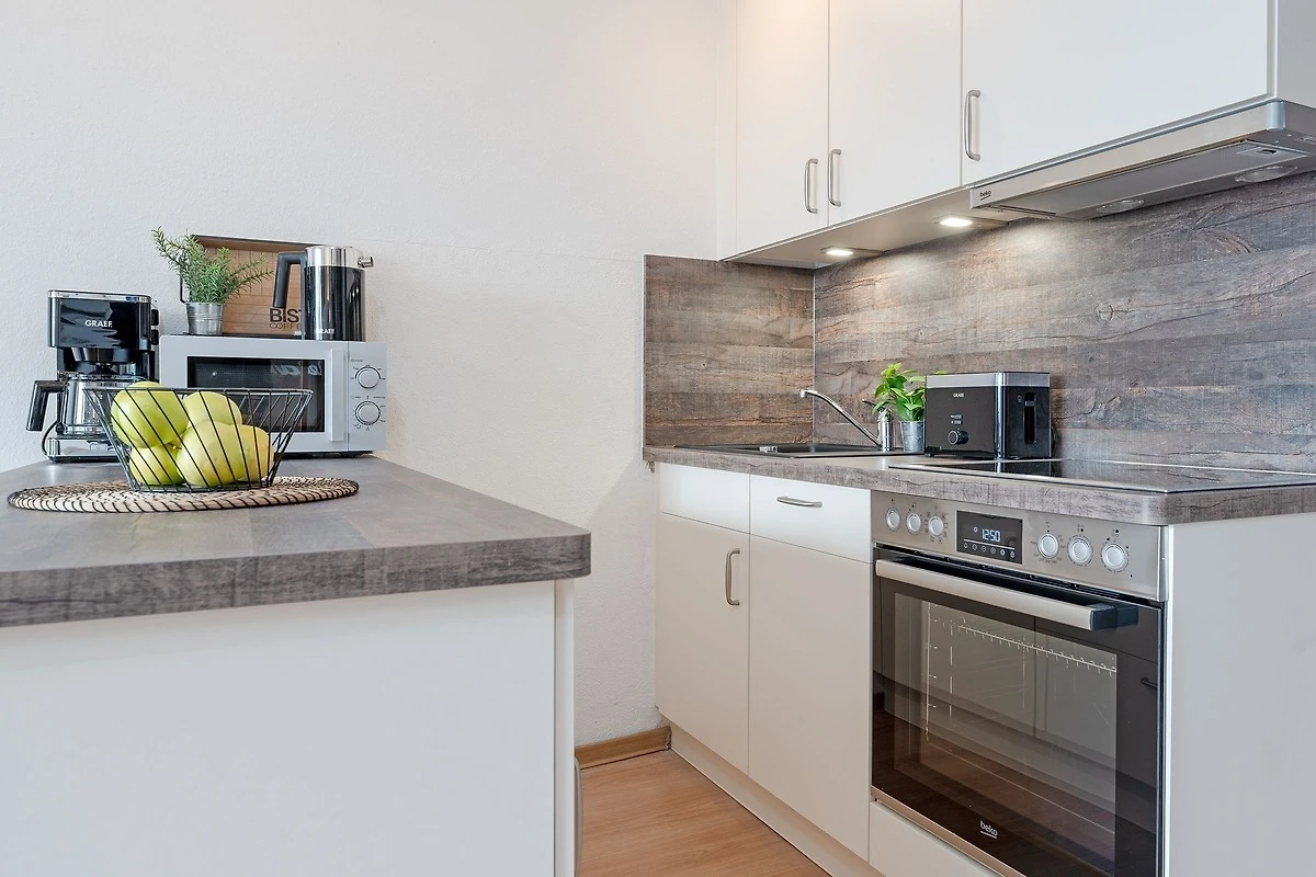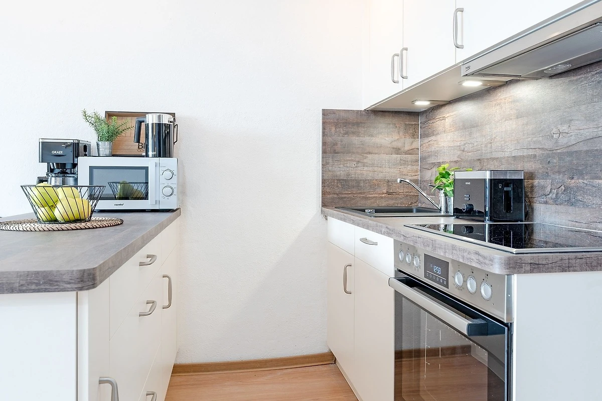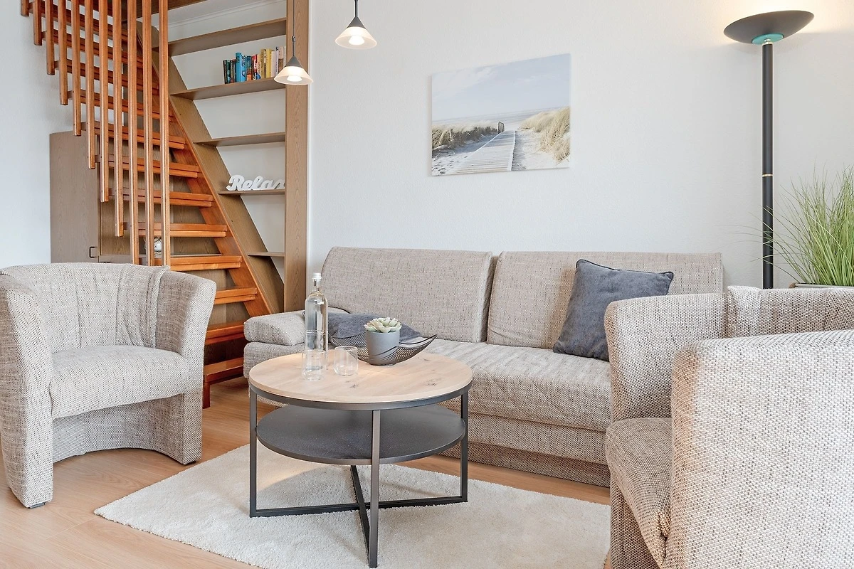 Bitte beachten Sie: Die Wohnung verfügt über eine Ebene. Der obere Bereich (Treppe im Wohnzimmer) ist nicht zugänglich.