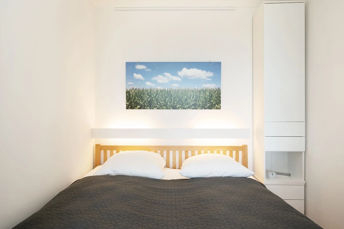 Wohn/Schlafzimmer: 1 Doppelbett (2x 90x200cm), TV, Verdunkelung: Rollo, Platz für Babybett vorhanden