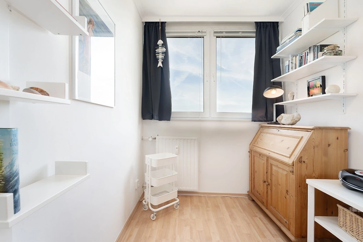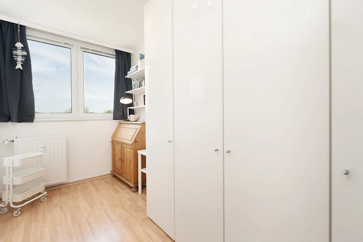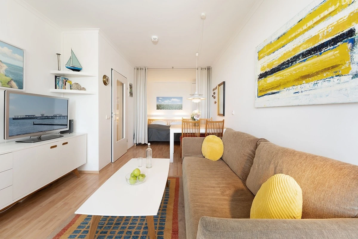 Nur 100 Meter zum Ostseestrand ... wer so nah am Meer wohnen möchte, ist in der Ferienwohnung Meerjungfrau in den Strandappartements am Leuchtturmweg genau richtig. Die Zimmer sind liebevoll eingerichtet und sorgen durch Farbakzente für gute Urlaubslaune. Entspannen Sie auf dem Sofa oder freuen Sie sich über die gute Seeluft auf dem überdachten, möblierten Balkon. Hier, oder auch am Essplatz, können Sie prima Ihre Speisen einnehmen, die offene Küche befindet sich im Flur. Im hinteren Bereich des Wohnzimmers steht ein Doppelbett (2x 90x200 cm), das durch einen Vorhang gemütlich abgeschirmt werden kann. Das Kinderzimmer ist mit einem Etagenbett (je 90x180cm) ausgestattet. Hier befindet sich auch ein Arbeitsplatz mit Sekretär, falls Sie noch etwas Arbeit dabei haben. Das gepflegte Duschbad ist innenliegend.
