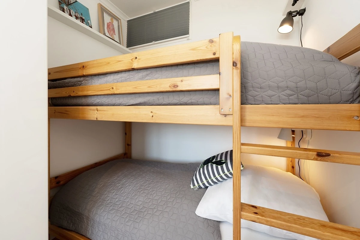 Schlafzimmer: 1 Etagenbett (je 90x180cm), Kleiderschrank, Verdunkelung: Rollo, Platz für Babybett vorhanden