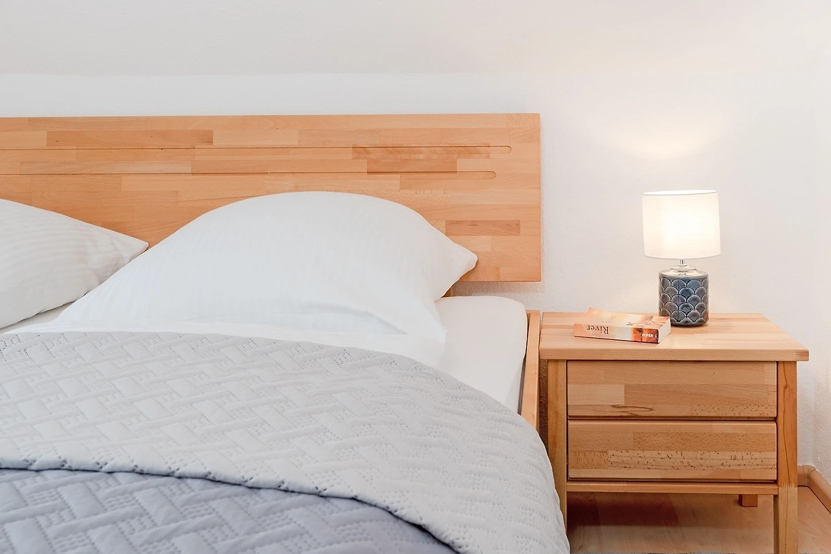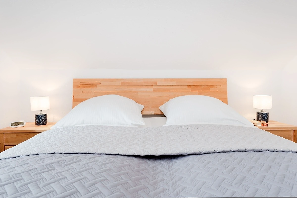 Die helle, freundliche Ferienwohnung ist modern und ansprechend eingerichtet. Sie ist in super und ruhiger Lage mit zwei Balkonen. Leider kein Sonnenschirm zum Schutz vorhanden. Auch die Vorhänge verschließen nur einen Teil des Fensters im Wohnzimmer. Die Matratzen waren für uns nicht bequem.