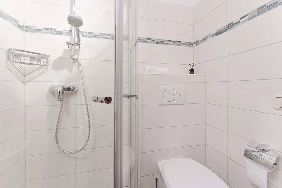 Lust auf Meer? Die Ferienwohnung Ostseerose in der Wohnanlage Strandhotel Kellenhusen ist nur rund 120 Meter vom Ostseestrand entfernt. Der helle Wohnbereich besticht durch seine grosszügige Sofalandschaft in Meeresfarben – Dachschrägen sorgen zusätzlich für Behaglichkeit. Geniessen Sie von morgens bis abends die gute Meeresluft auf einem der beiden Balkone, einer mit Ost- und einer mit Westausrichtung. Für die Selbstverpflegung steht Ihnen eine offene moderne Einbauküche mit Kaffeemaschine und Geschirrspüler zur Verfügung. Angenehme Träume verspricht das bequeme Doppelbett in moderner Holzoptik (2x 90x200 cm) im separaten Schlafzimmer. Das innenliegende Duschbad mit Handtuchwärmer ist hell gefliest.