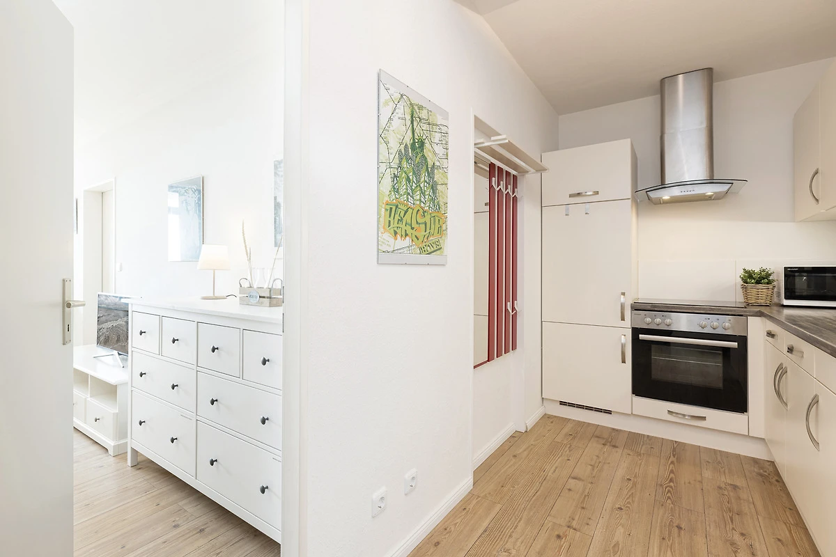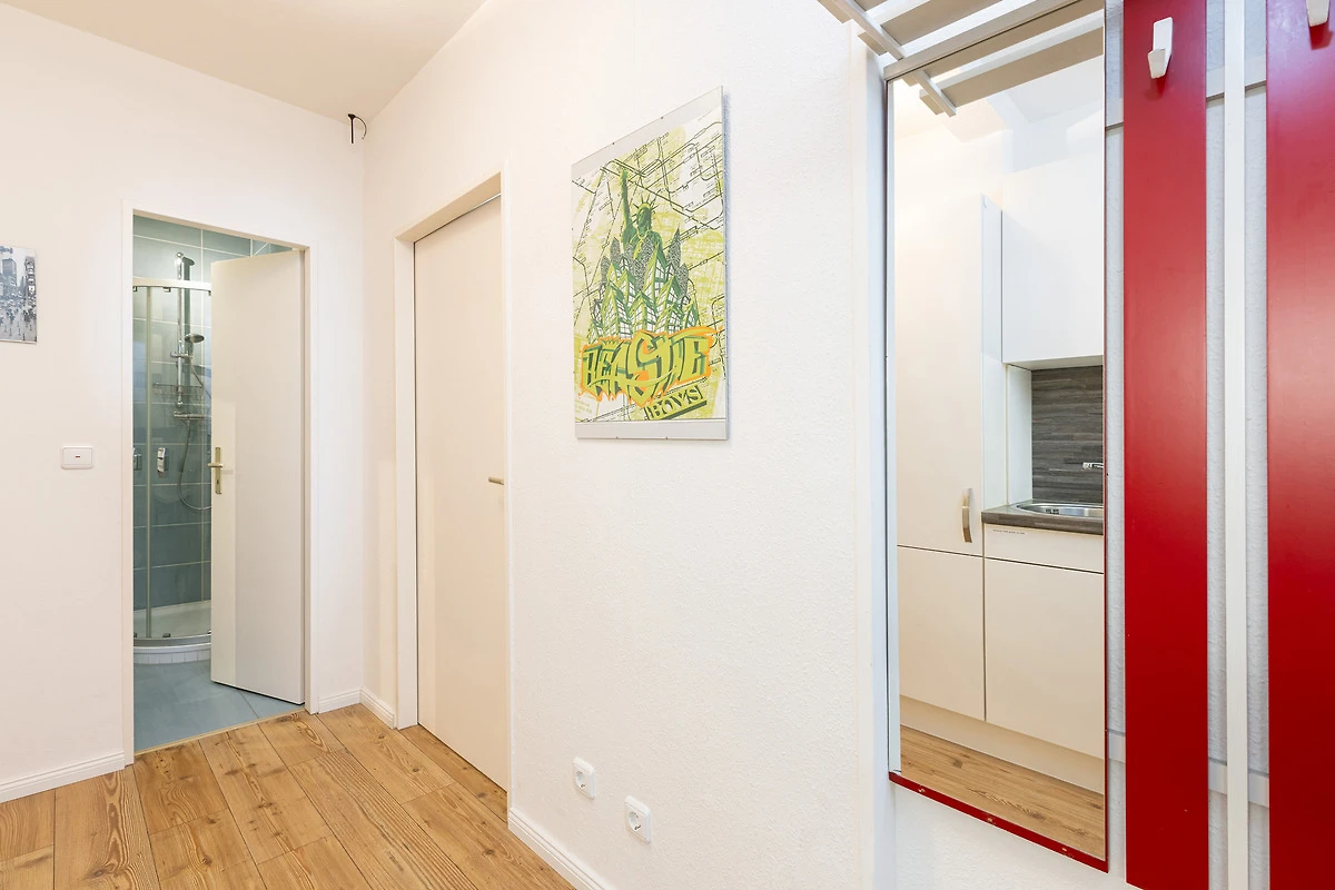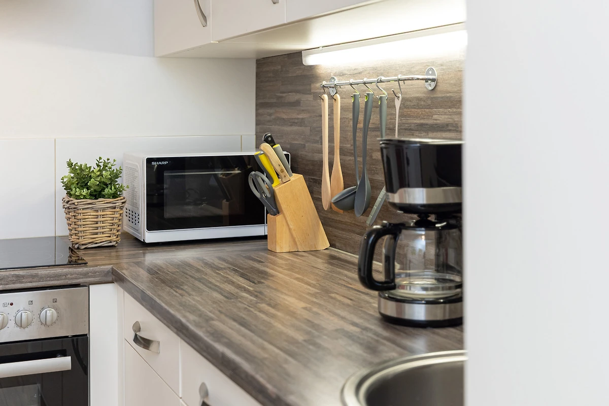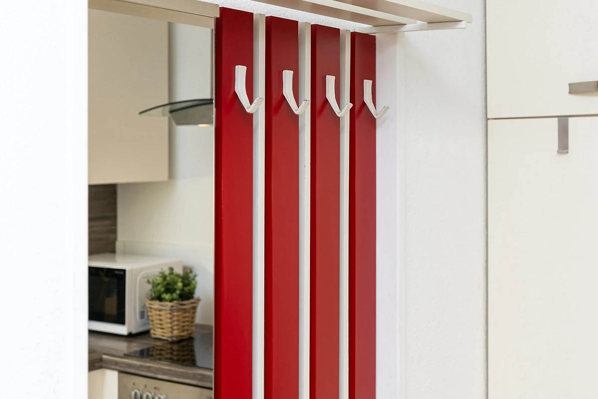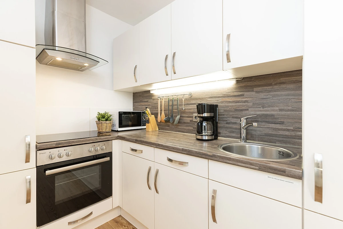 Im kombinierten Wohn-/Schlafraum befindet sich ein Schlafsofa für 2 Personen (140x200 cm), eine Sofaecke mit TV und eine Essecke mit Blick aufs Meer. Am Terrassenfenster als Schiebetür lädt ein 6 m² grosser, nach Südwesten ausgerichteter Balkon zum Sonnenbaden oder zum Essen mit Meerblick ein. Ein Flachbildfernseher und ein CD/iPod/mp3-Player mit Radio sind vorhanden. In der Küche befindet sich die übliche Standardausstattung wie Kaffeemaschine, Mikrowelle, Toaster, etc. Im Schlafraum finden Sie ein bequemes Doppelbett (180x200 cm), Kleiderschrank sowie Kommode. Das moderne Bad ist mit einer Dusche, einem Handtuchheizkörper und einem deckenhohen, beleuchteten Wandspiegel ausgestattet. Das Wohn- und Schlafzimmer haben einen Laminatfussboden.