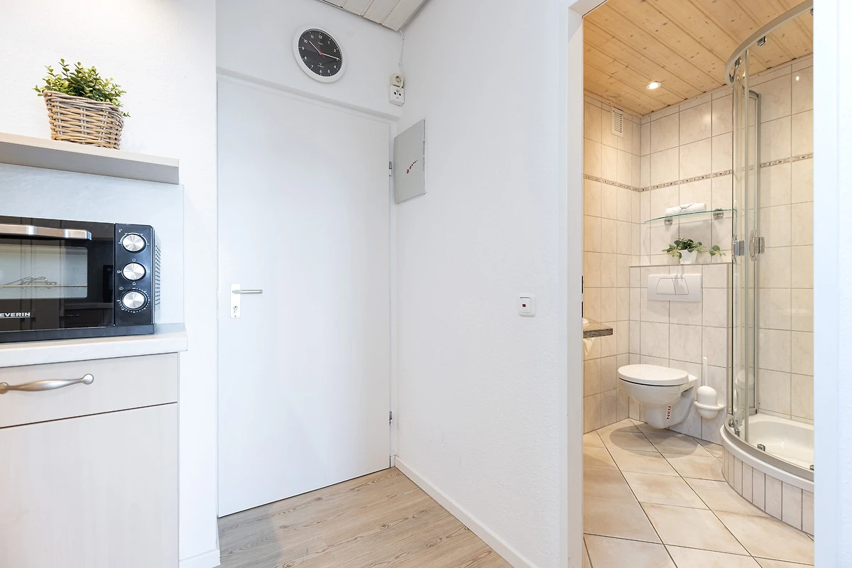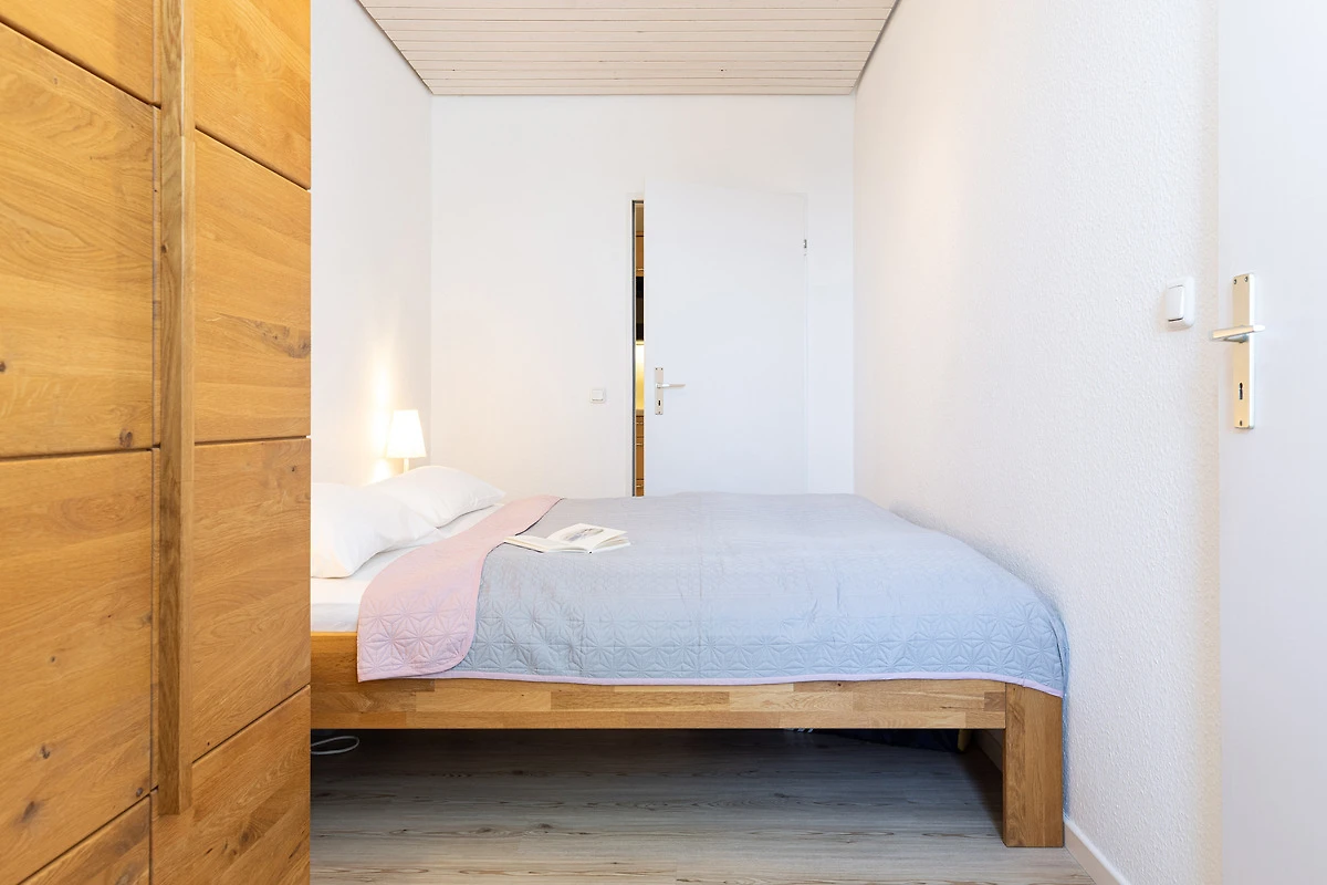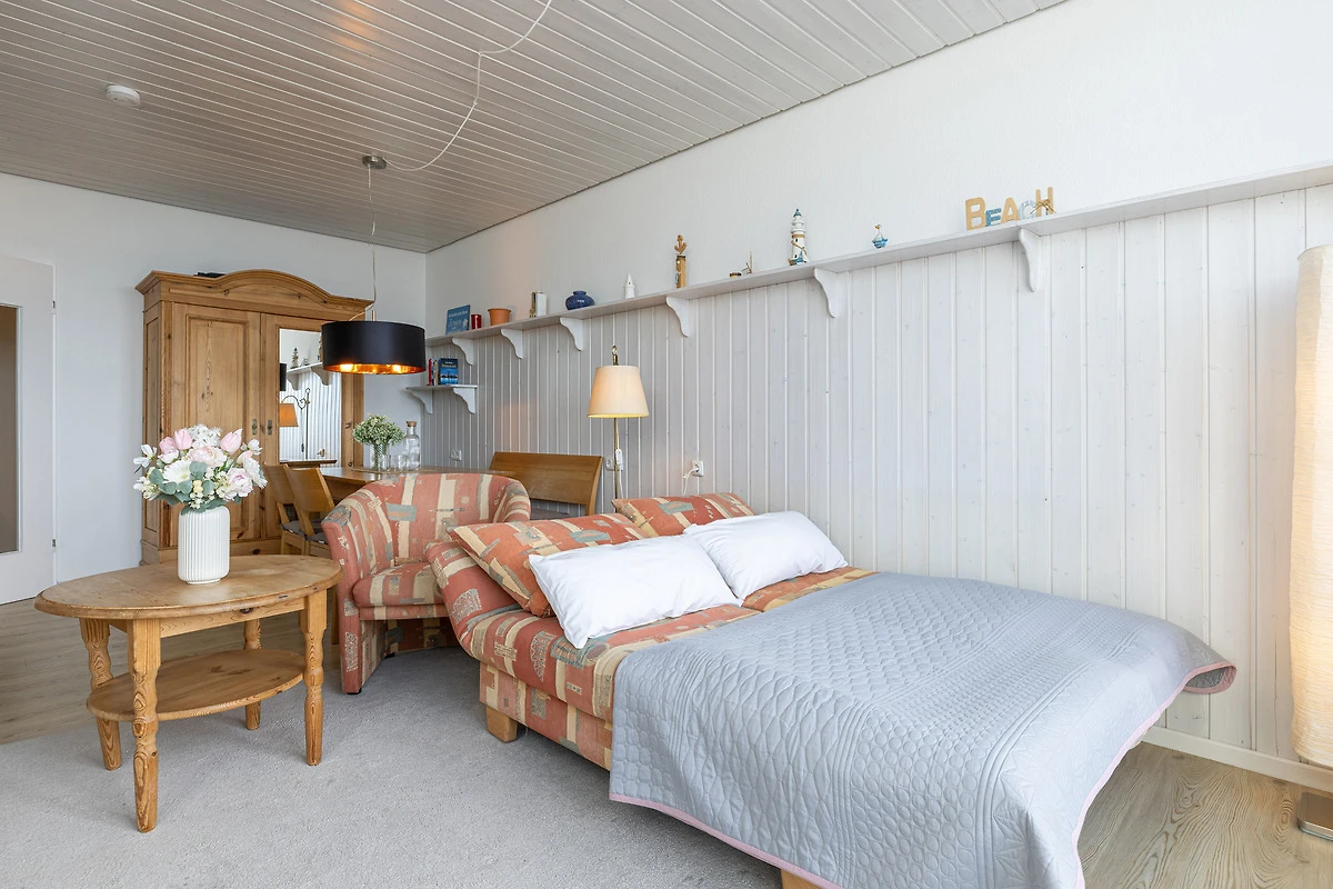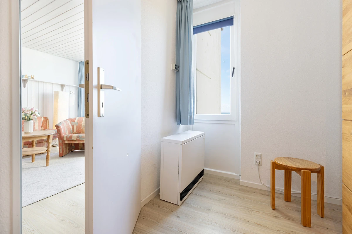Herzlich willkommen im Urlaub! Das Wohnzimmer mit grosser Fensterfront und möbliertem Südbalkon bilden die Highlights dieses Apartments. Geniessen Sie den tollen Blick aufs Meer und lassen Sie den Alltag hinter sich. Morgens haben Sie die Möglichkeit, gemütlich zu frühstücken und dabei die Kutter und Segelboote zu beobachten, die langsam die Hafeneinfahrt aus- und einfahren – das ist Entschleunigung pur. Im Wohnzimmer befindet sich zudem der Essbereich. Zum Fenster hin lädt die gemütliche Sitzgruppe mit Schlafsofa zum Entspannen, Lesen und Fernsehen ein. Das Schlafsofa lässt sich zu einem vollwertigen Doppelbett ausziehen. Die gut ausgestattete Küche mit Geschirrspüler und weiteren Extras ist ideal, um Ihre Lieblingsspeisen zuzubereiten. Das Schlafzimmer ist möbliert mit einem Doppelbett und einem grossen Kleiderschrank. Das Duschbad hat eine Fussbodenheizung und einen Handtuchwärmer.