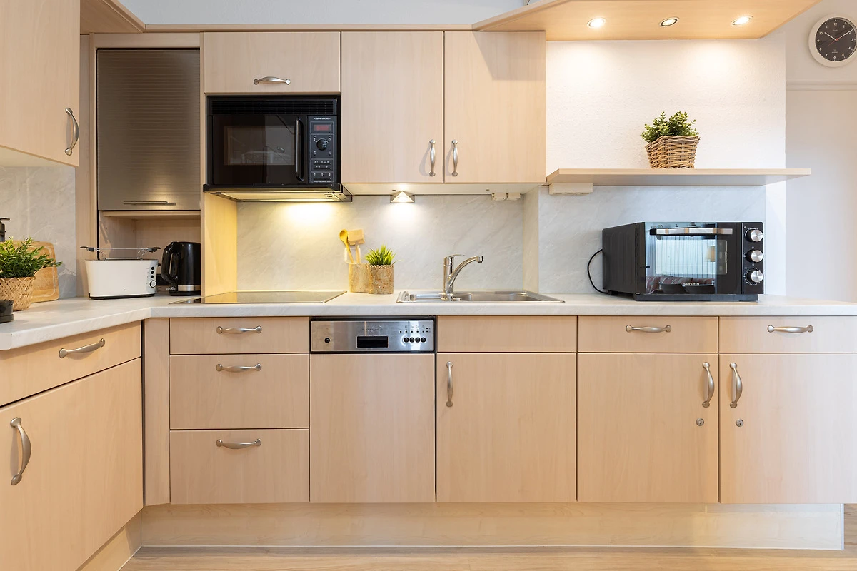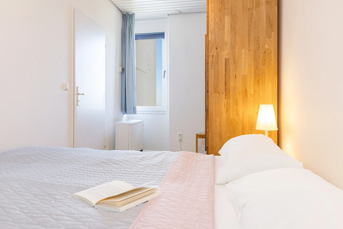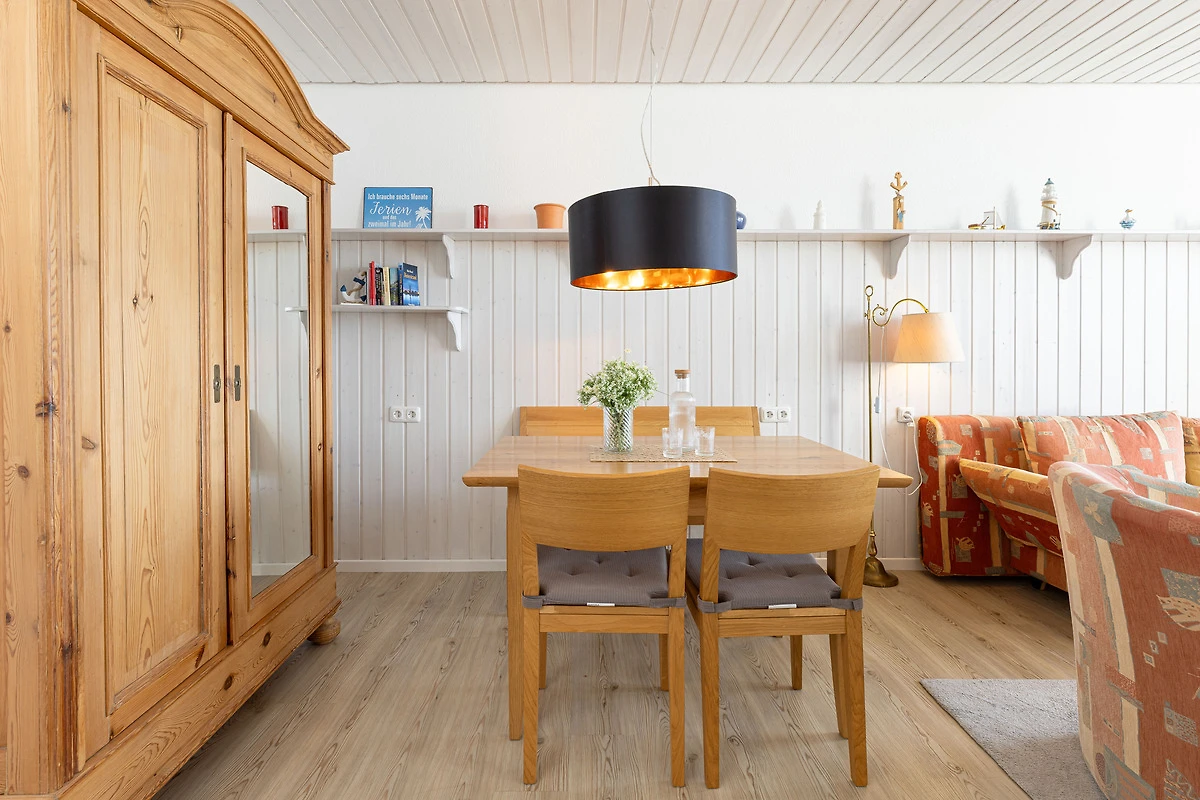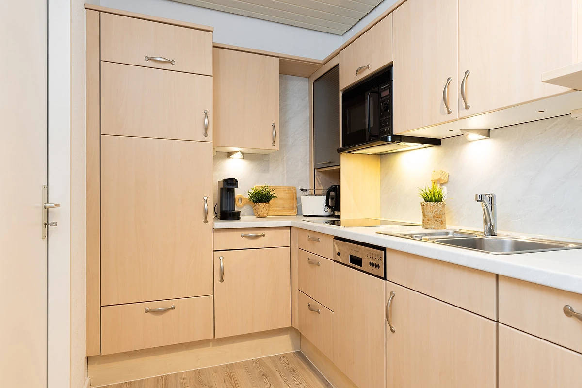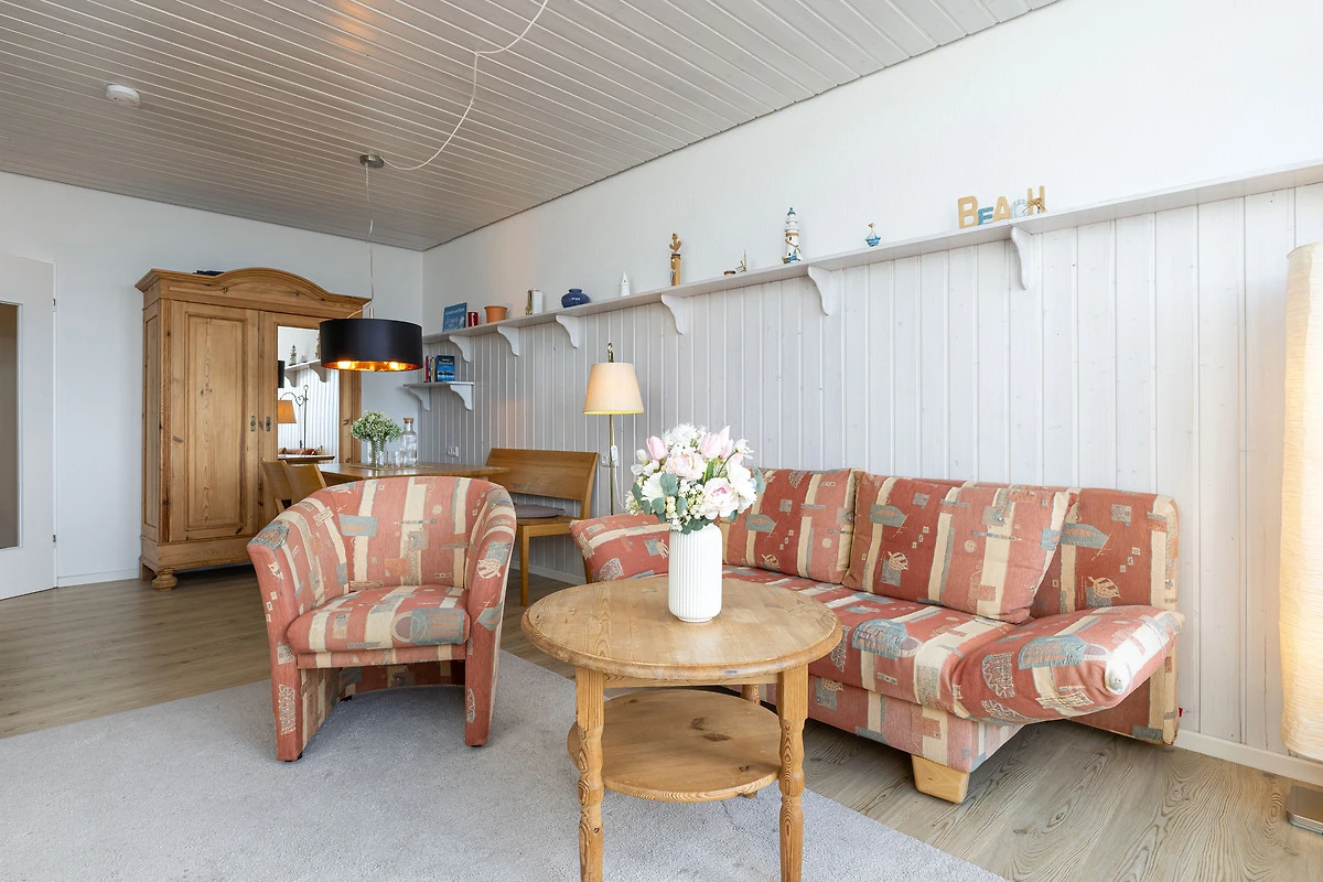 Herzlich willkommen im Urlaub! Das Wohnzimmer mit grosser Fensterfront und möbliertem Südbalkon bilden die Highlights dieses Apartments. Geniessen Sie den tollen Blick aufs Meer und lassen Sie den Alltag hinter sich. Morgens haben Sie die Möglichkeit, gemütlich zu frühstücken und dabei die Kutter und Segelboote zu beobachten, die langsam die Hafeneinfahrt aus- und einfahren – das ist Entschleunigung pur. Im Wohnzimmer befindet sich zudem der Essbereich. Zum Fenster hin lädt die gemütliche Sitzgruppe mit Schlafsofa zum Entspannen, Lesen und Fernsehen ein. Das Schlafsofa lässt sich zu einem vollwertigen Doppelbett ausziehen. Die gut ausgestattete Küche mit Geschirrspüler und weiteren Extras ist ideal, um Ihre Lieblingsspeisen zuzubereiten. Das Schlafzimmer ist möbliert mit einem Doppelbett und einem grossen Kleiderschrank. Das Duschbad hat eine Fussbodenheizung und einen Handtuchwärmer.