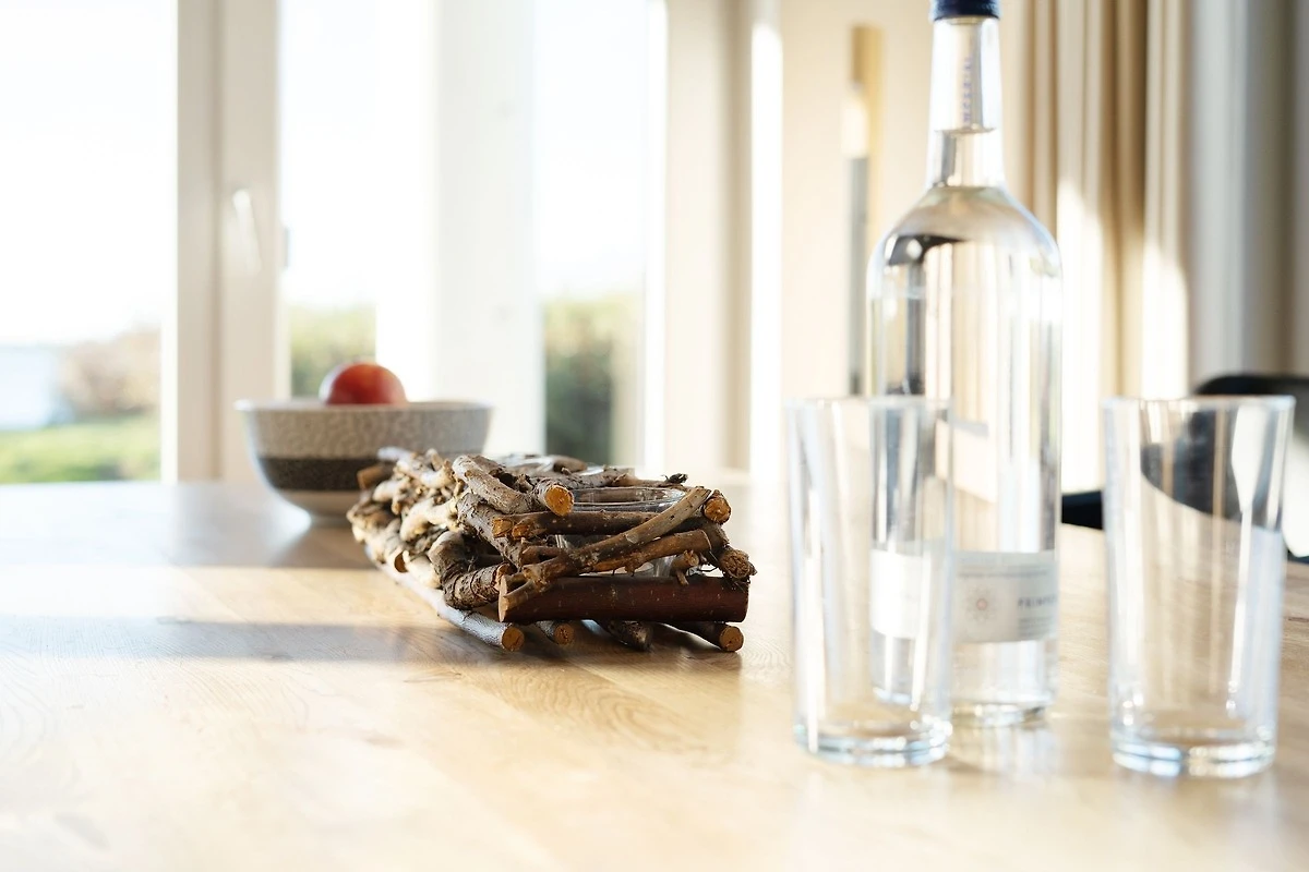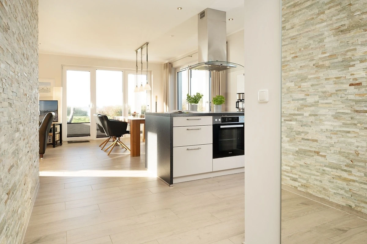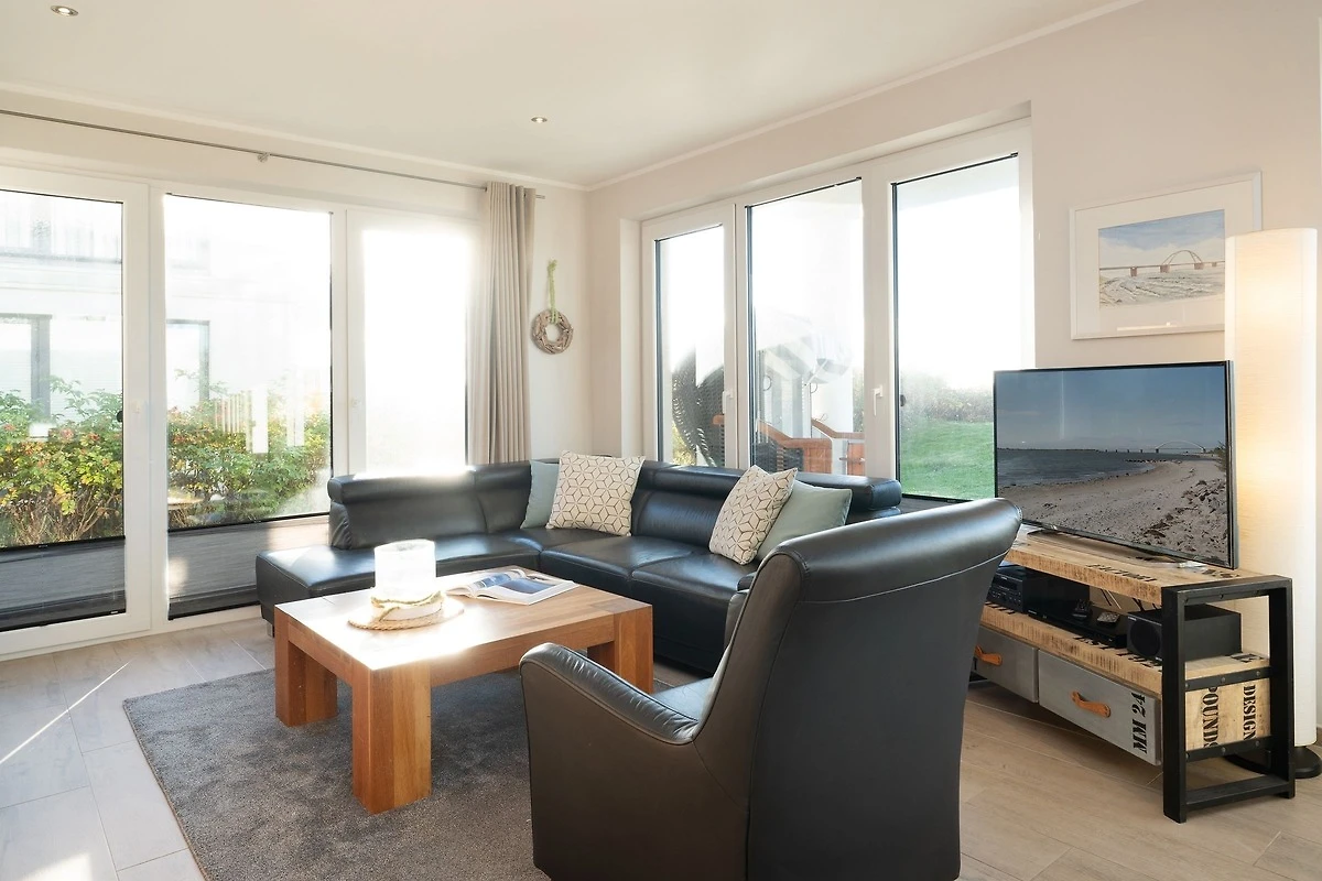 Die gehobene Ausstattung des Objekts wird Sie sofort begeistern. Der helle Wohnbereich bietet einen tollen Blick auf die Ostsee. Gemütliche Ledermöbel laden hier zum Verweilen ein. Das Highlight ist sicher die grosse teilweise überdachte Terrasse. Auch von hier haben Sie einen tollen Blick auf die Ostsee und das Wahrzeichen der Insel Fehmarn: die Fehmarnsundbrücke. Hier können Sie perfekt bei einem guten Frühstück in den Tag starten, die Mittagsstunden auf der Sonnenliege verbringen oder abends den Sonnenuntergang bewundern. Die zum Wohnbereich hin offene Küche mit angrenzendem Essbereich lässt durch ihre sehr gute Ausstattung beim Kochen keine Wünsche offen. Die beiden modern eingerichteten Schlafzimmer, eins mit einem Doppelbett und TV-Gerät, das andere mit zwei Einzelbetten, bieten den entsprechenden Wohlfühlfaktor zum Erholen nach ereignisreichen Urlaubstagen. Das grosszügige Bad ist mit einer bodengleichen Dusche ausgestattet. Ein grosses Fenster sorgt für Tageslicht und damit einen sonnigen Start in den Tag. Eine kleine Sauna steht Ihnen ebenfalls in der Unterkunft zur Verfügung. Die Wohnung ist mit Fussbodenheizung ausgestattet und komplett gefliest.