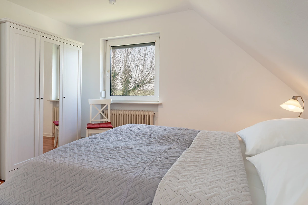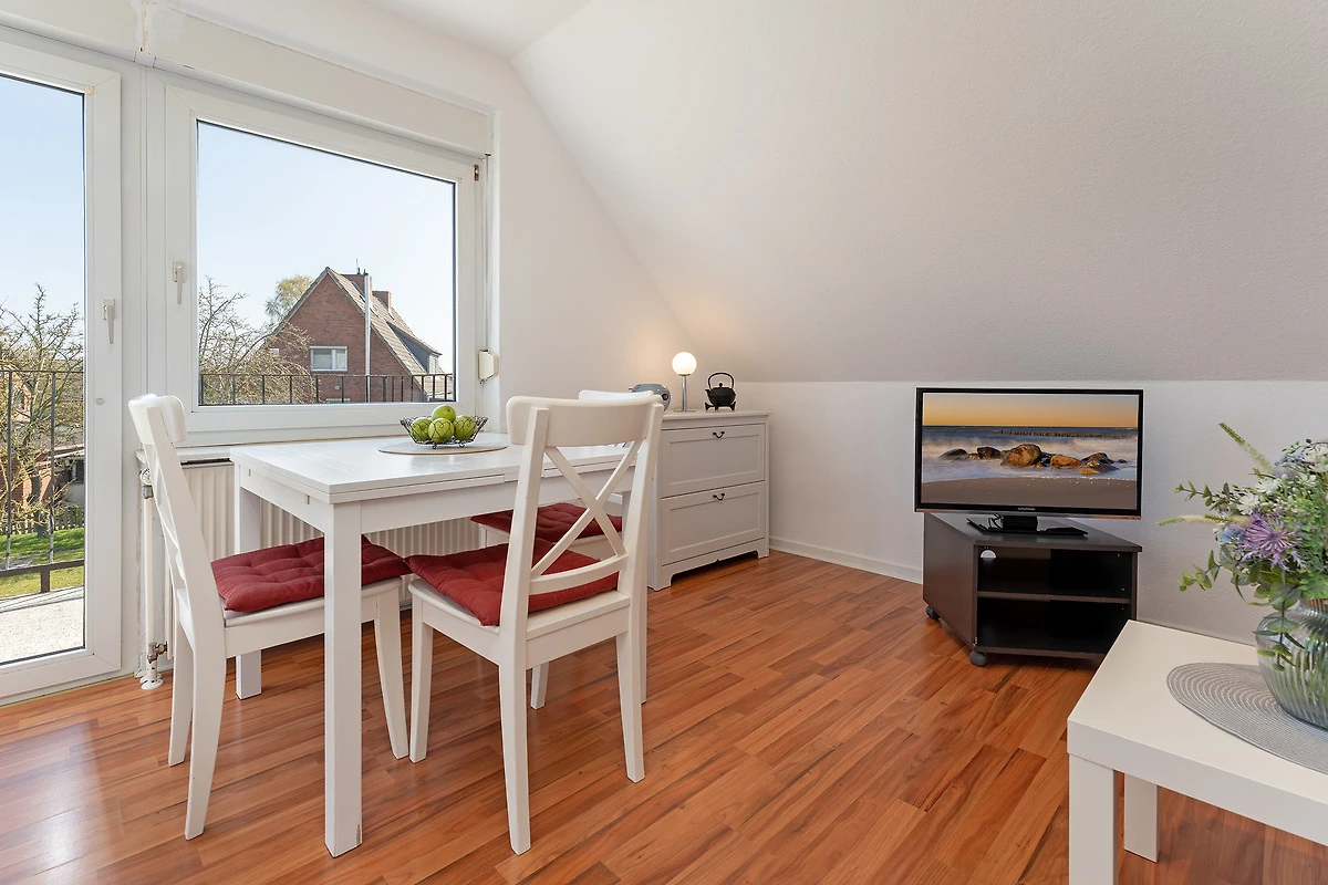 Die 3-Zimmer-Ferienwohnung Feldblick im 1. Stock (Dachgeschoss) mit Balkon bietet mit ca. 65 m² Wohnfläche Platz für bis zu 4 Personen. Das Appartementhaus liegt in Feldrandlage am Westrand der Gemeinde Puttgarden in Richtung Naturschutzgebiet Grüner Brink.