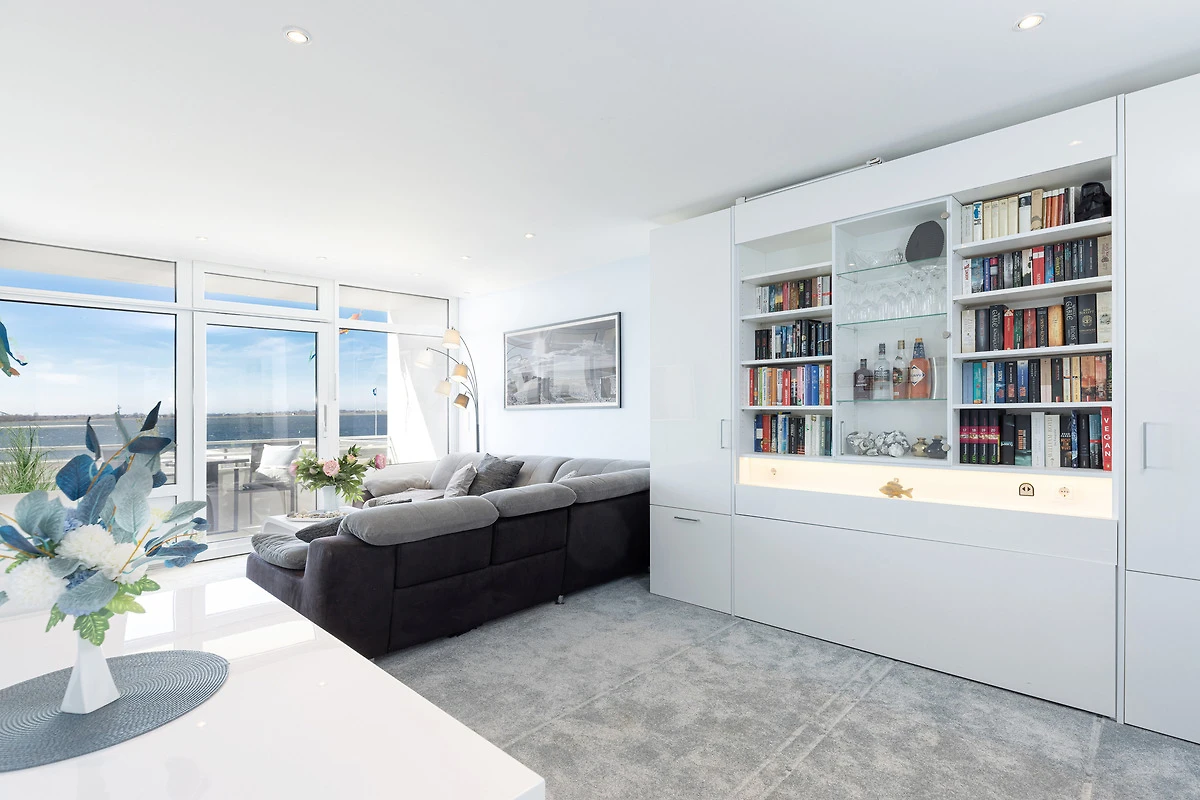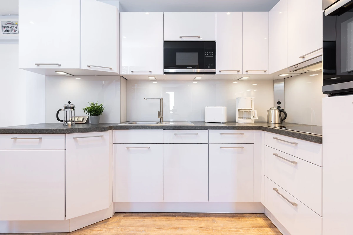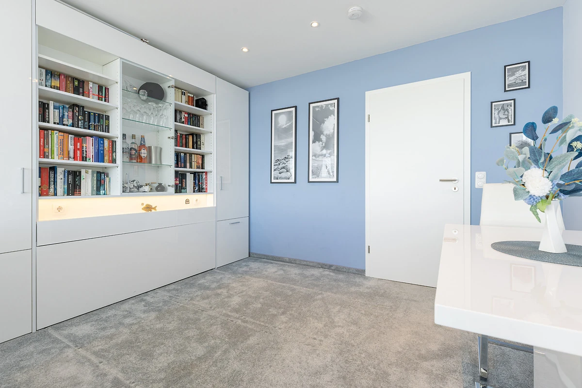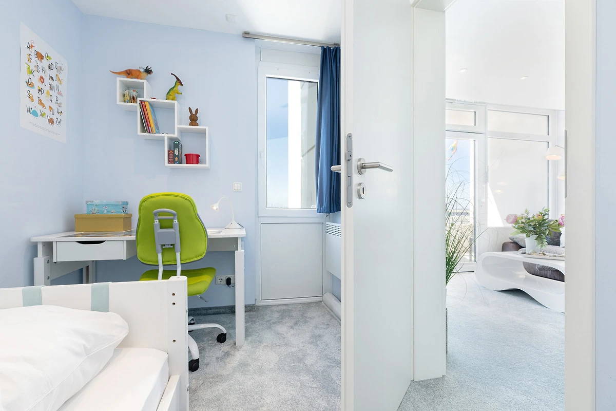 Der Blick vom Balkon und aus den Zimmern heraus ist herrlich: Sie schauen über die davor liegenden Bungalowdächer hinweg direkt aufs Meer in rund 100 Metern Entfernung. Beobachten Sie die ein- und ausfahrenden Schiffe und Boote oder das gegenüberliegende Surf- und Kite-Gebiet. Im Hintergrund ist die legendäre Fehmarnsundbrücke zu sehen. Machen Sie es sich gemütlich im Wohnschlafbereich. Das Doppelbett ist ein elektronisches Schrankbett, das tagsüber charmant verschwindet. Es fährt per Knopfdruck ein und aus. Auch die gemütliche Couch hat eine Doppelbett- oder Fernsehposition-Funktion (nach vorne hin ausklappbar). Die Küche umfasst sämtliche Annehmlichkeiten: Herd mit Cerankochfeld, Backofen, Kühlschrank mit kleinem Eisfach, Mikrowelle, Spülmaschine, Waschmaschine/Trockner (Waschtrockner), Kaffeemaschine, Wasserkocher, Toaster, Sandwich Maker sowie Raclette. Geniessen Sie Ihre Mahlzeiten am Esstisch oder auf dem Balkon. Im Kinderschlafzimmer befindet sich ein gemütliches Einzelbett (ca. 90x200 cm) sowie ein Schreibtisch. Im modernen Duschbad gibt es eine Fussbodenheizung und eine grosse Handtuchhalterheizung. Für ein angenehmes Urlaubserlebnis sorgt ein Fliegengitter vor dem Schlafzimmerfenster und der Balkontür.