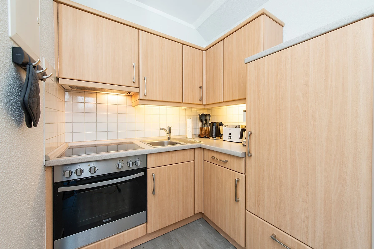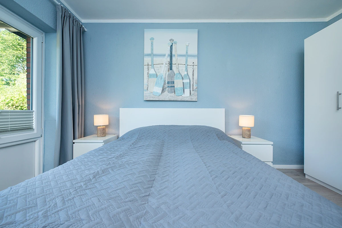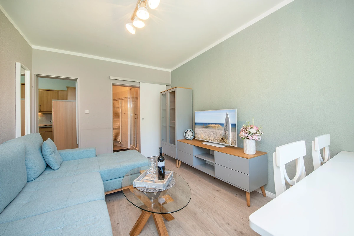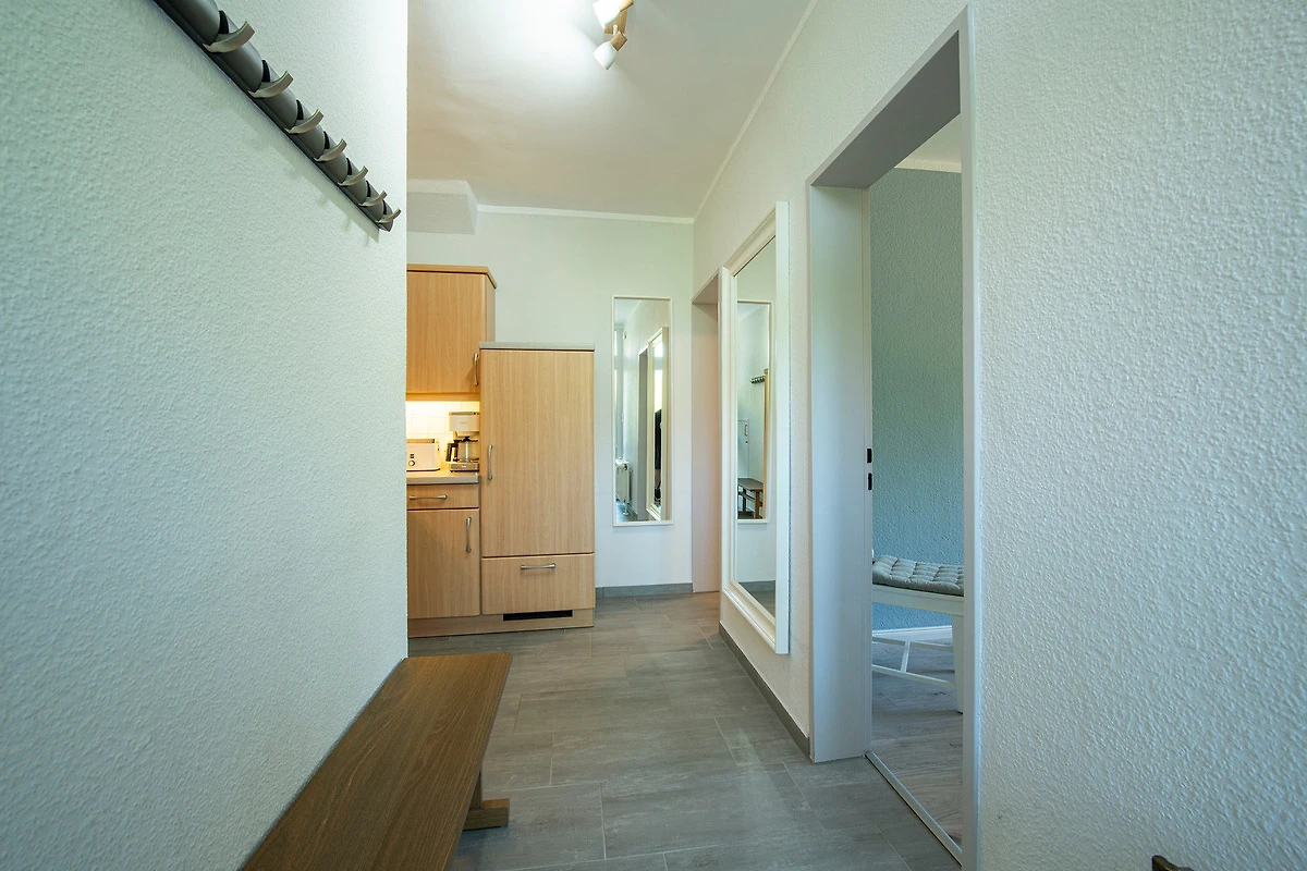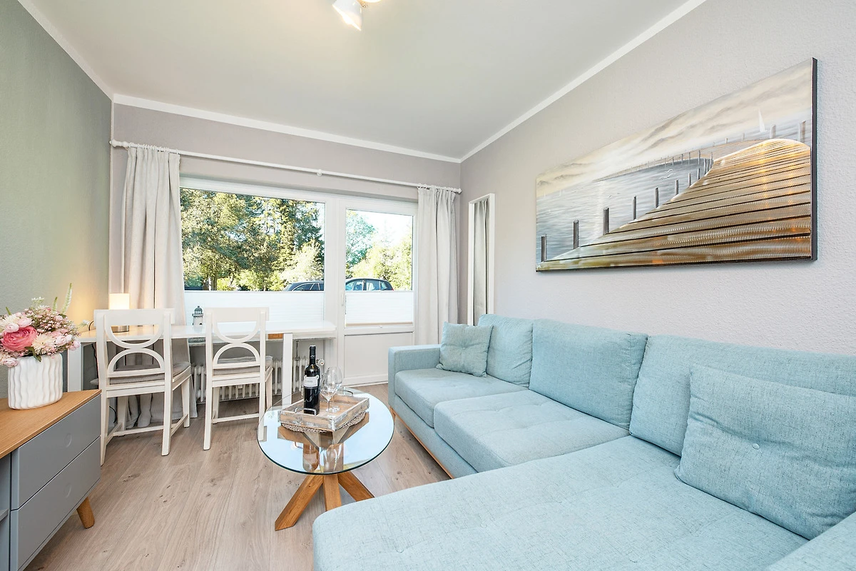 Herzlich Willkommen im Urlaub! Die liebevoll eingerichtete Wohnung wird Sie begeistern. Der schicke Wohnbereich lädt zum Entspannen ein. Machen Sie es sich gemütlich vor dem TV-Gerät - oder geniessen Sie im möblierten Gemeinschaftsgarten die gute Seeluft. Dazu hibt es einen schönen Blick ins Grüne. Der Flur- und Küchenbereich ist mit einer praktischen Einbauküche ausgestattet. Im Schlafzimmer befindet sich ein bequemes Doppelbett (160x200 cm, durchgehende Matratze), in dem Sie sicher von Ihren Urlaubstagen träumen werden. Das moderne Badezimmer ist mit einer grossen Dusche und einem Handtuchwärmer ausgestattet. Der Fussboden ist mit Laminat und Fliesen ausgelegt. Die ruhige und idyllische aber dennoch zentrale Lage lädt zum Abschalten und Entspannen ein. Der weite Garten sowie die angrenzenden Wanderwege bringen einem die Natur nahe.